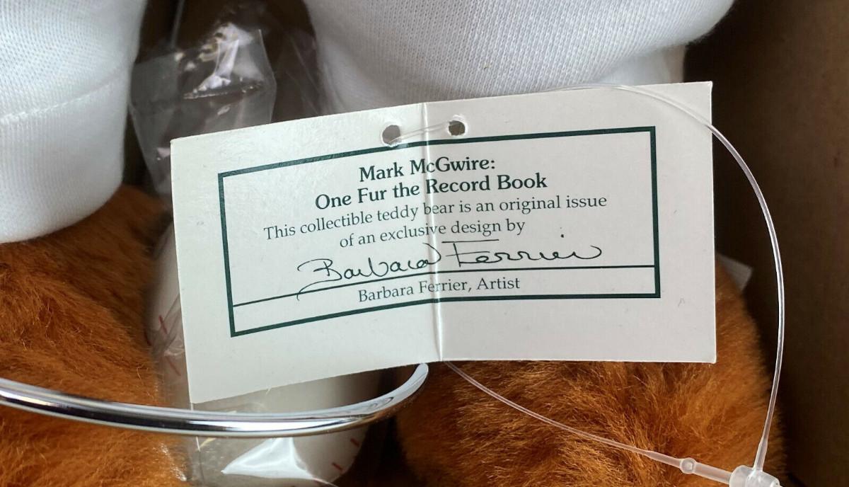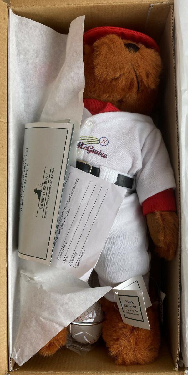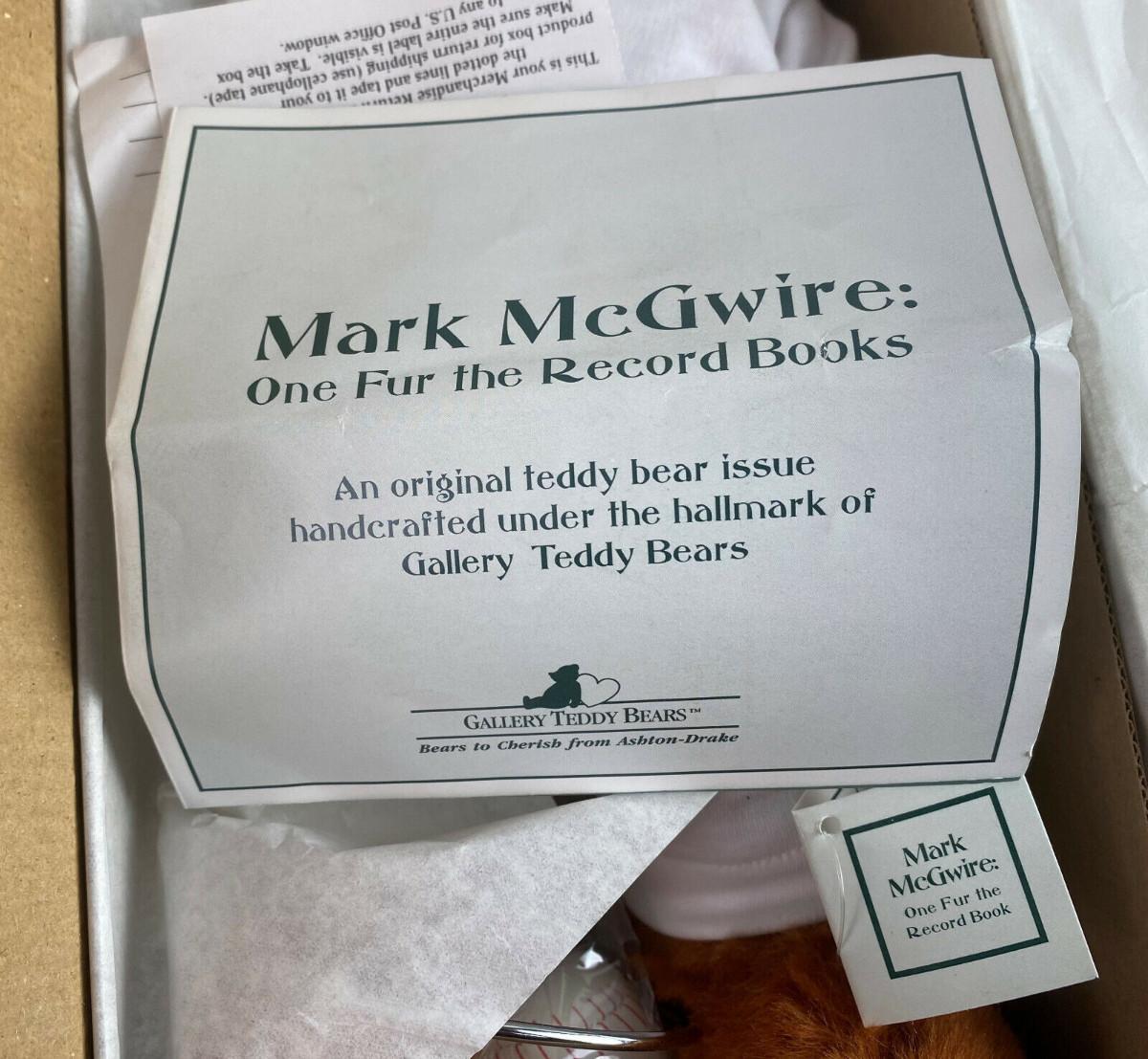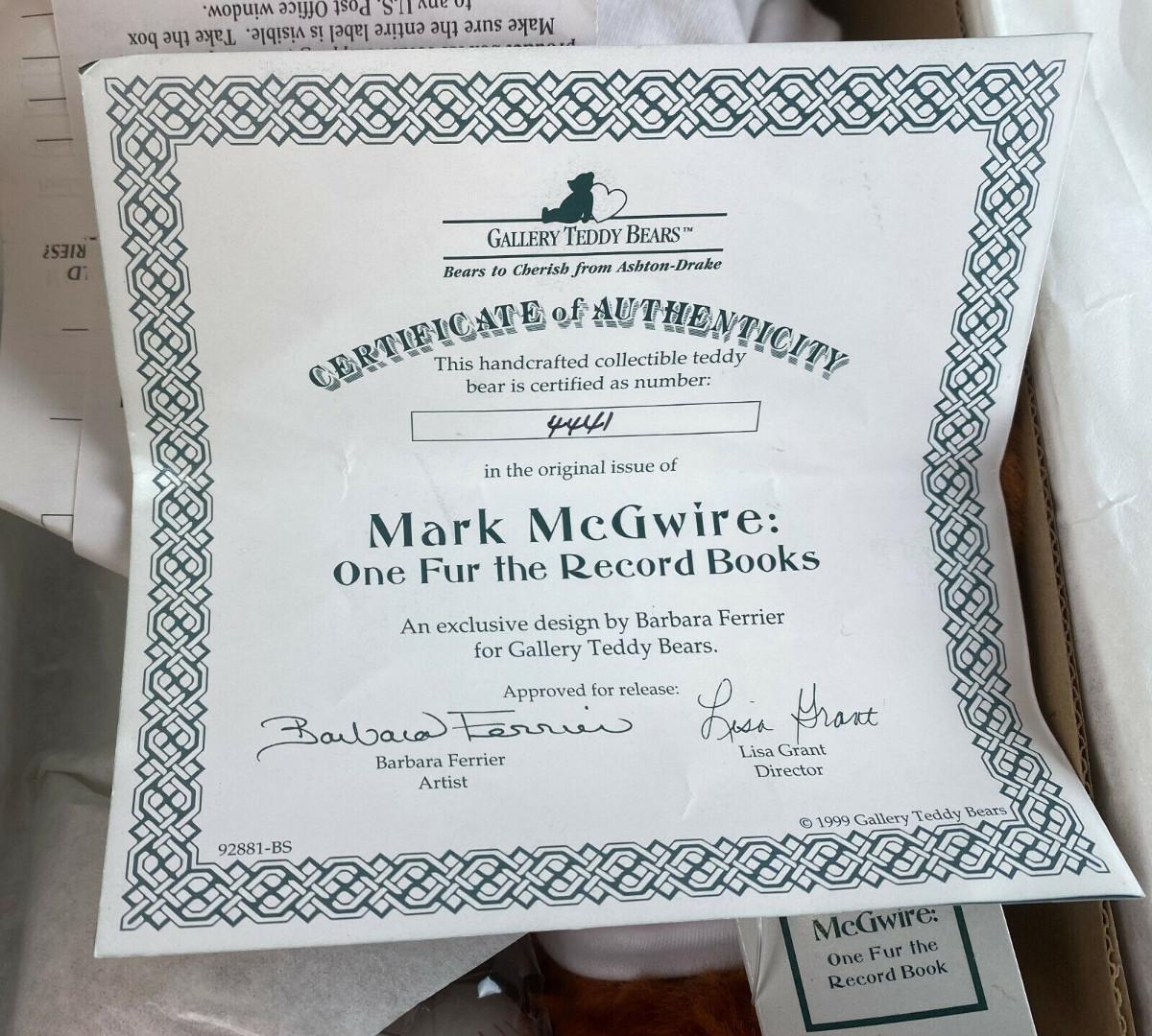 New in the box here is Mark McGwire 'One Fur the Record Books' handcrafted Gallery Commemorative Teddy Bear..13" tall...exclusive design by Barbara Ferrier...for the Ashton-Drake Galleries...Limited edition #4441...COA...Famed Major League Baseball First Baseman..Player and Coach....