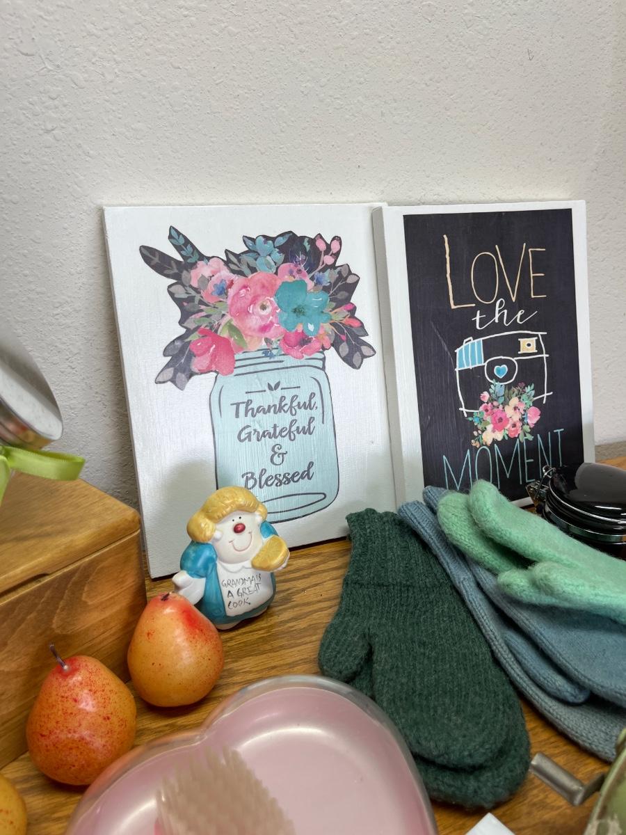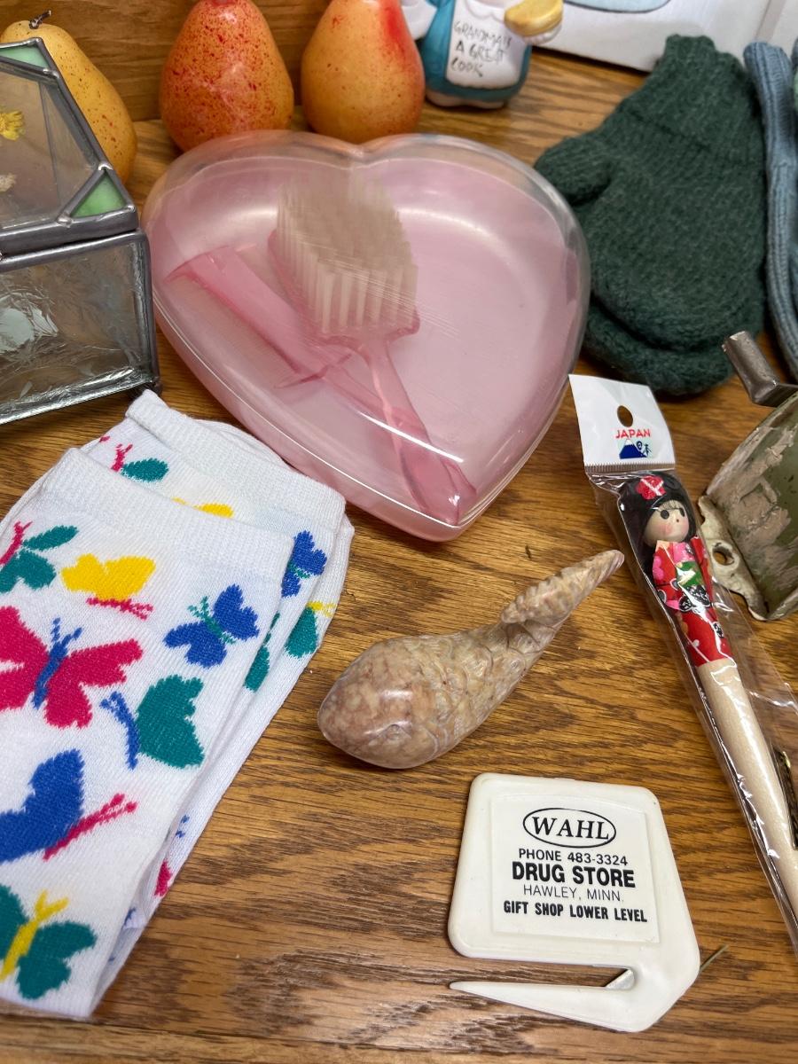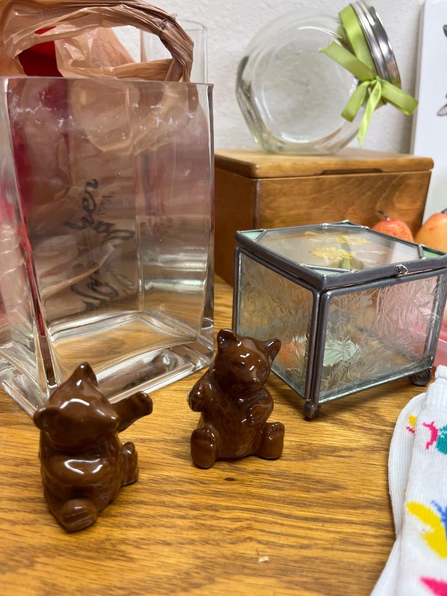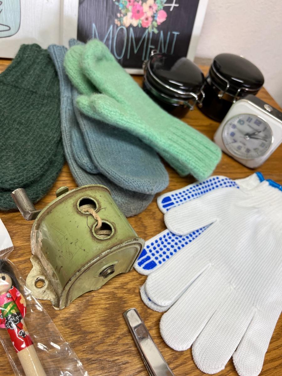 73- Vintage clothesline, gloves, Napco bears, pics