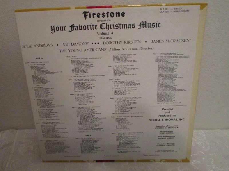 Firestone Presents Your Favorite Christmas Music Volume 4 SLP 7011 Stereo 1965 with Julie Andrews, Vic Damone; Dorothy Kirsten, James McCracken; and The Young Americans with the Fireston Orchestra conducted by Irwin Kostal; Collectors album, Custom Recording Record looks NEW