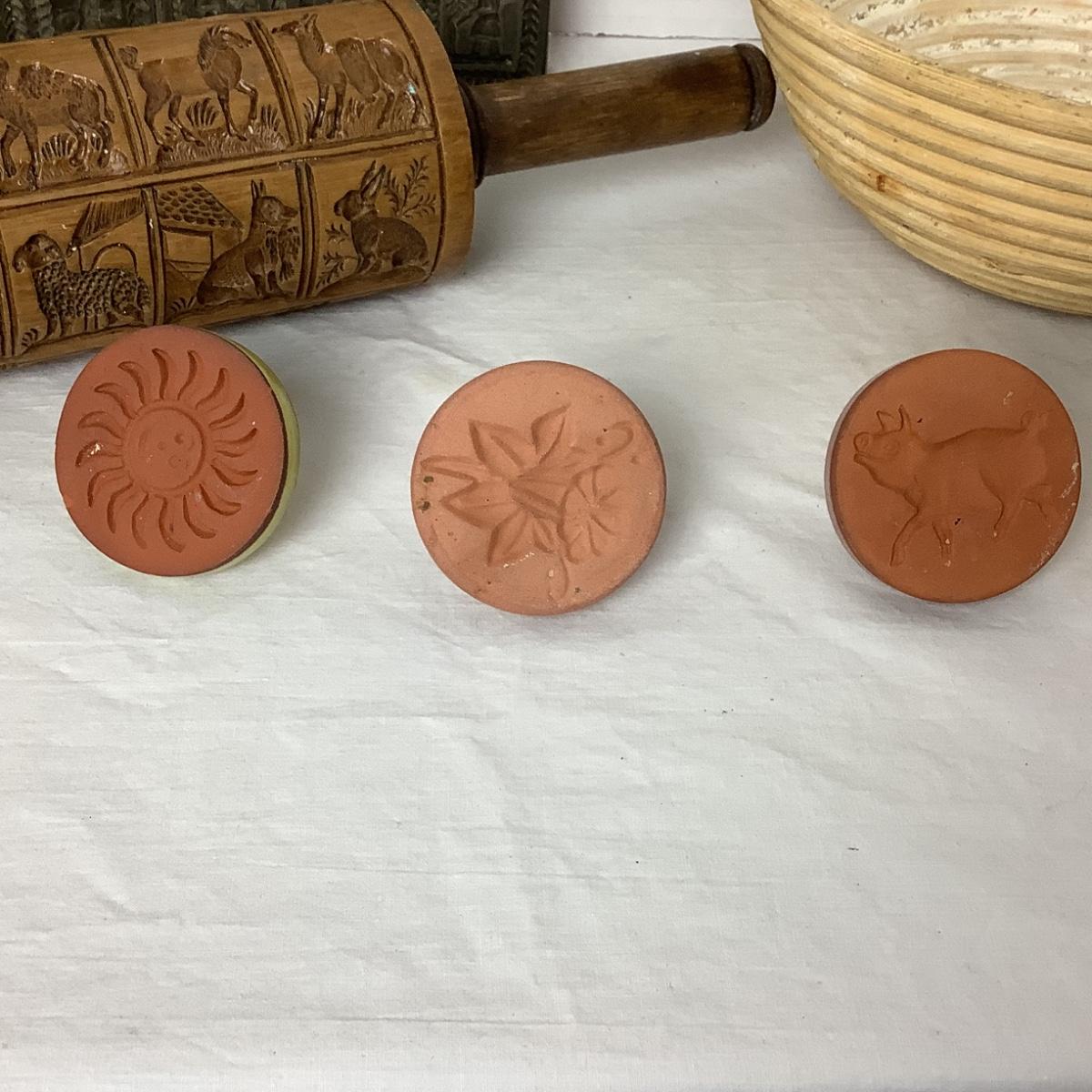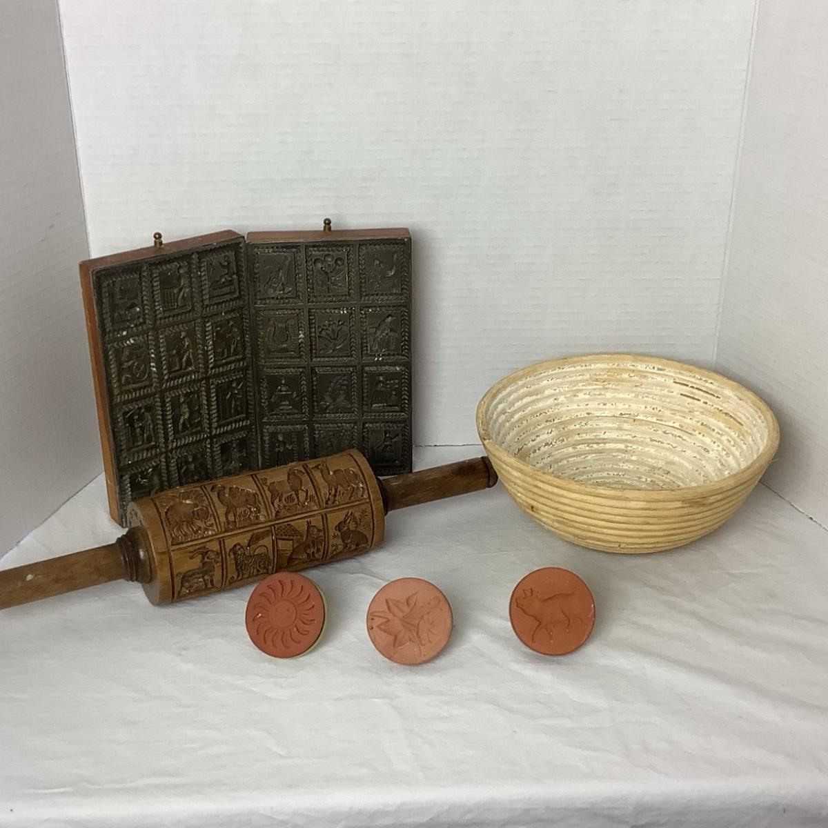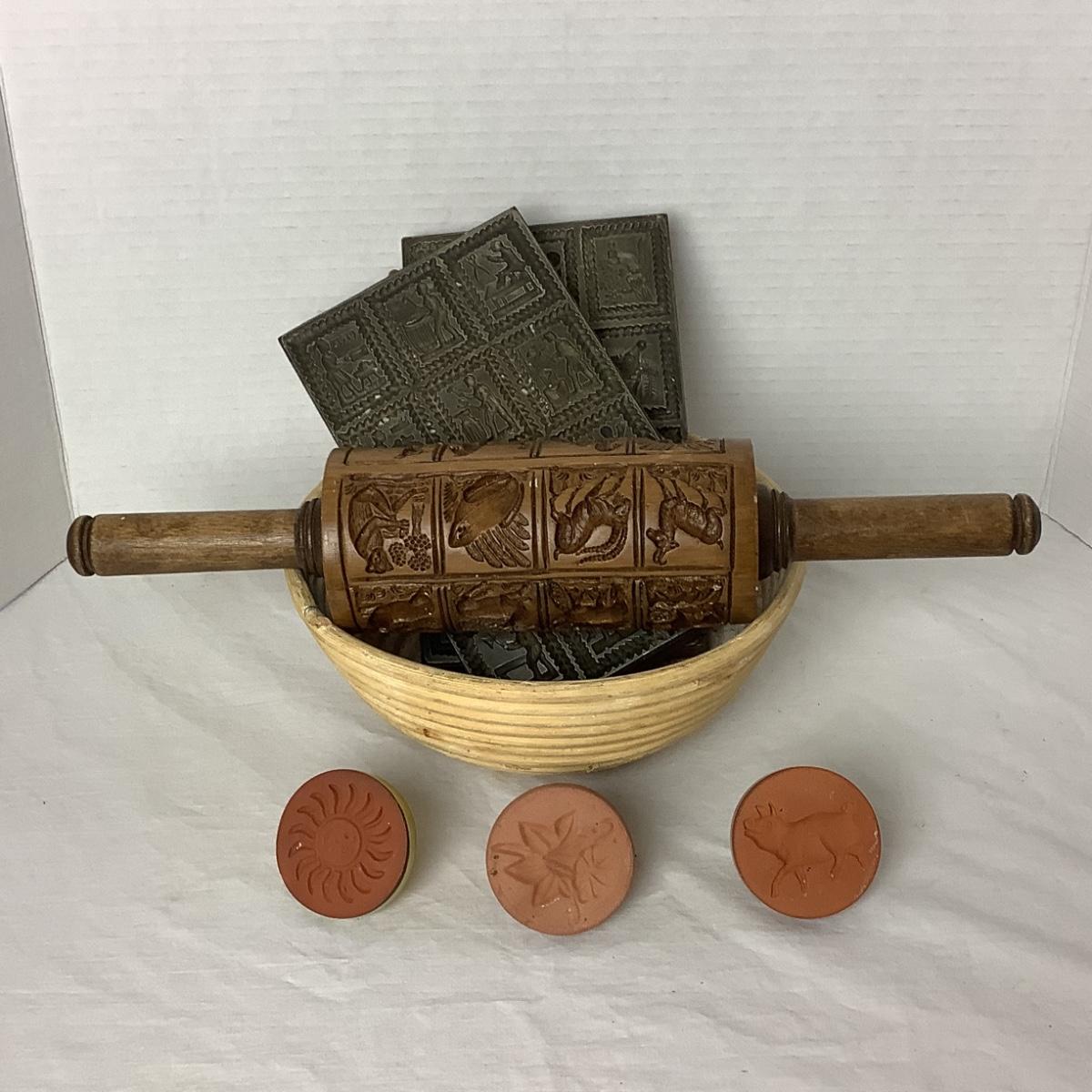731 Antique Springerle Wooden Molds and Clay Cookie Press with Braided Bowl