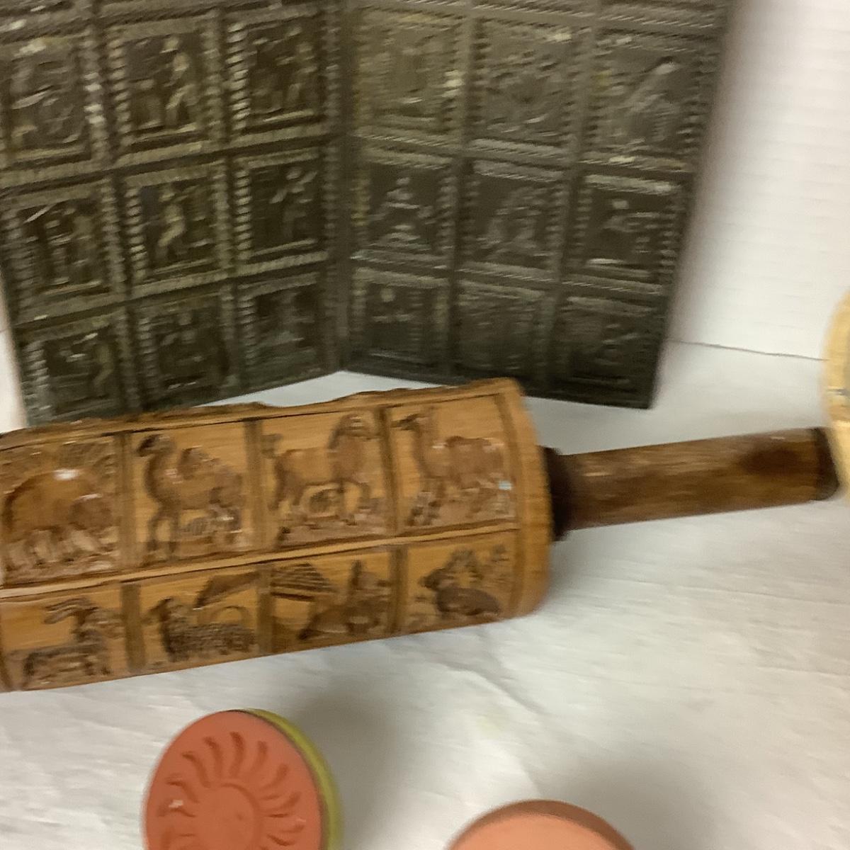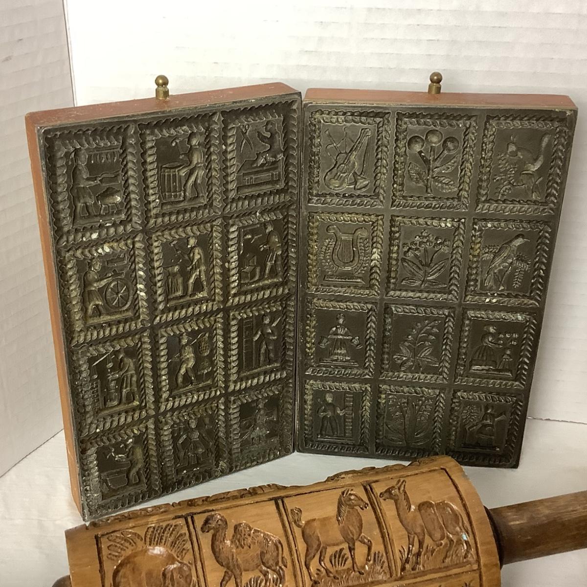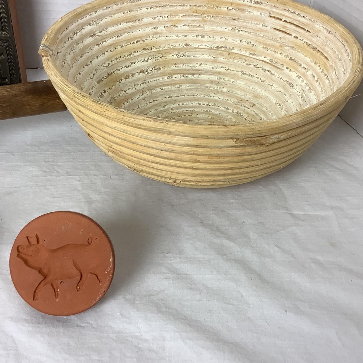 731 Antique Springerle Wooden Molds and Clay Cookie Press with Braided Bowl