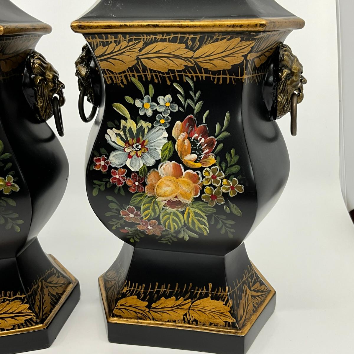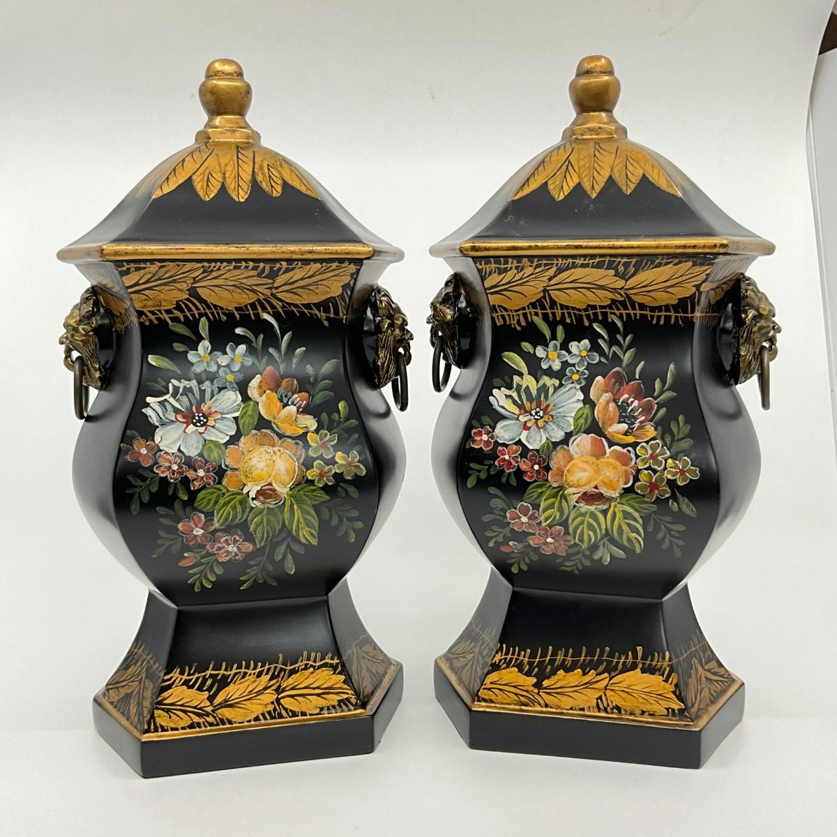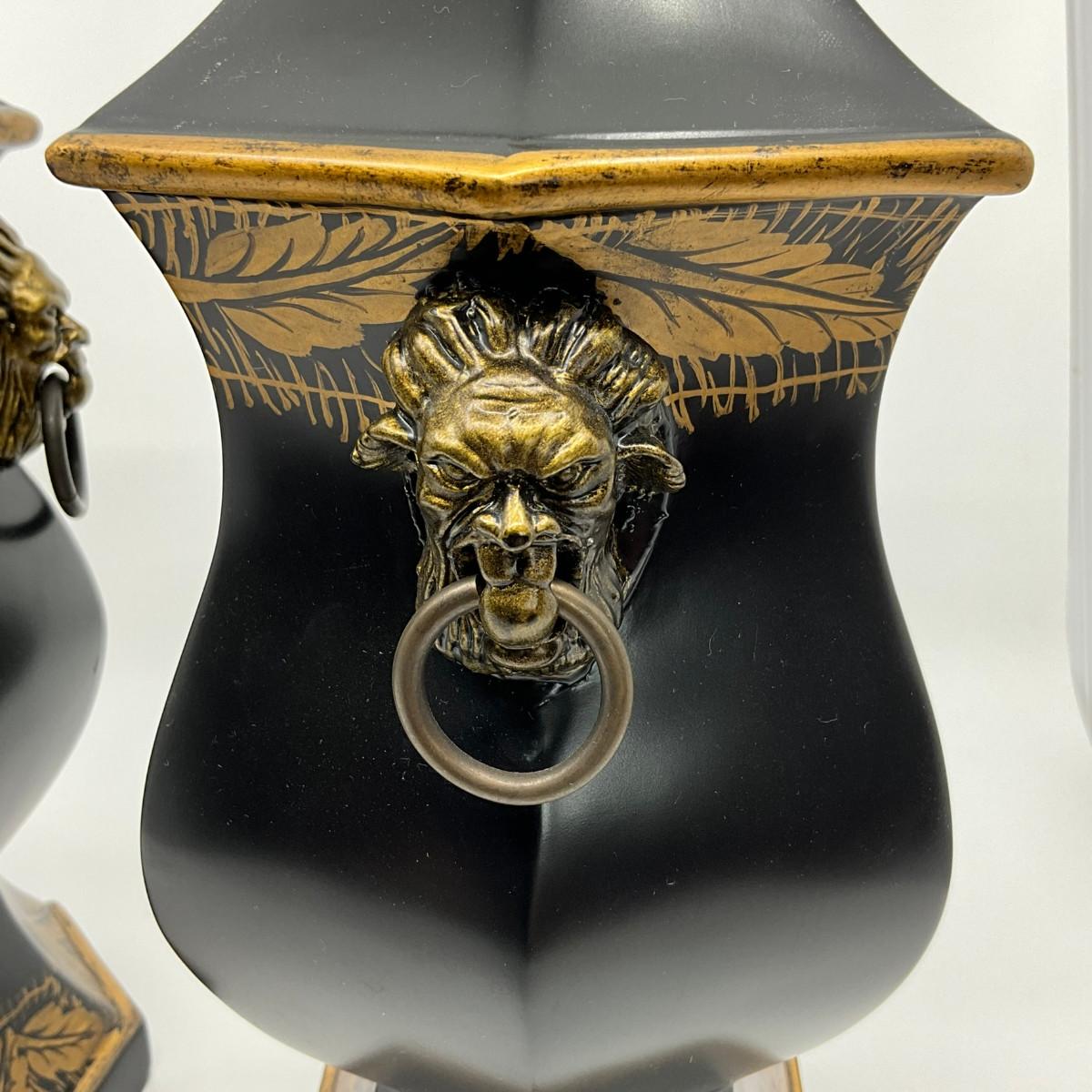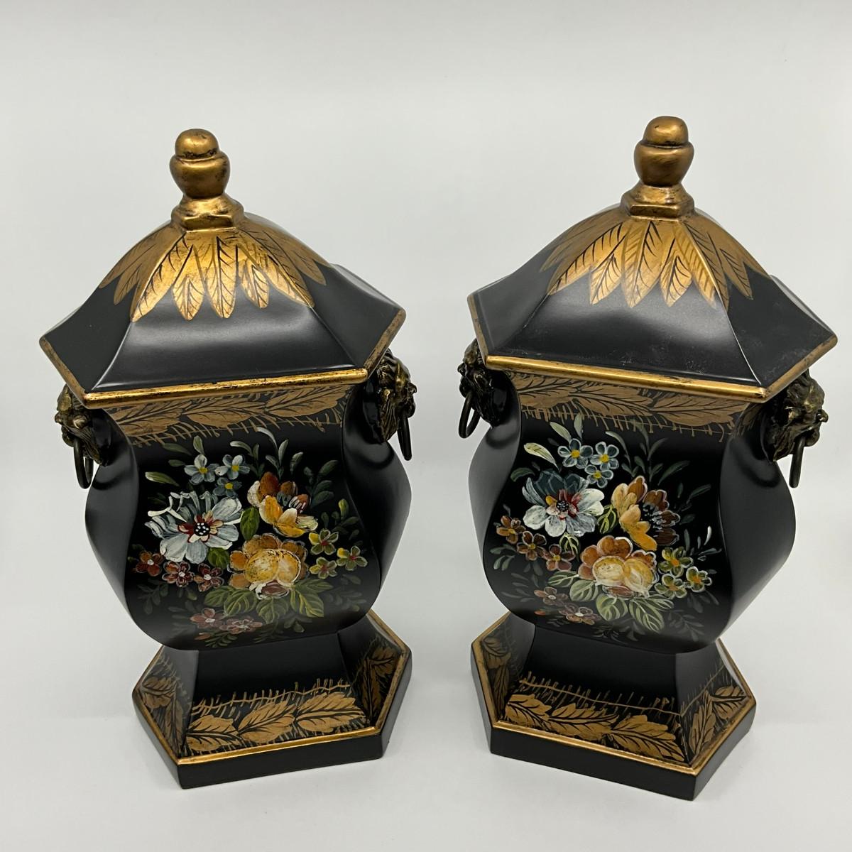 731 Pair of Hand Painted Black Double Handle Urns