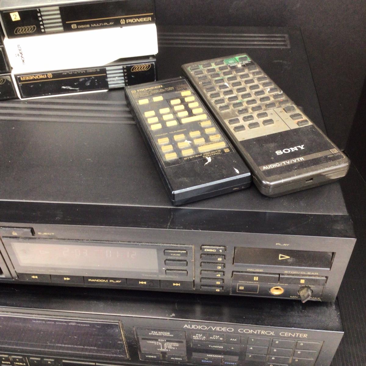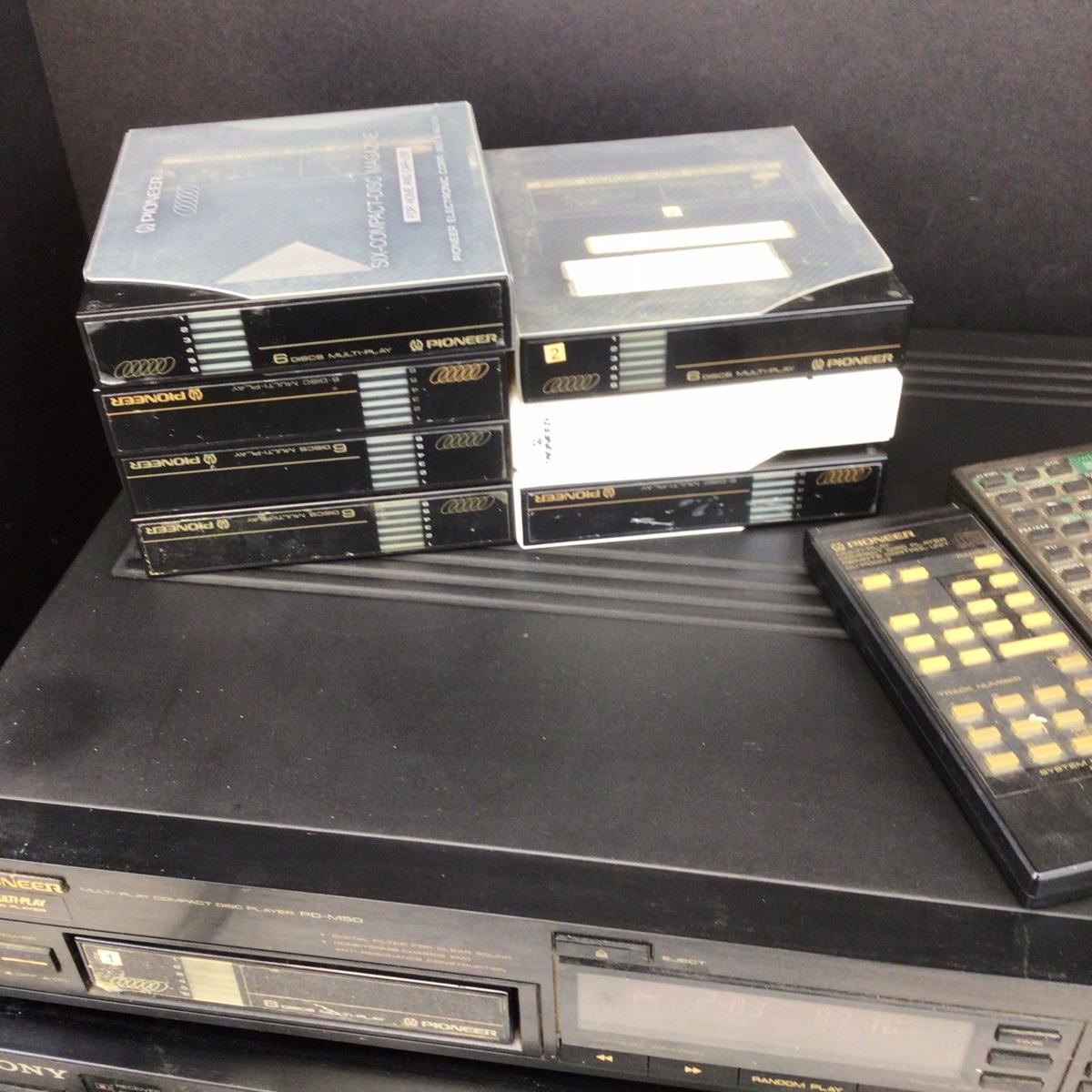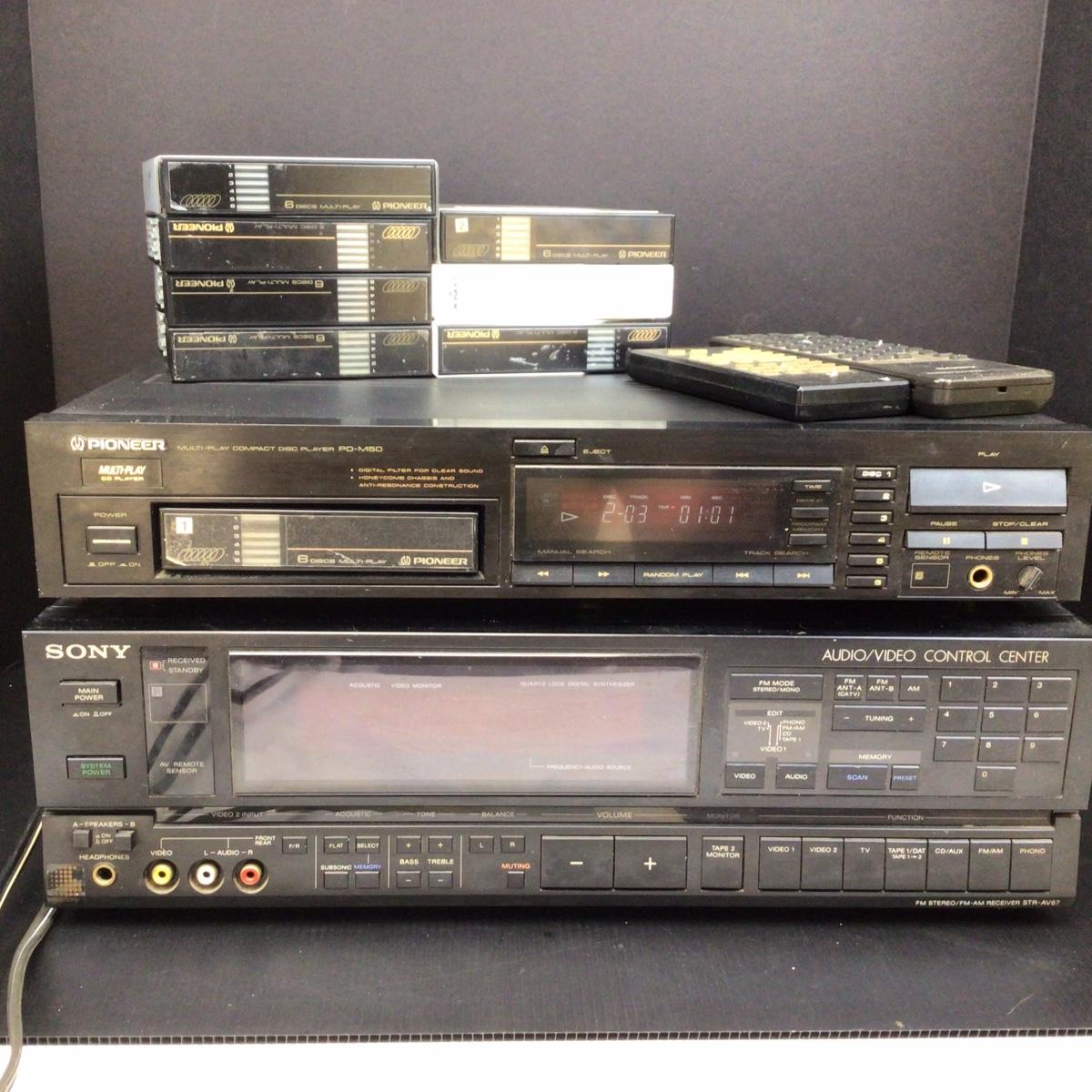 Pioneer multi-play CD player with 8 additional CD magazines, Sony receiver for audio/video.