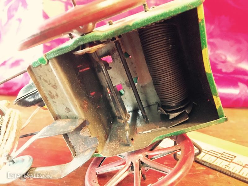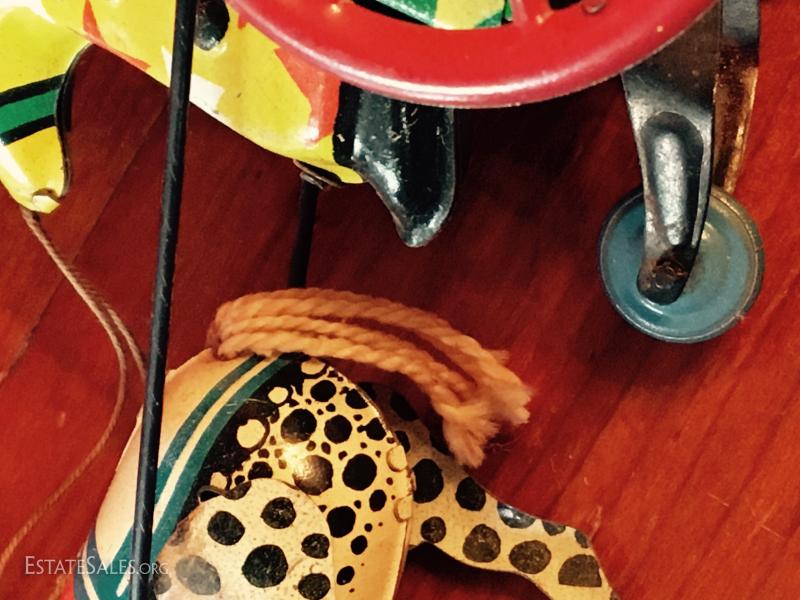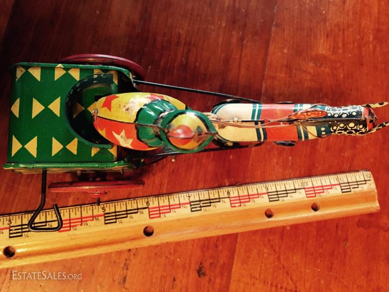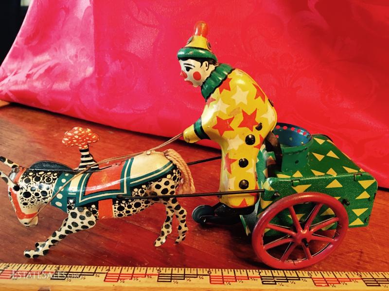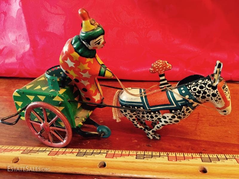 Winds and clown bops up and down, needs a little push to go. Doesn't go far. Winds well. String/twine tail and reins