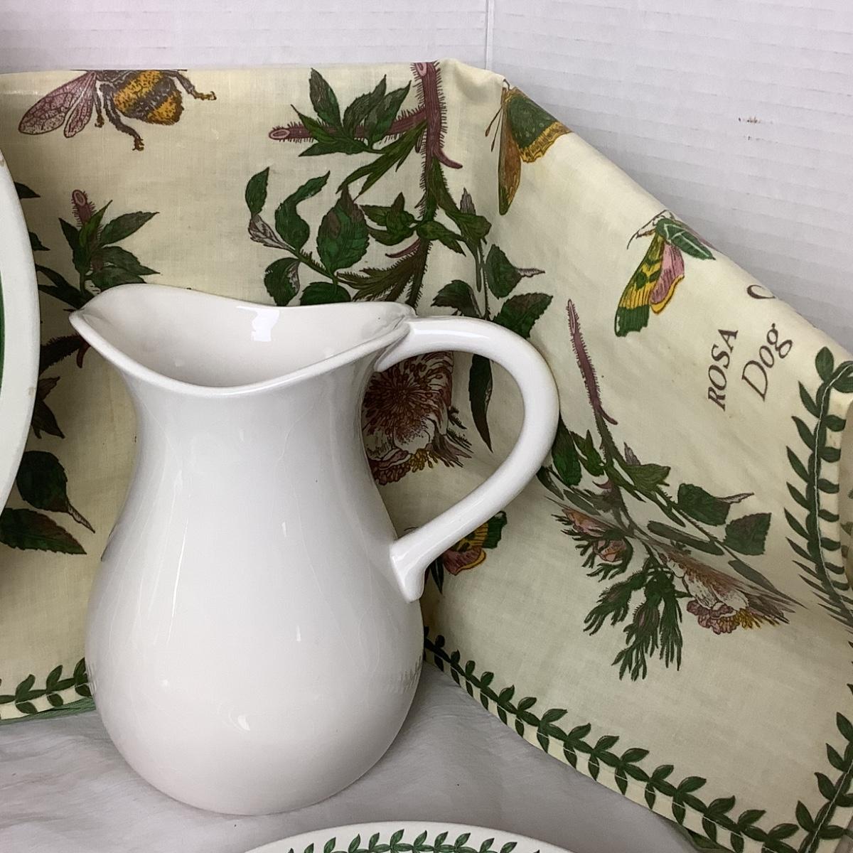 Two 8.5” salad plates by portmeirion and one white 8” pottery pitcher, one waxcloth apron by portmeirion (some stains) and one large Italian serving bowl 13.5” round