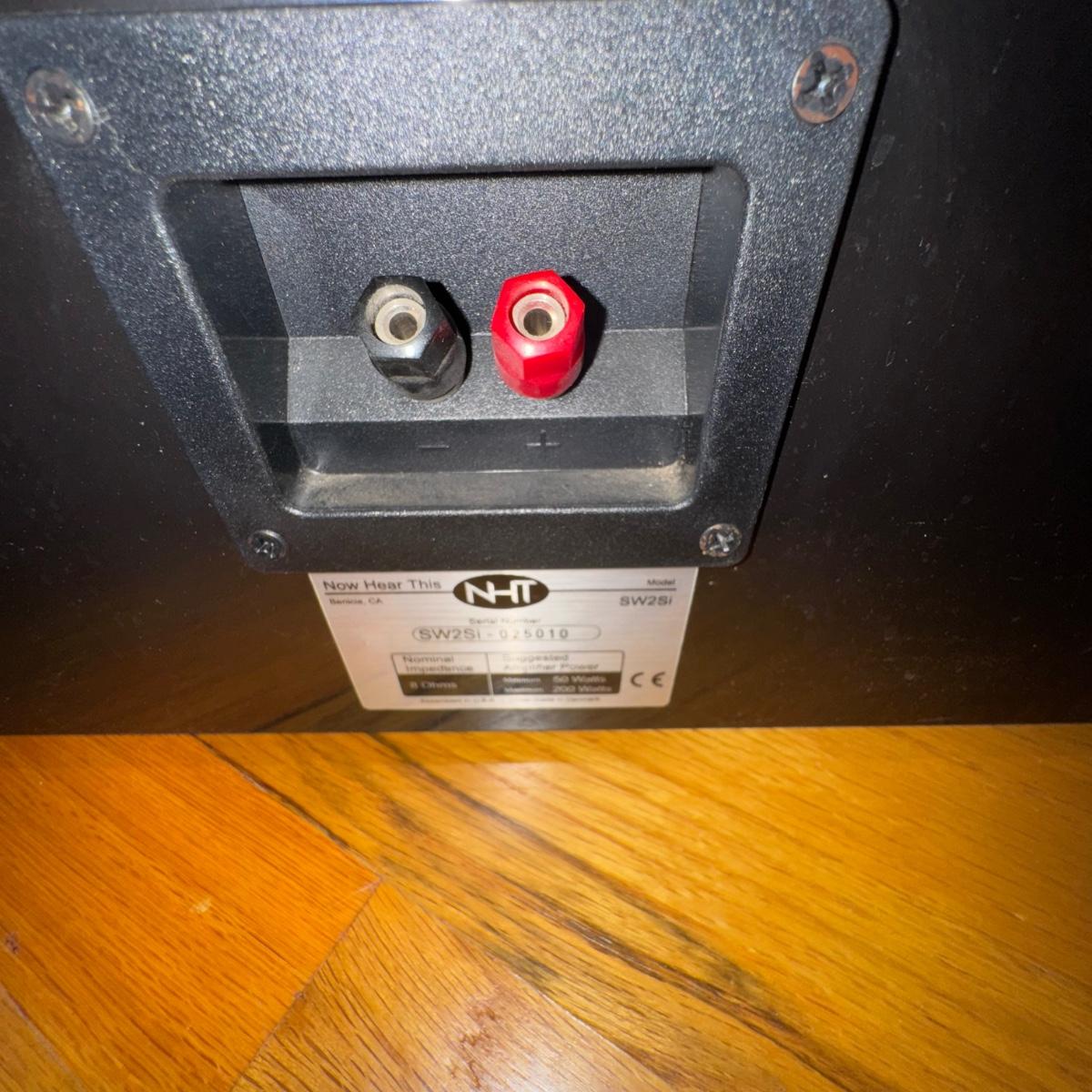 NHT Model: SW2Si Subwoofer. Overall condition of the subwoofer is good considering its age. Removable speaker cover has no damage. Unit has been tested and is working great. Comes with some wires as pictured. No damage on the speaker cones, etc. A great addition to any home theater or home entertainment system.
