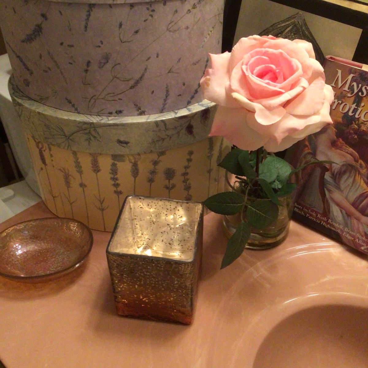 Nesting organizing boxes, faux rose, copper glass bathroom dishes and assorted coffee table books.