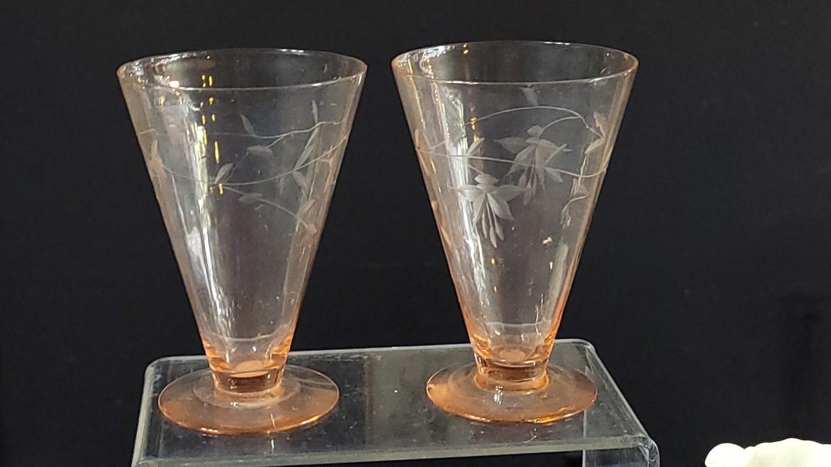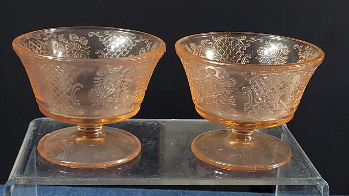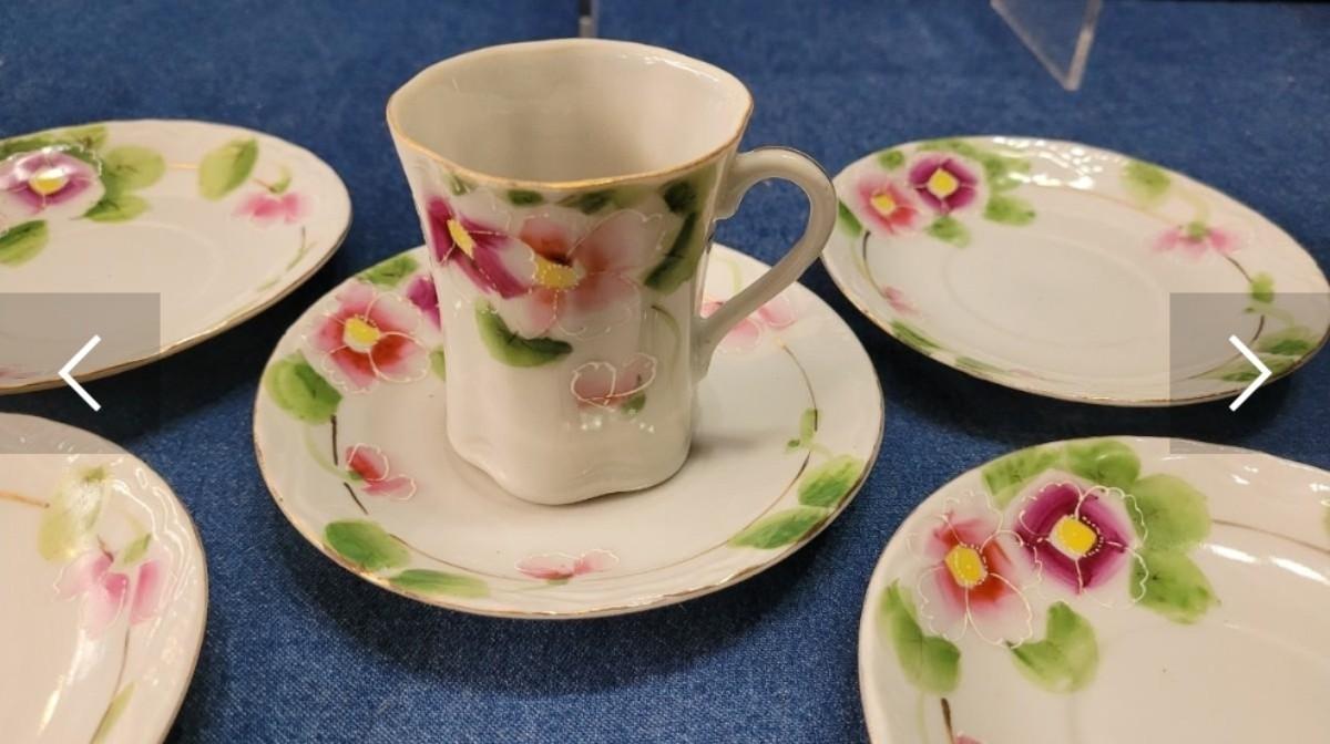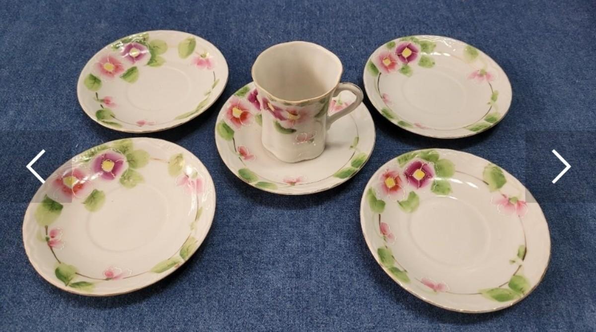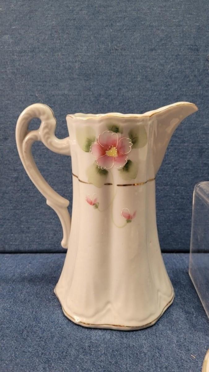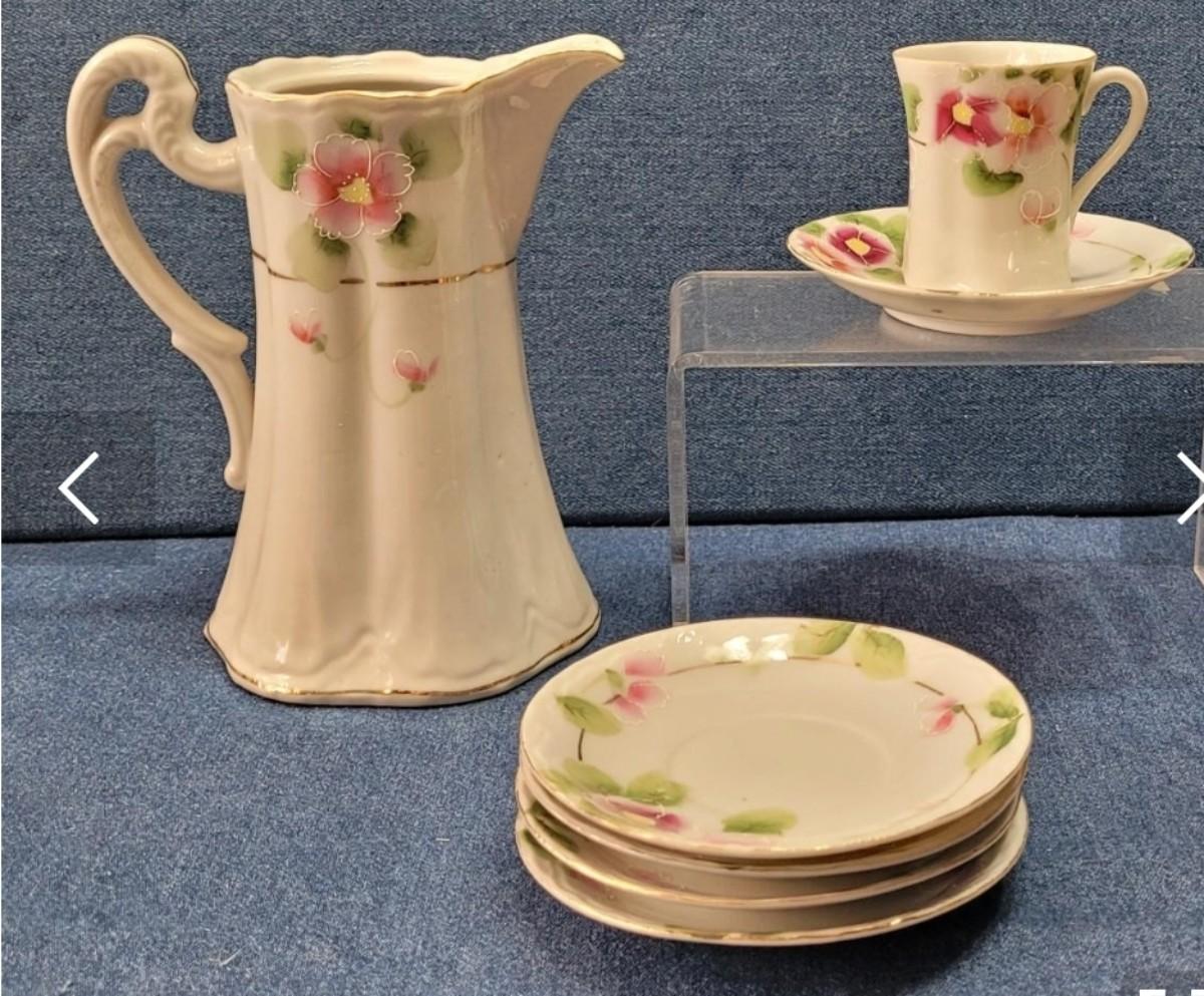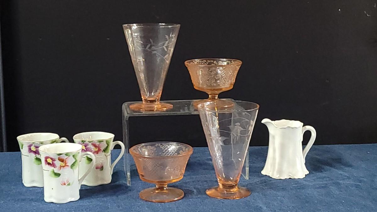 74: Vintage Pink Depression Glass & Porcelain Creamer and Handpainted Teapot, Saucers & Cups