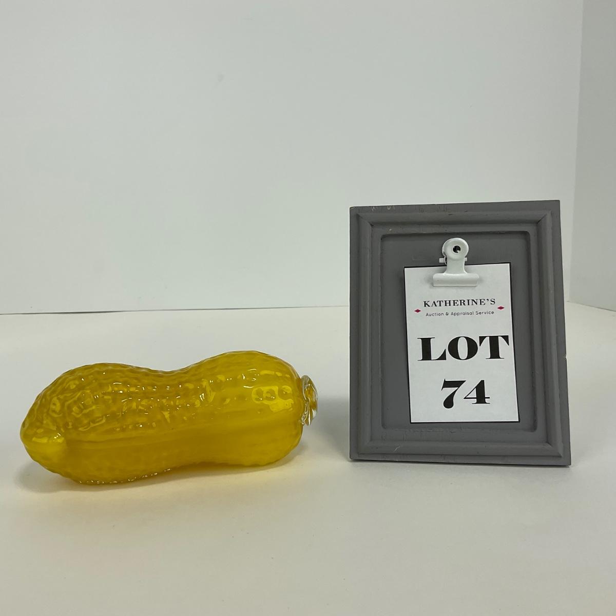 One vintage art glass yellow peanut figure. This piece has no damage, and appears to be in great shape with no visable chips, cracks, or broken pieces. Please see photos for details and condition. Any condition statement is given as a courtesy to a client, is an opinion, and should not be treated as a statement of fact. Reference to condition written, oral or within a condition report shall not be regarded as a full account of condition and may not include all defects, alterations, or restorations. Absence of a condition report does not imply a lot is flawless or lacking imperfections or damage. Katherine’s Auction & Appraisal Service shall have no responsibility for any error or omission. Returns shall not be accepted on the basis of condition. ::: Shipping is available on this lot. If you require shipping you must let us know at the close of the auction. We will coordinate with you after the item has been won. Shipping fees will include insurance up to or exceeding the value of all items being mailed. If you have any questions regarding this lot please contact the auctioneer either via this website, by direct email or by phone. PICK UP TIMES and other important information can be found in the TERMS and DESCRIPTION of the auction. Please take a look for pertinent information. Thanks!
