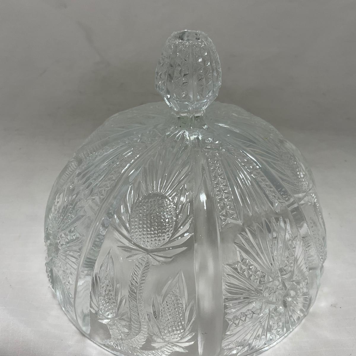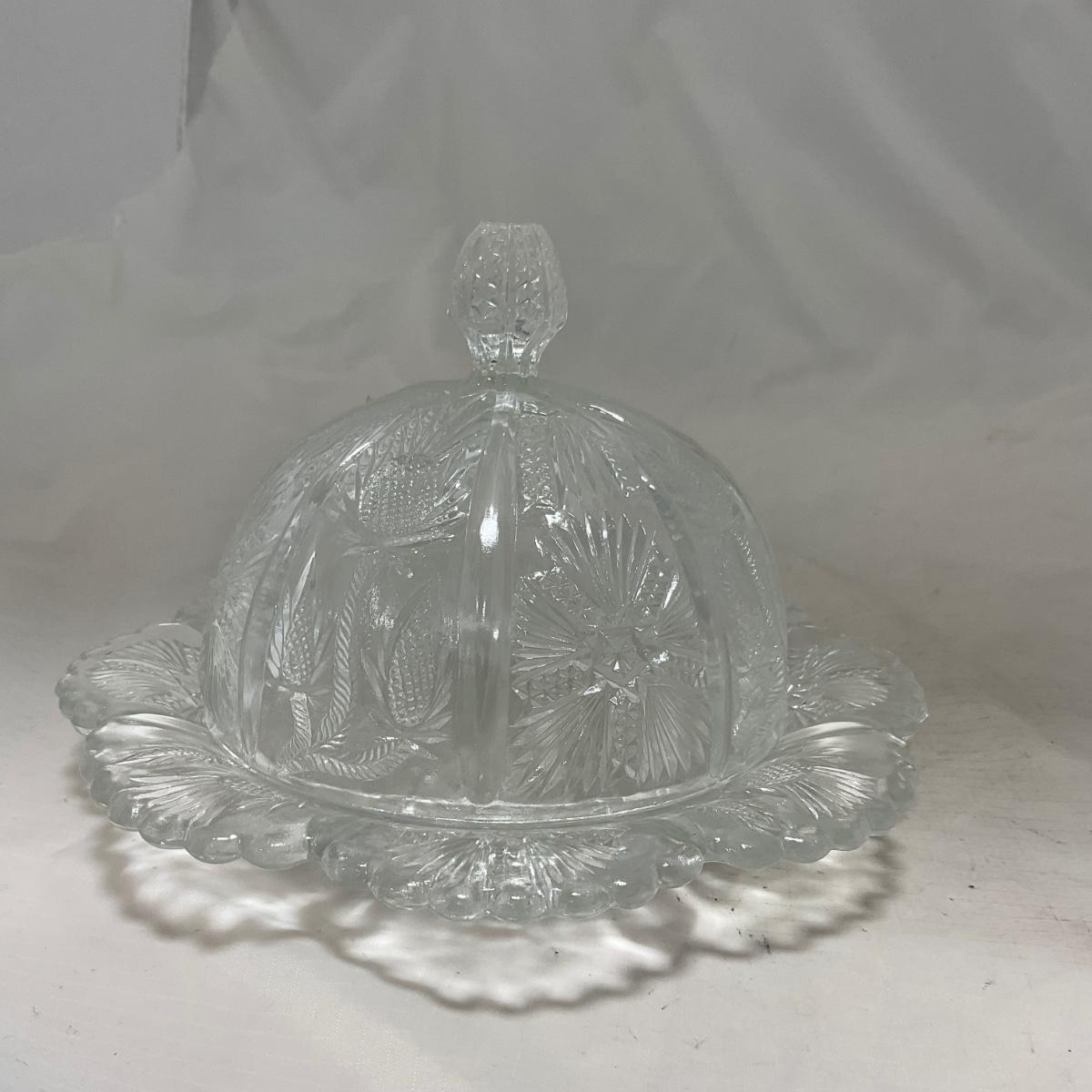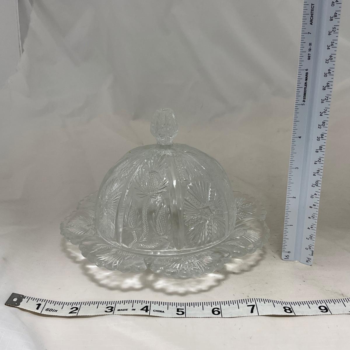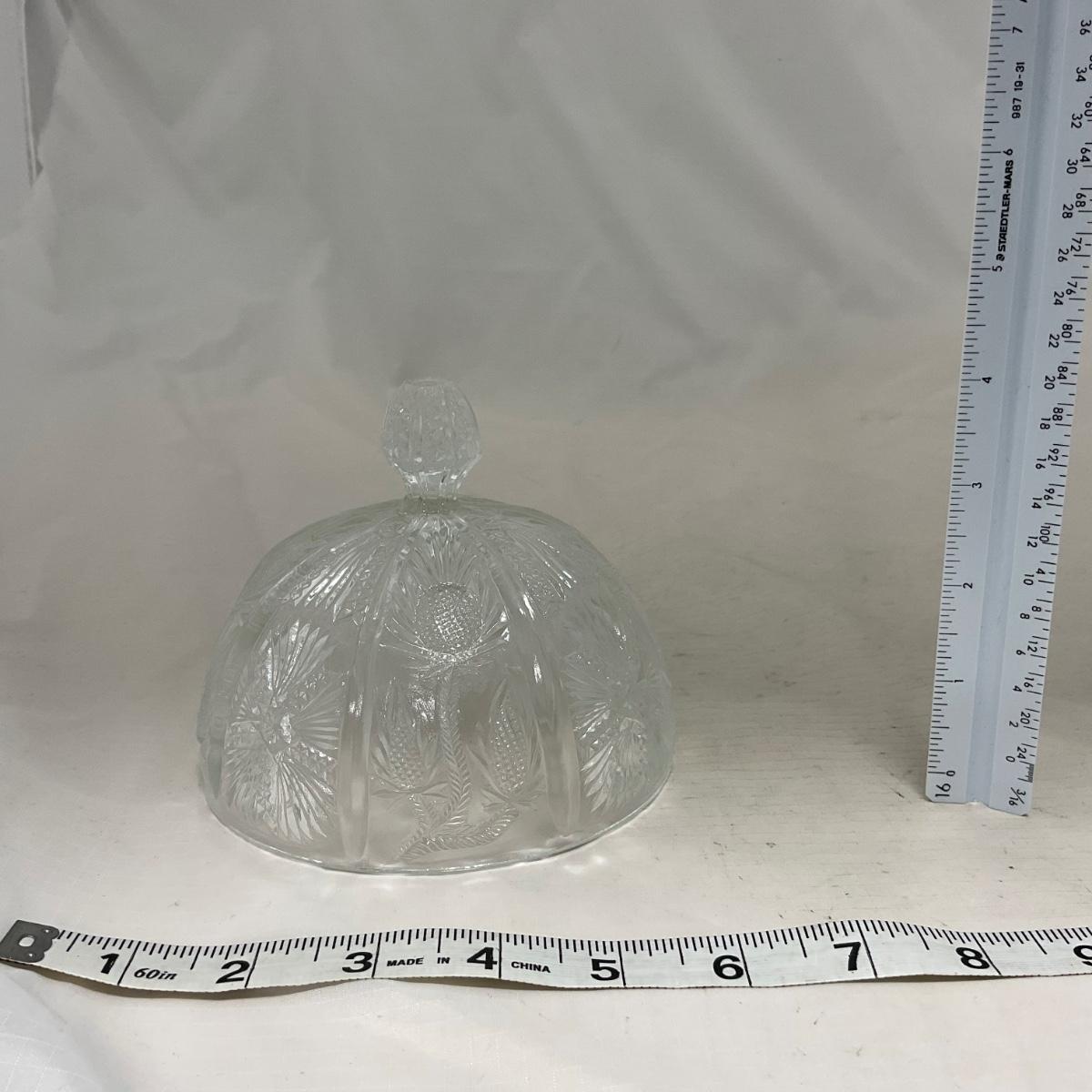 This clear glass covered butter dish has a beautiful intricate design. This piece has been loved and used previously and are a few small marks and chips on the inside of the dish where the lid and bottom meet it seems but nothing very noticeable. Please see photos for details and condition. ::: Shipping is available on this lot. If you require shipping you must let us know at the close of the auction. We will coordinate with you after the item has been won. Shipping fees will include insurance up to or exceeding the value of all items being mailed. If you have any questions regarding this lot please contact the auctioneer either via this website, by direct email or by phone. PICK UP TIMES and other important information can be found in the TERMS and DESCRIPTION of the auction. Please take a look for pertinent information. Thanks!