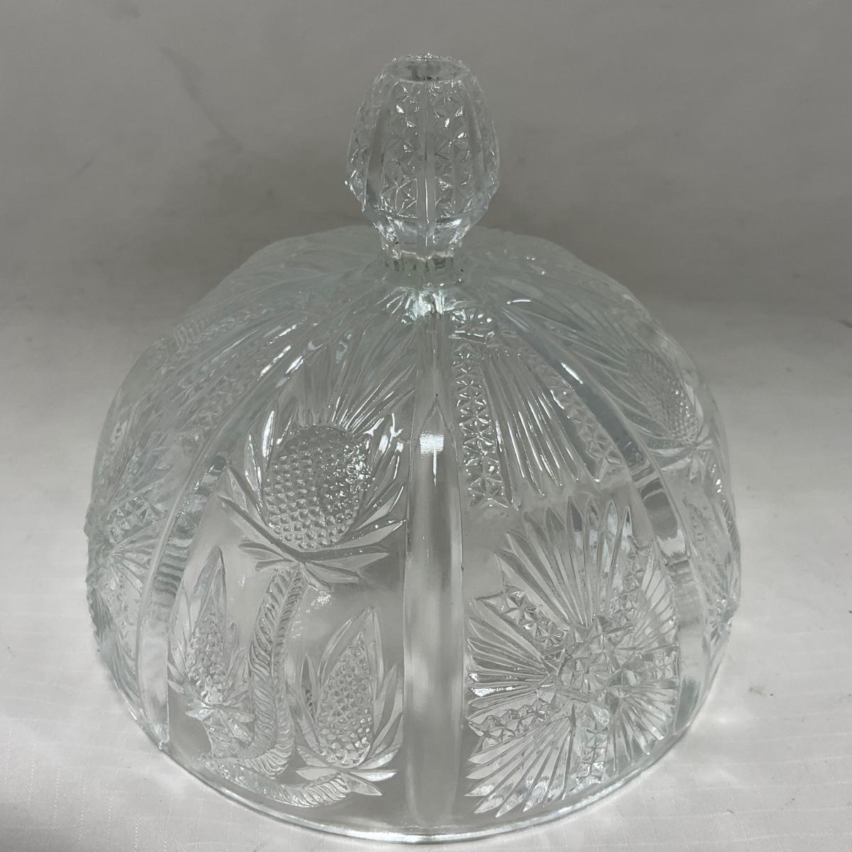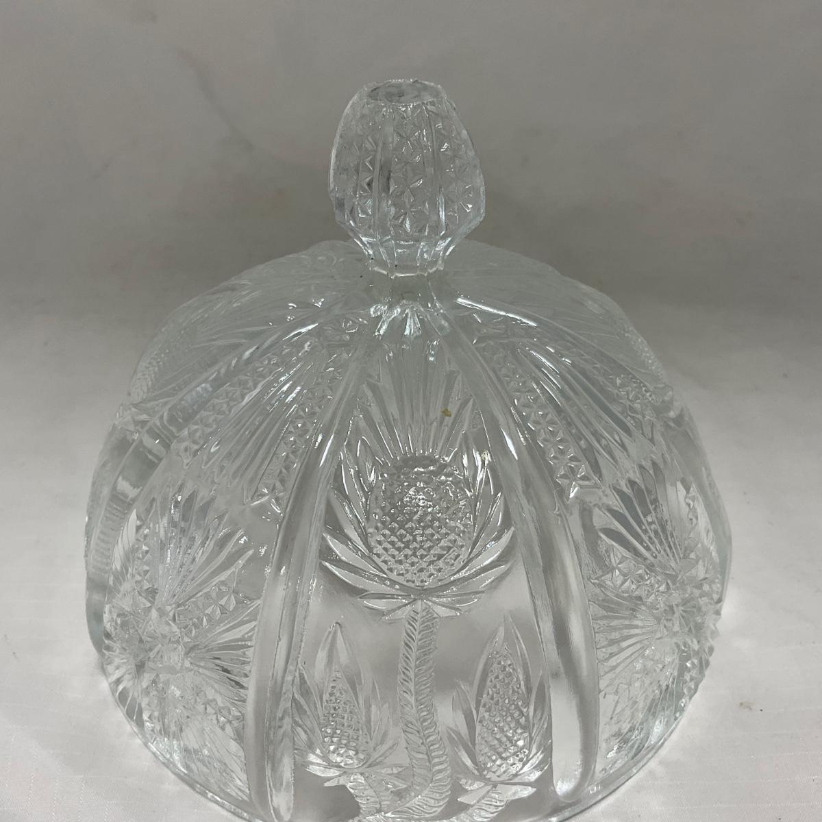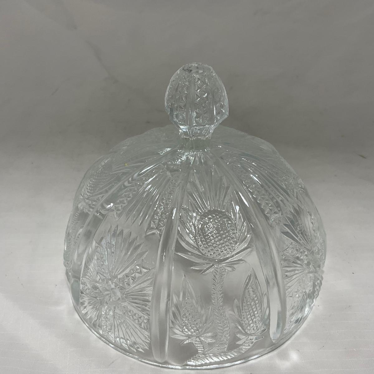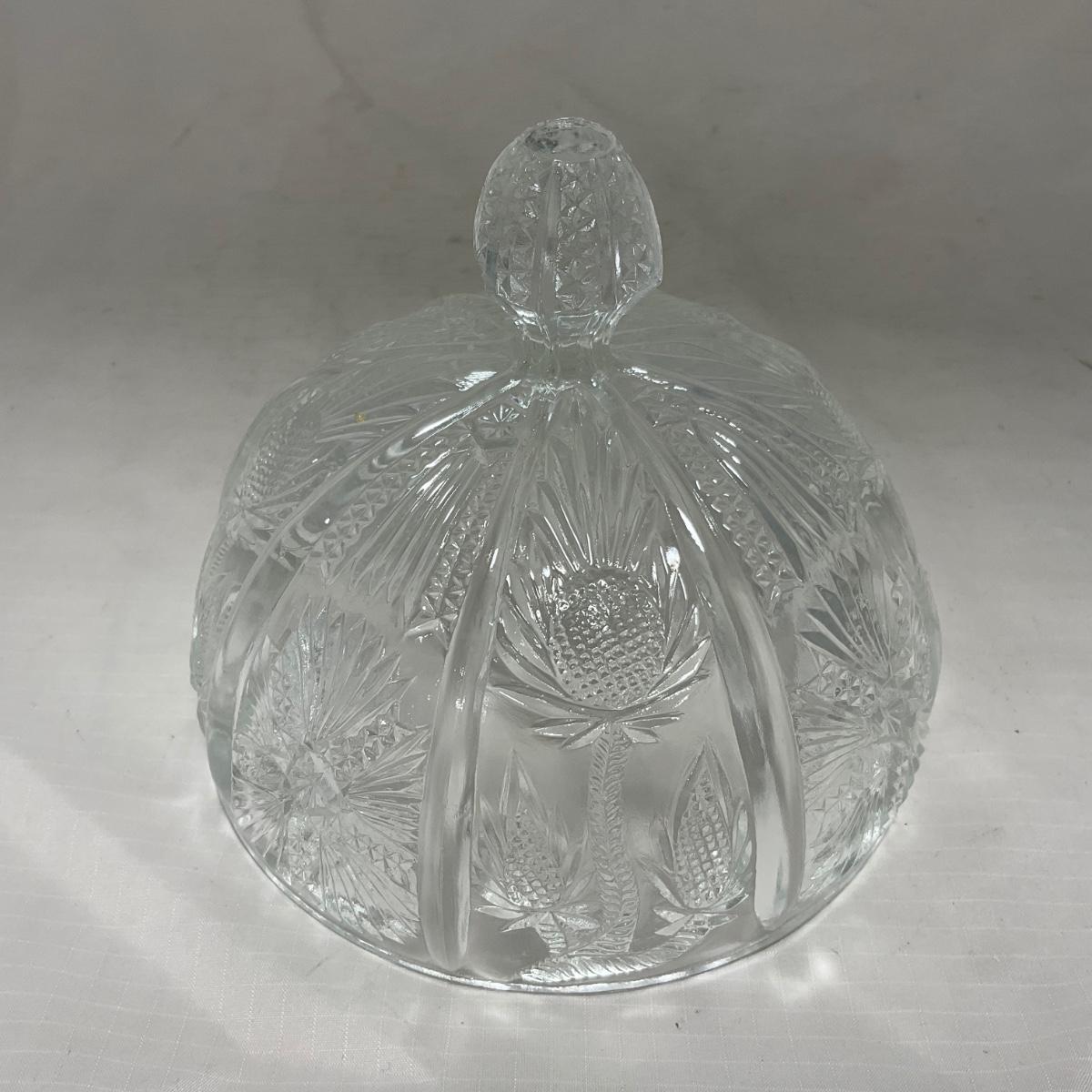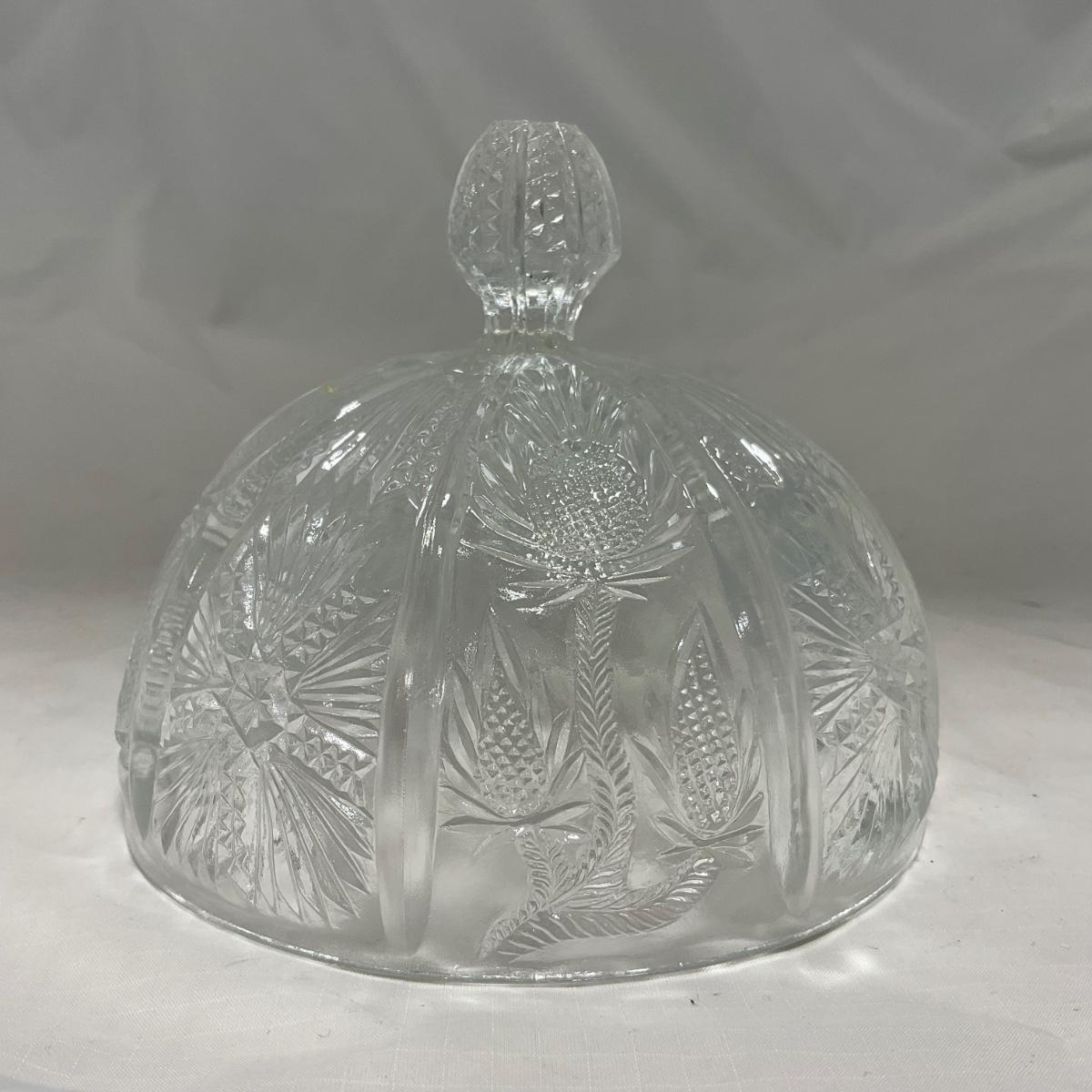 This clear glass covered butter dish has a beautiful intricate design. This piece has been loved and used previously and are a few small marks and chips on the inside of the dish where the lid and bottom meet it seems but nothing very noticeable. Please see photos for details and condition. ::: Shipping is available on this lot. If you require shipping you must let us know at the close of the auction. We will coordinate with you after the item has been won. Shipping fees will include insurance up to or exceeding the value of all items being mailed. If you have any questions regarding this lot please contact the auctioneer either via this website, by direct email or by phone. PICK UP TIMES and other important information can be found in the TERMS and DESCRIPTION of the auction. Please take a look for pertinent information. Thanks!