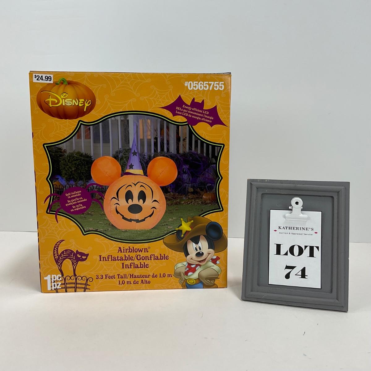 One untested in box inflatable Mickey Mouse pumpkin head. 3.3 ft tall. Please see photos for details and condition. Any condition statement is given as a courtesy to a client, is an opinion, and should not be treated as a statement of fact. Reference to condition written, oral or within a condition report shall not be regarded as a full account of condition and may not include all defects, alterations, or restorations. Absence of a condition report does not imply a lot is flawless or lacking imperfections or damage. Katherine’s Auction & Appraisal Service shall have no responsibility for any error or omission. Returns shall not be accepted on the basis of condition. ::: Shipping is available on this lot. If you require shipping you must let us know at the close of the auction. We will coordinate with you after the item has been won. Shipping fees will include insurance up to or exceeding the value of all items being mailed. If you have any questions regarding this lot please contact the auctioneer either via this website, by direct email or by phone. PICK UP TIMES and other important information can be found in the TERMS and DESCRIPTION of the auction. Please take a look for pertinent information. Thanks!