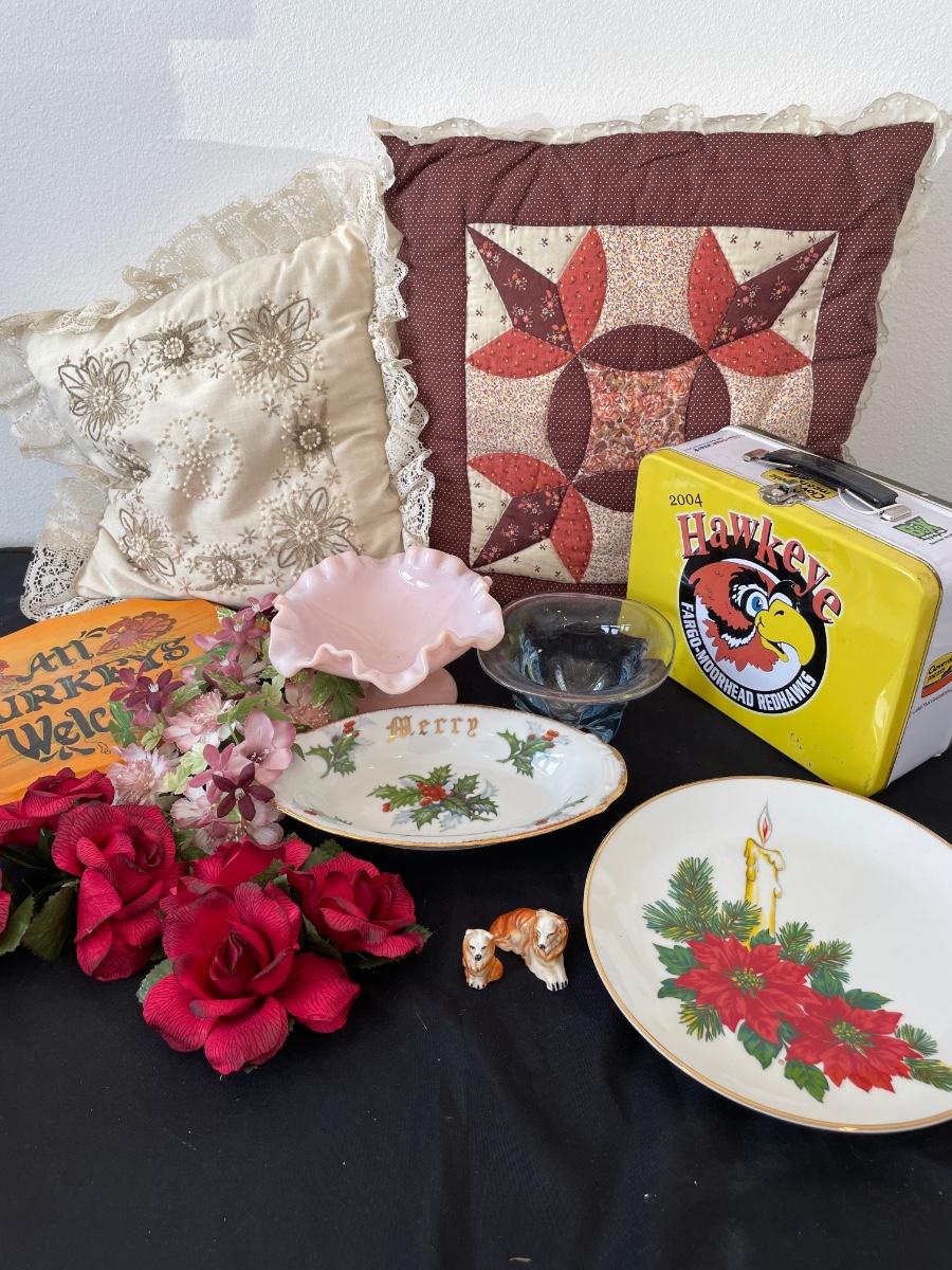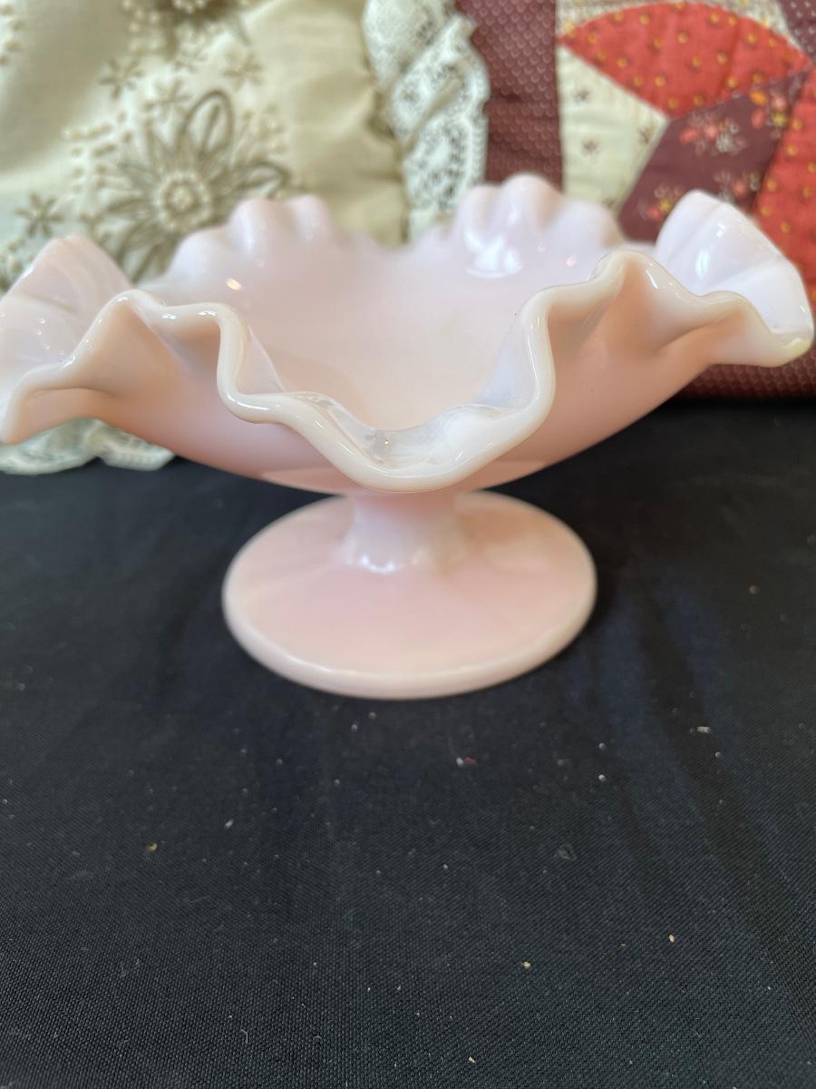 74- Fenton pink ruffle glass, misc Xmas, etc