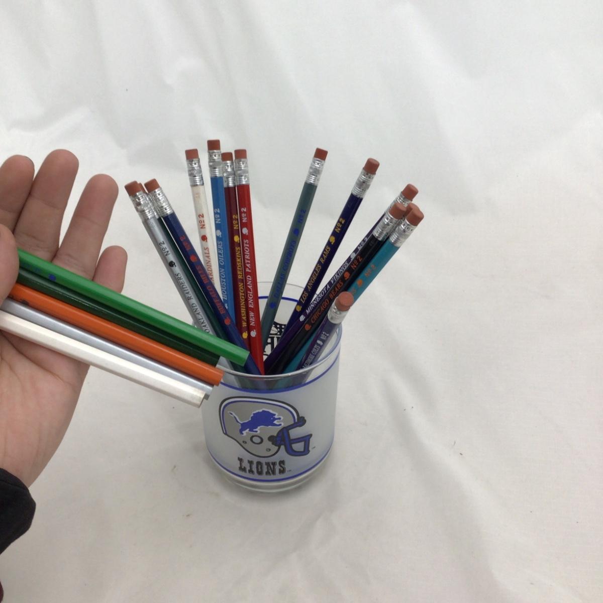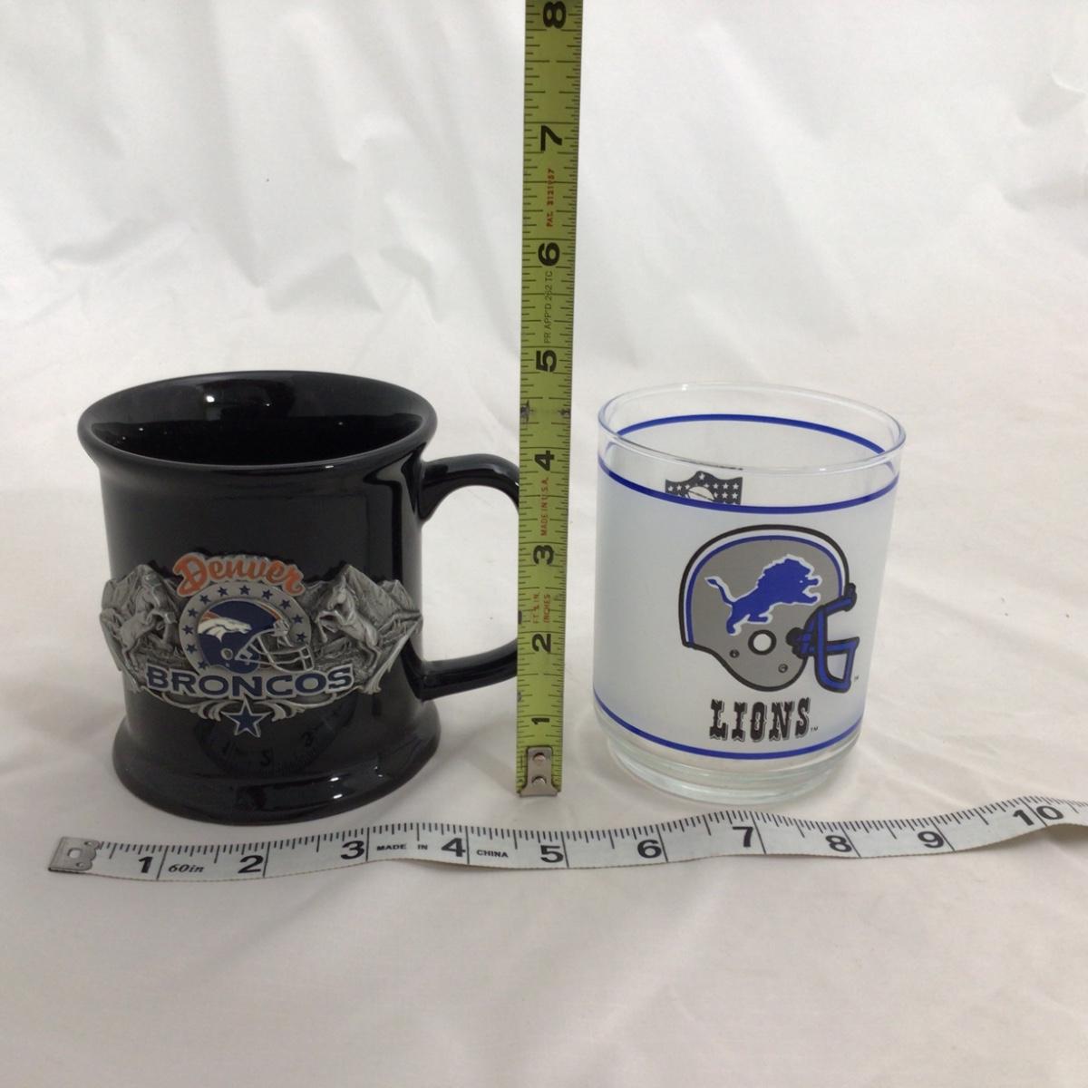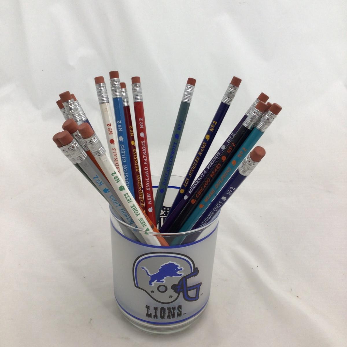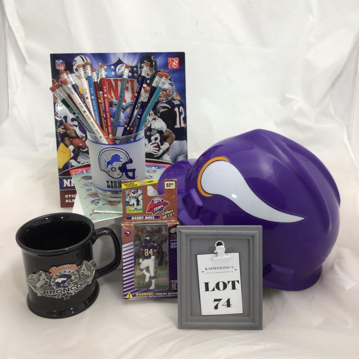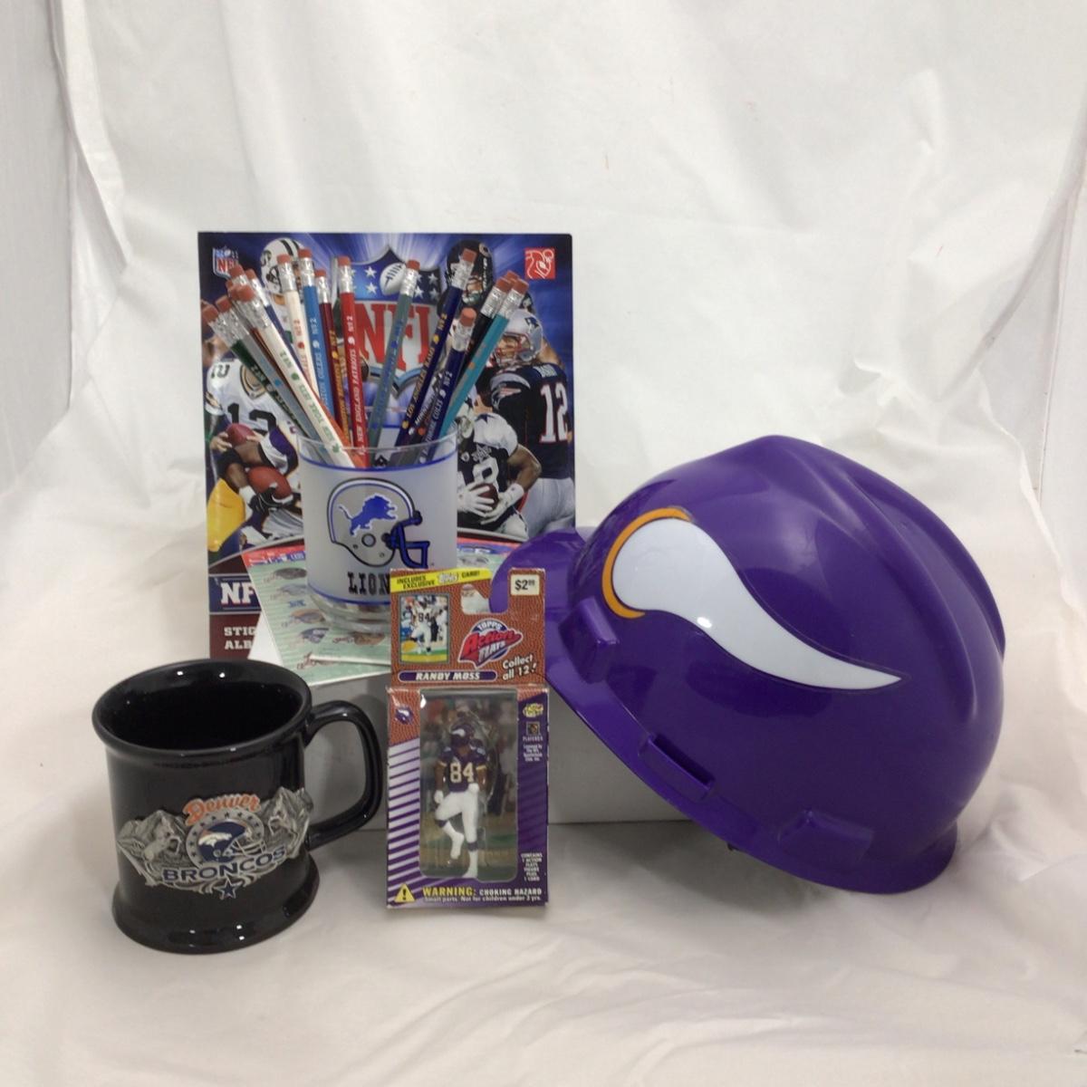 One NFL 2011 sticker collection booklet, one Vikings plastic kids helmet, 19 NFL branded football teams unused pencils, one lions NFL branded lions frosted glass, One topps action flats figure in box, Two packs of NFL football team helmet stickers, and One ceramic Denver Broncos mug. Please see photos for details and condition. ::: Shipping is available on this lot. If you require shipping you must let us know at the close of the auction. We will coordinate with you after the item has been won. Shipping fees will include insurance up to or exceeding the value of all items being mailed. If you have any questions regarding this lot please contact the auctioneer either via this website, by direct email or by phone. PICK UP TIMES and other important information can be found in the TERMS and DESCRIPTION of the auction. Please take a look for pertinent information. Thanks!
