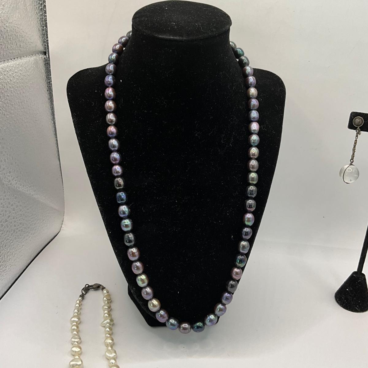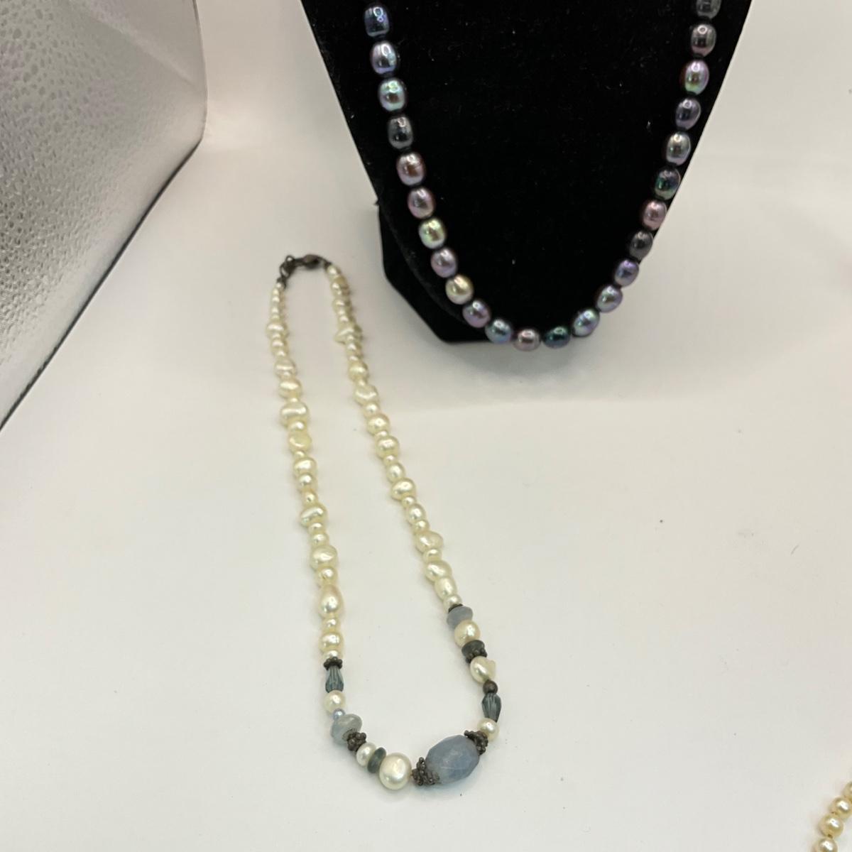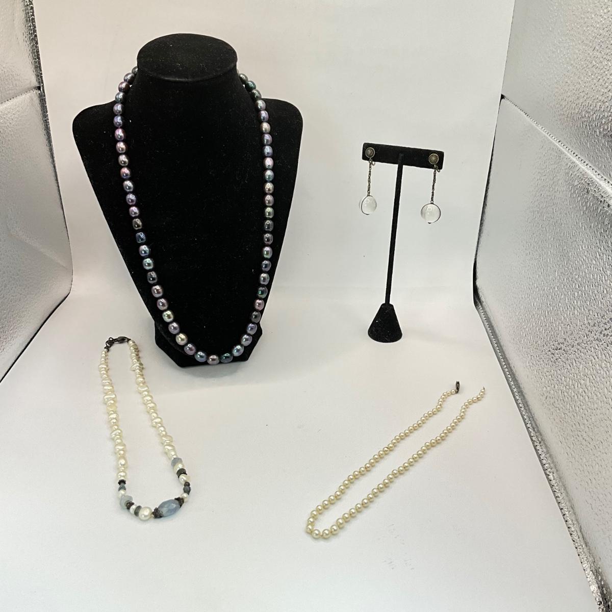 Freshwater pearl necklace measures 22" and needs to restrung ( has been stretched) with 16" cultured pearl necklace , quartz and freshwater necklace with sterling claps is 18" and one pair of screwback silver glass ball drop earrings