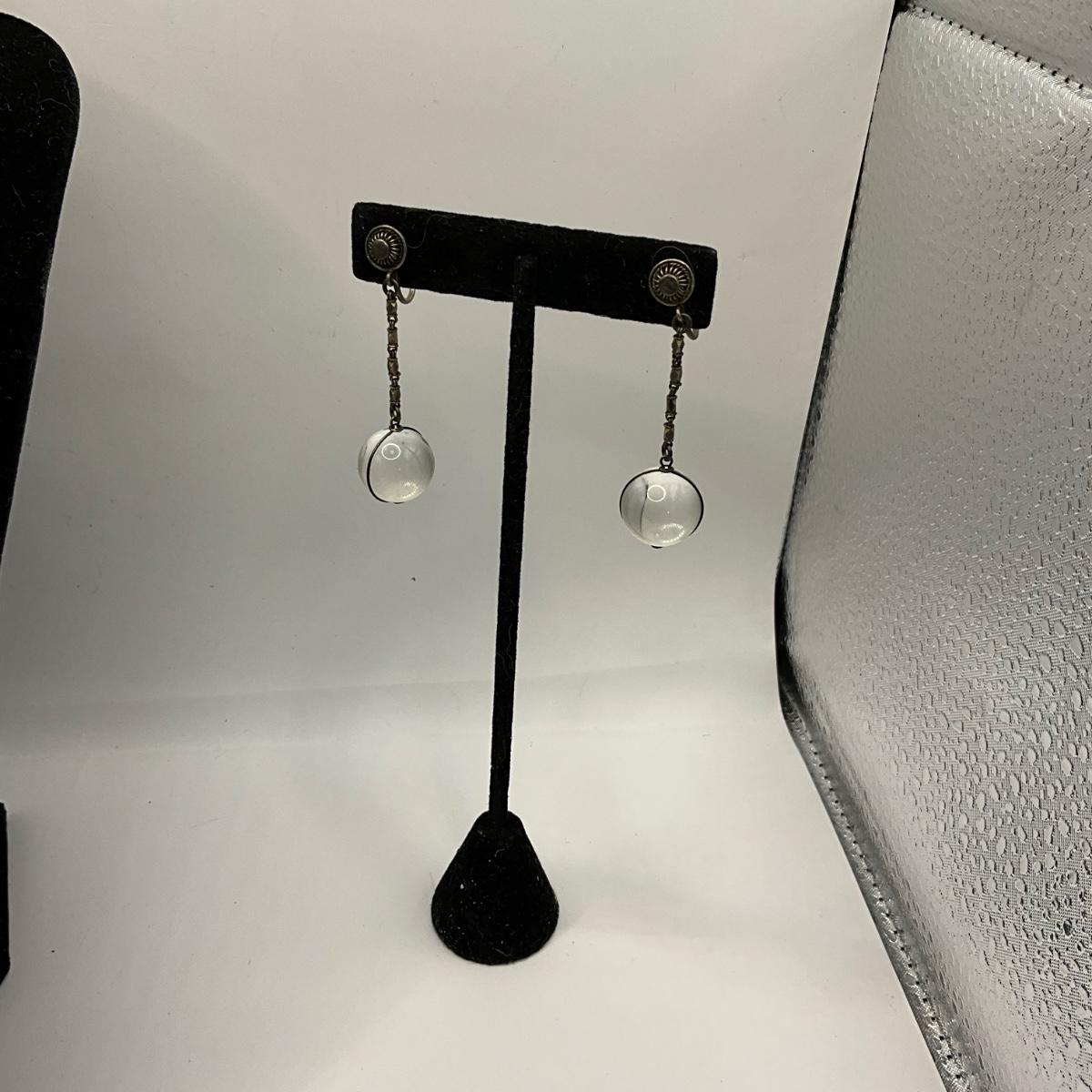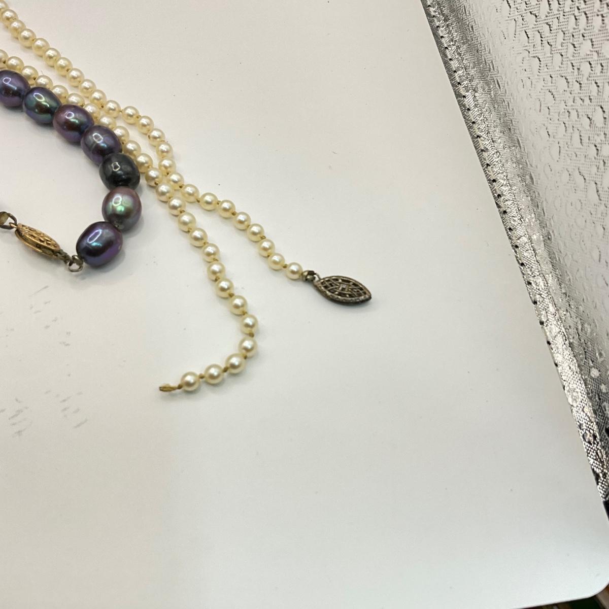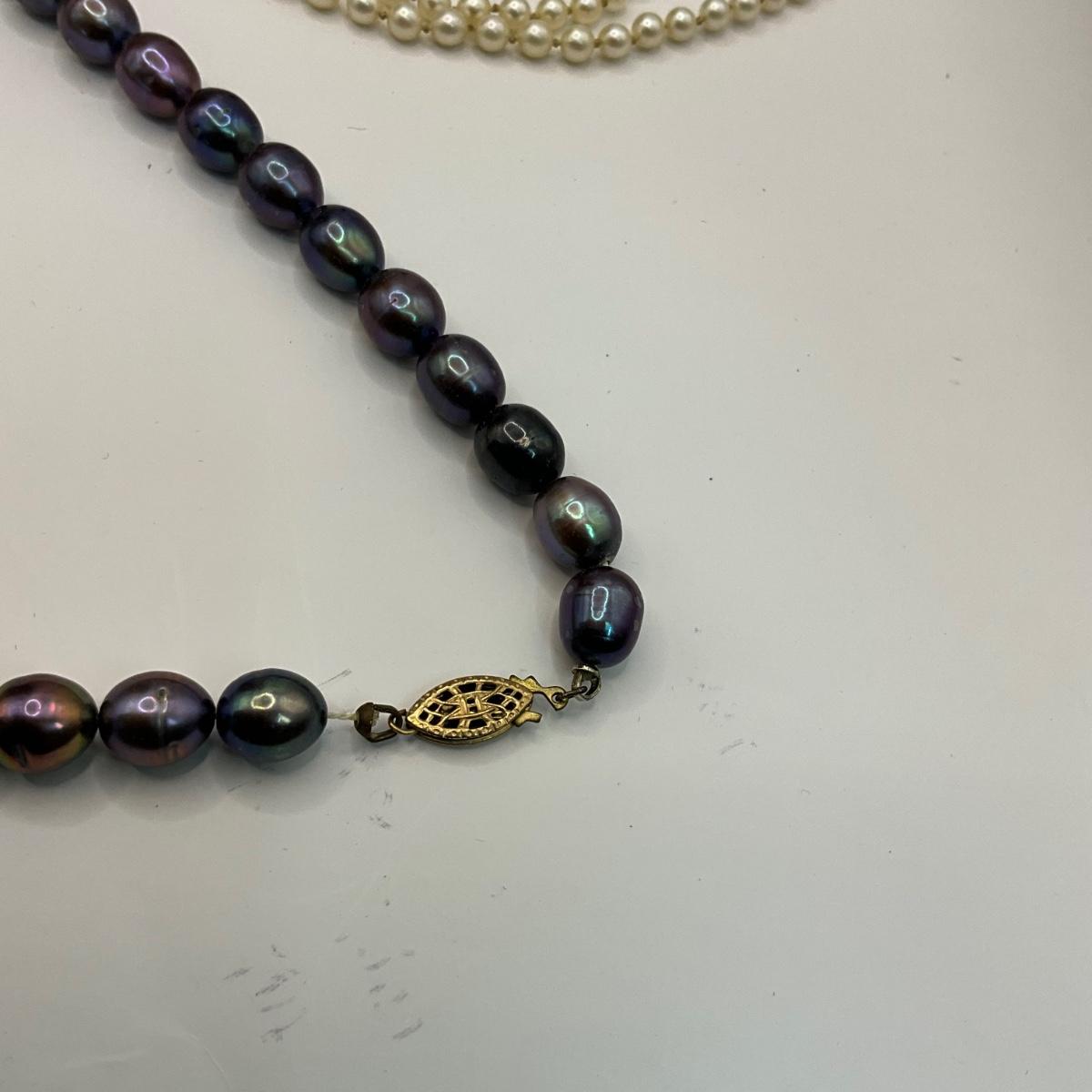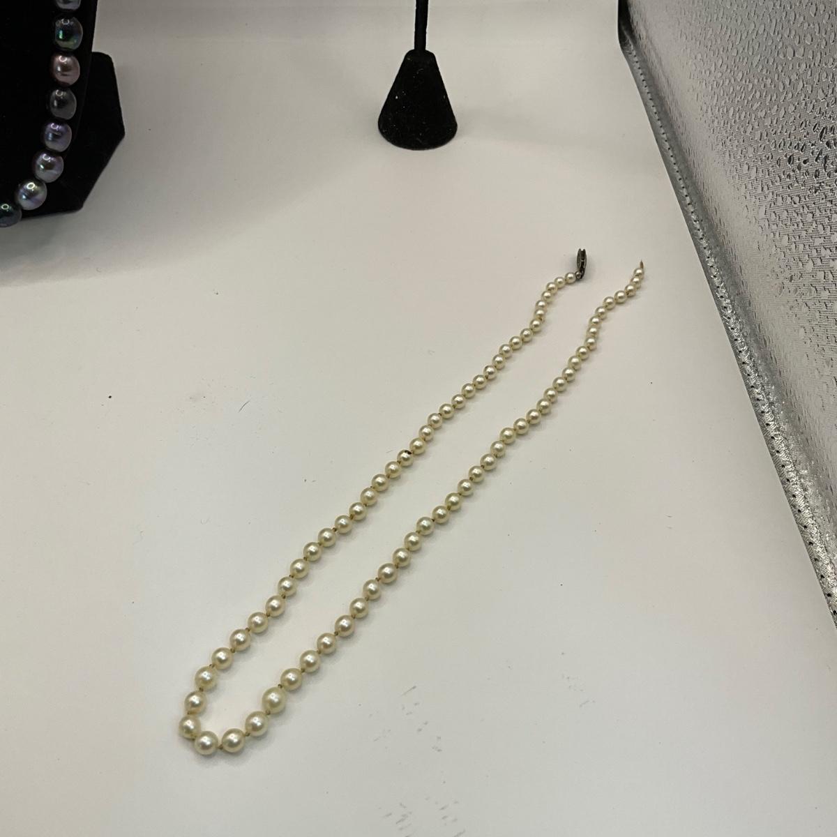 Freshwater pearl necklace measures 22" and needs to restrung ( has been stretched) with 16" cultured pearl necklace , quartz and freshwater necklace with sterling claps is 18" and one pair of screwback silver glass ball drop earrings