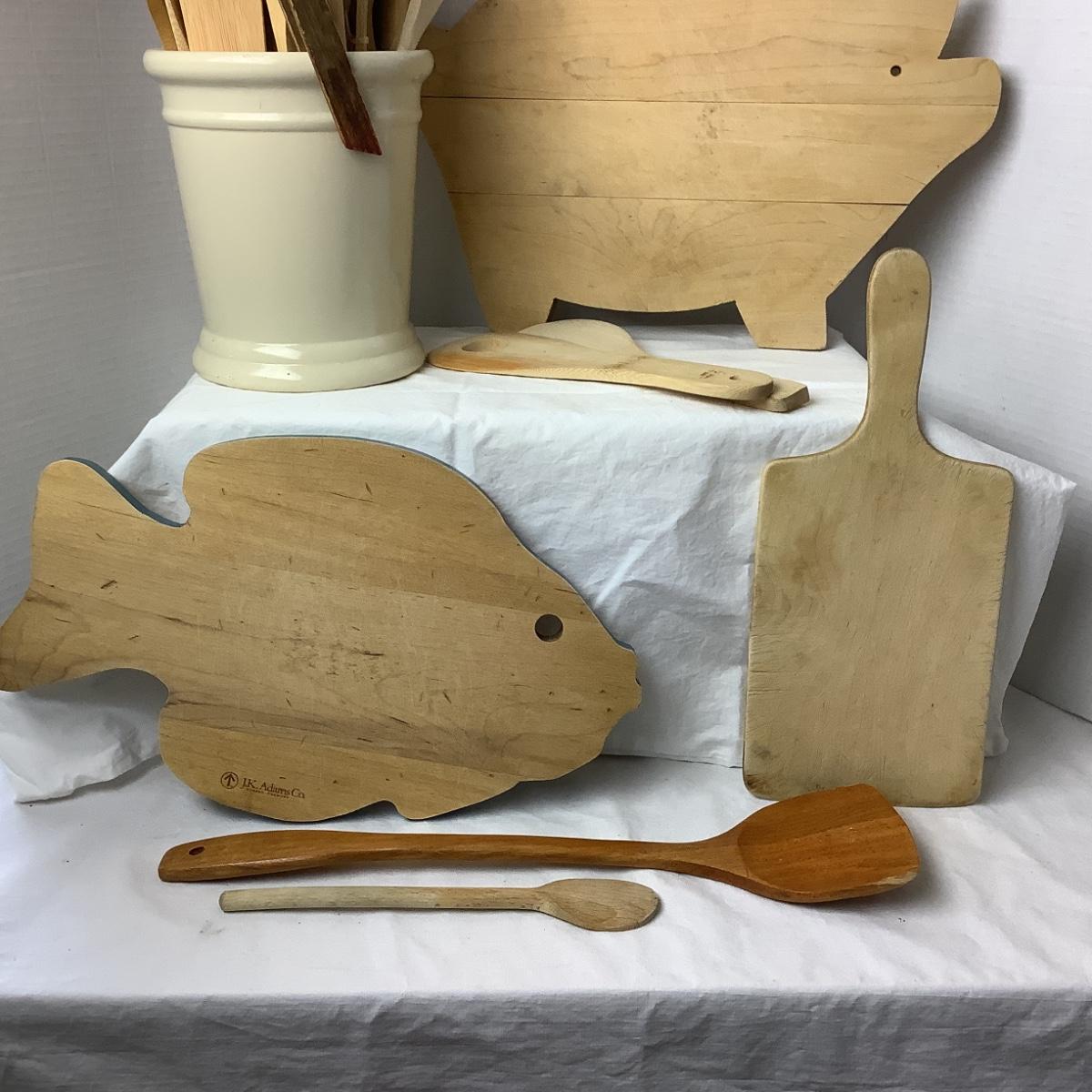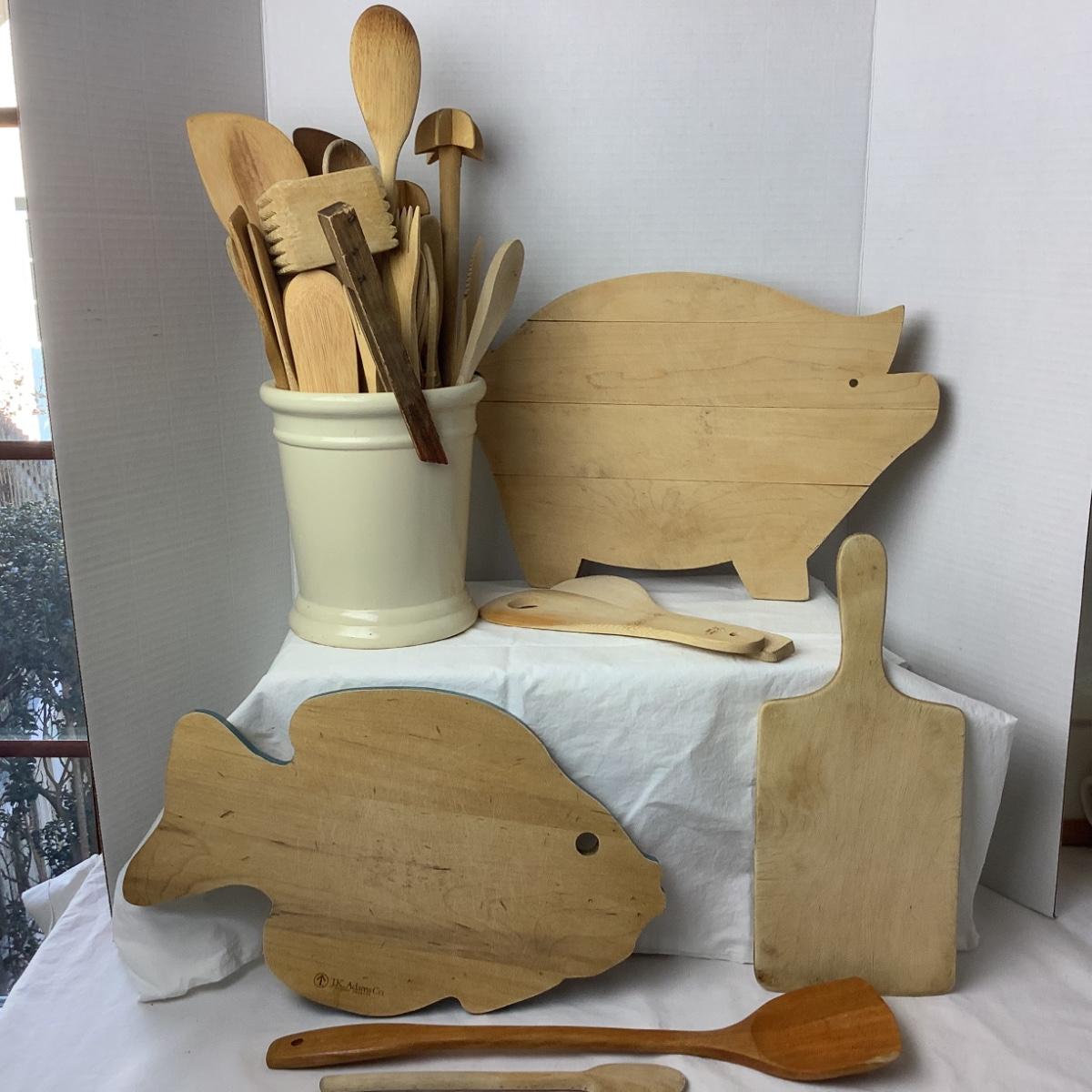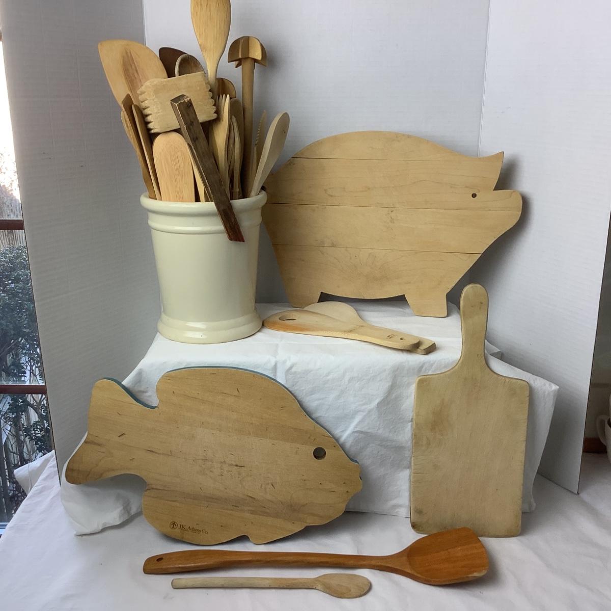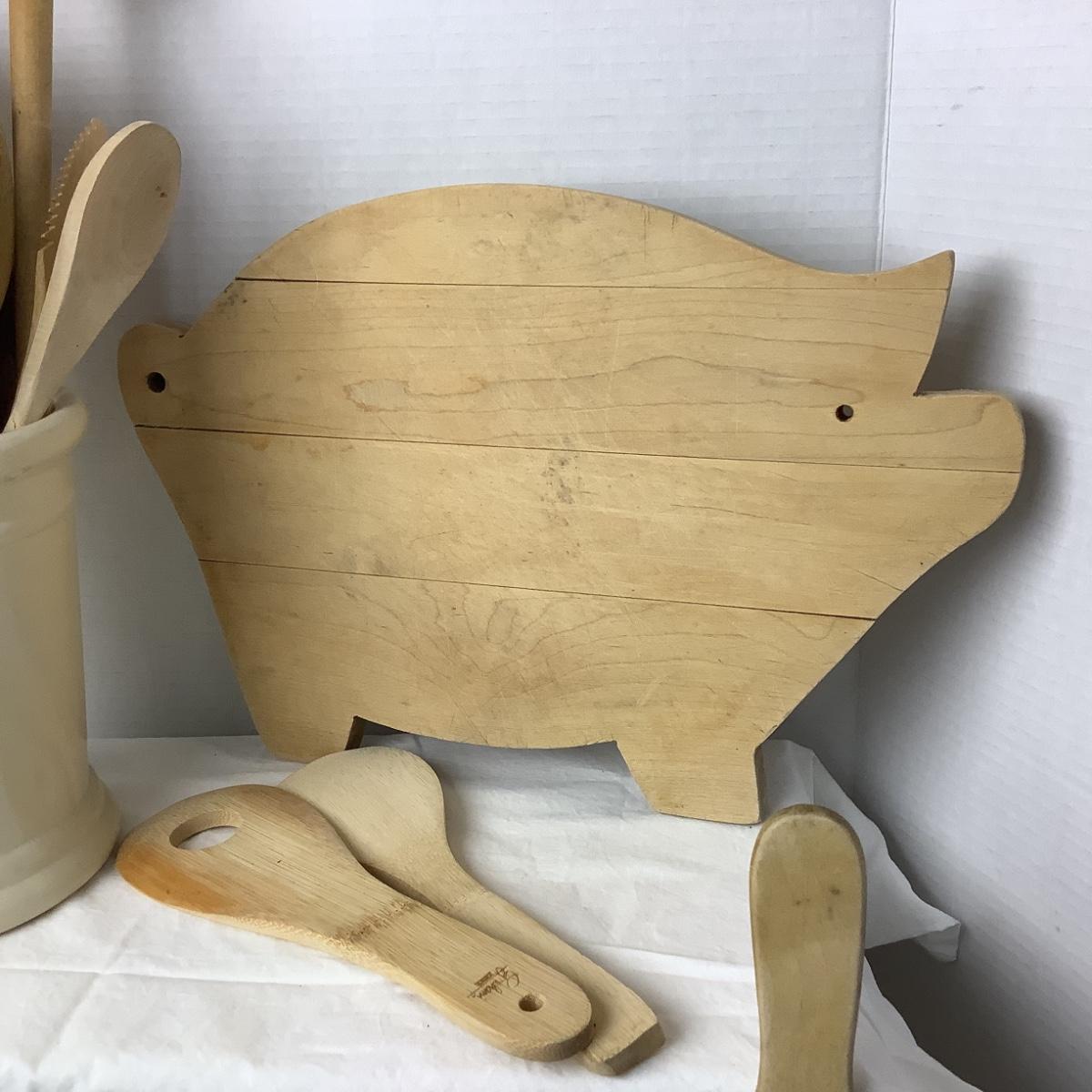 744 Wooden Kitchen Utensil Lot with Pottery Jar, Pig & Fish Wooden Cutting Boards