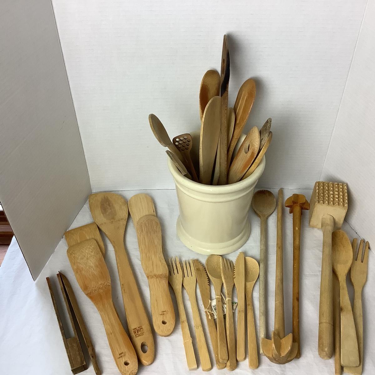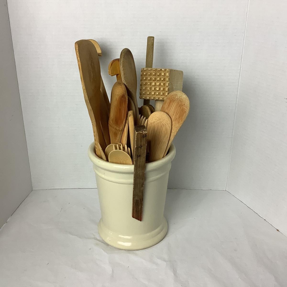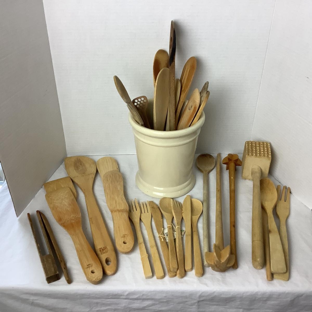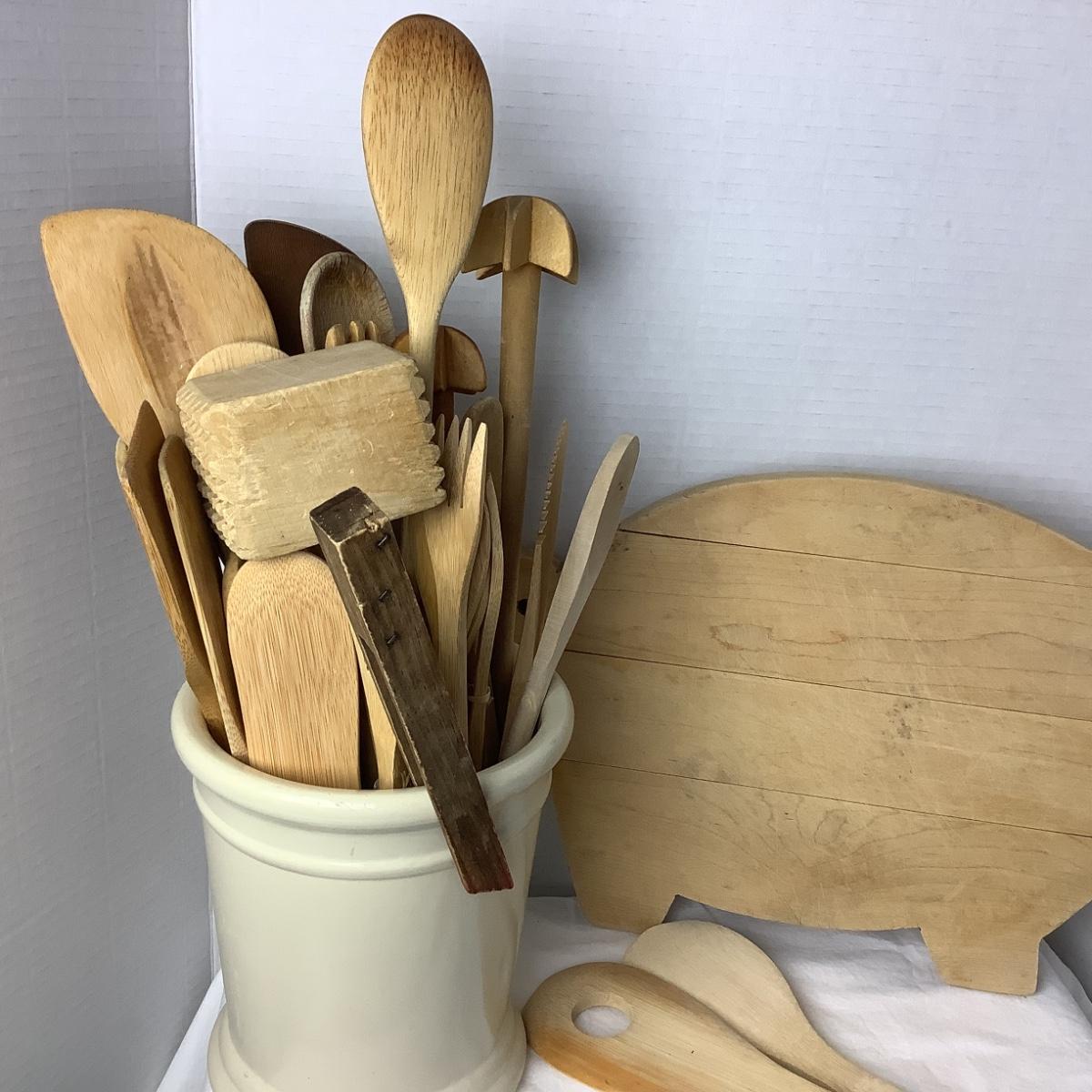 744 Wooden Kitchen Utensil Lot with Pottery Jar, Pig & Fish Wooden Cutting Boards
