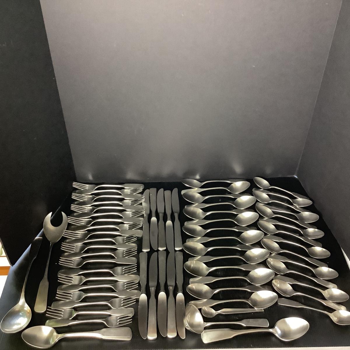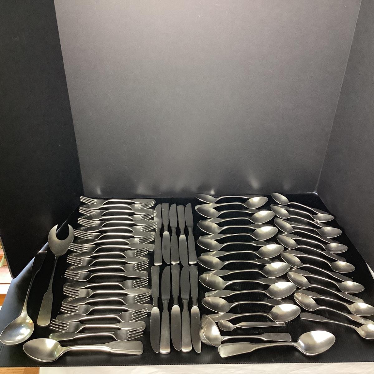 12 Knives, 16 tablespoons, 16 teaspoons, 9 dinner forks, 13 salad forks, 4 serving spoons, salad set , ladle, one sugar, 1 seafood fork
