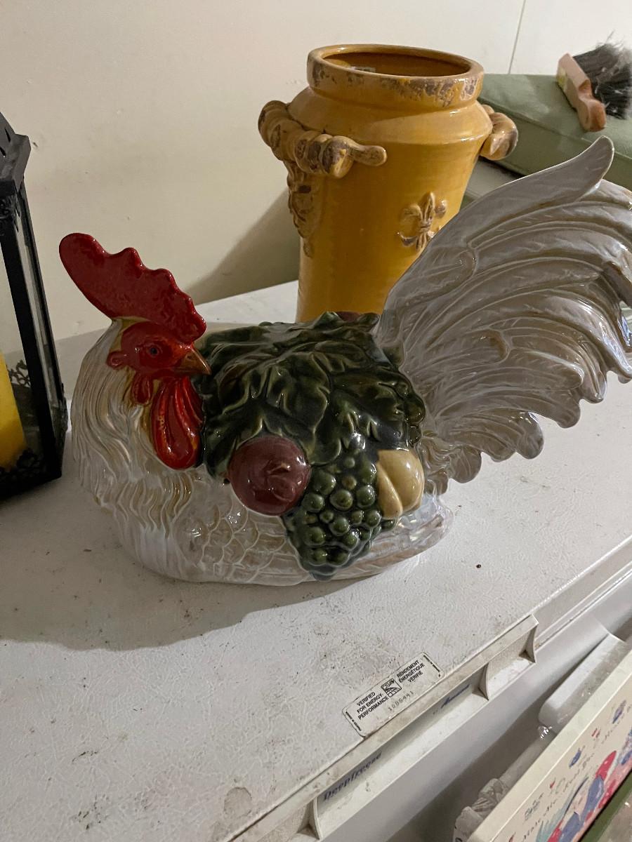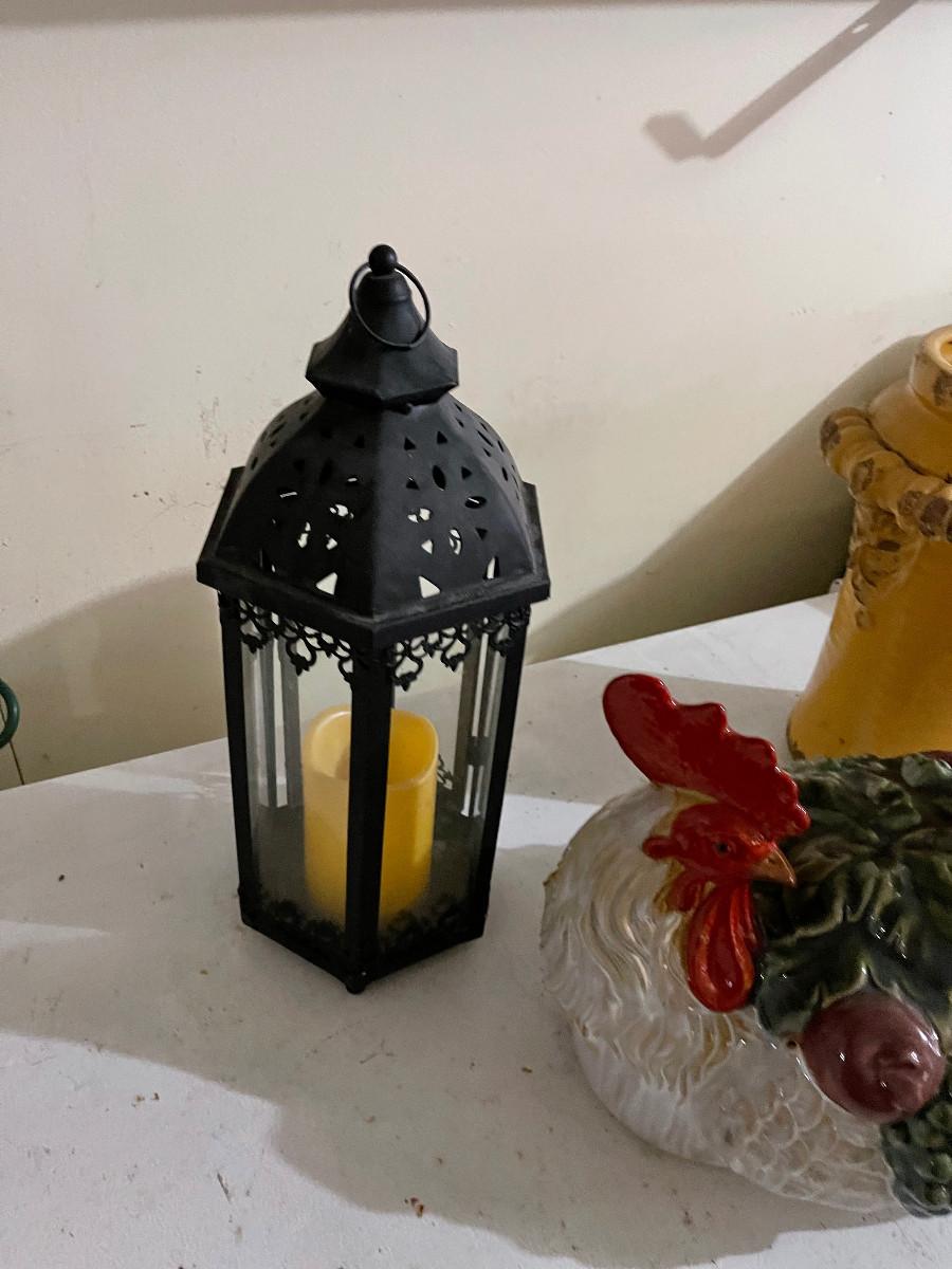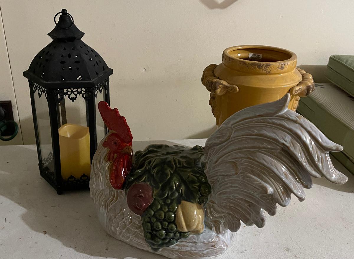 #746 G- Decorative Items: Rooster, Metal  Candle Lantern, Mustard Vase