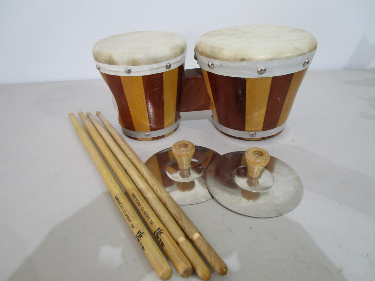 #75 Bongo Drums, toy cymbals, 4 drum sticks