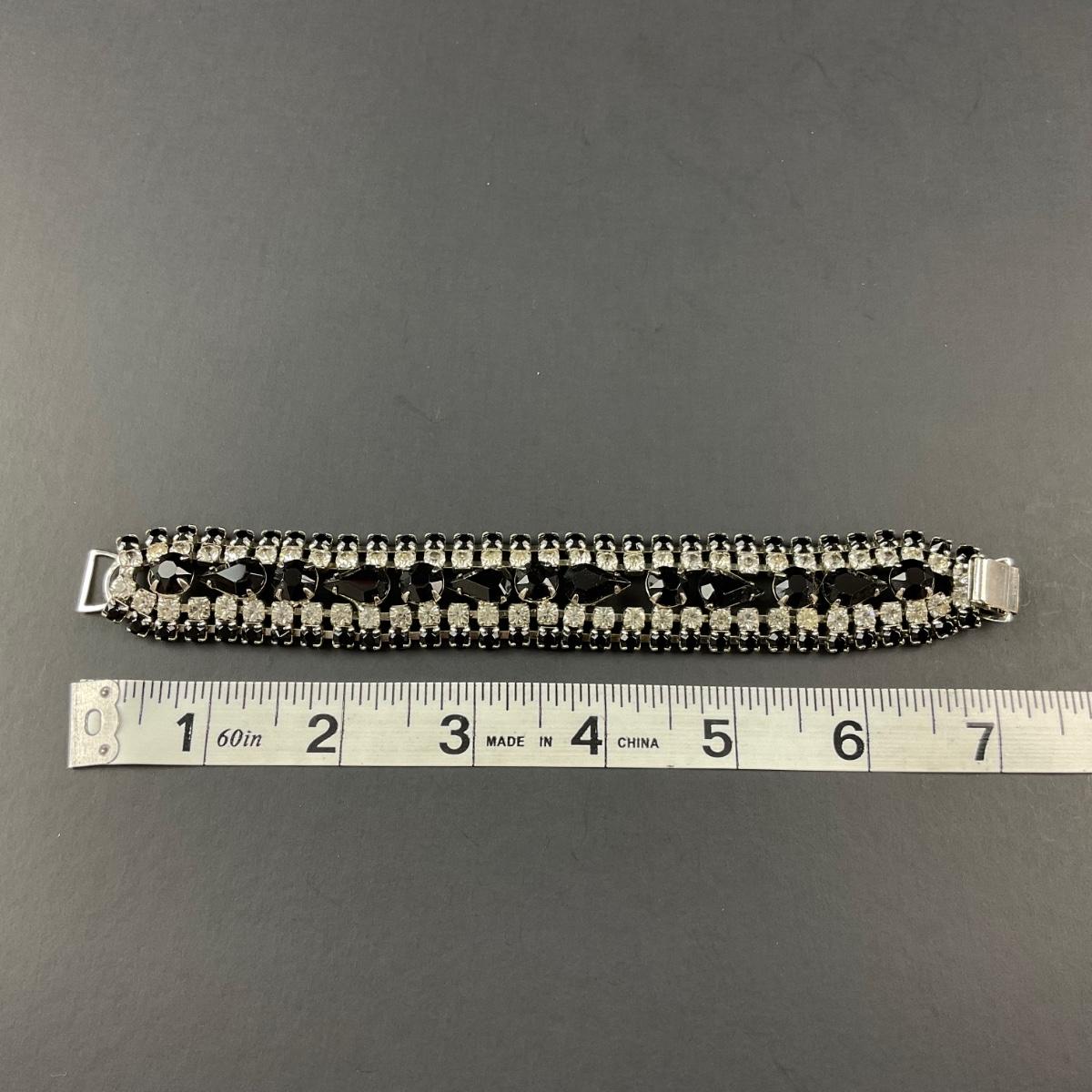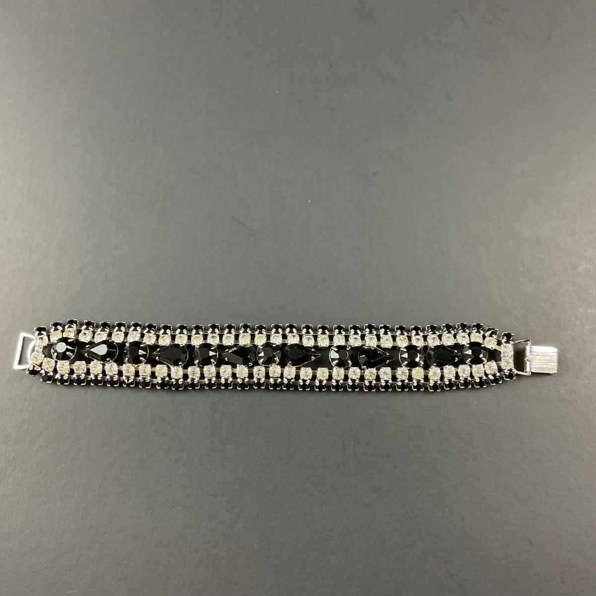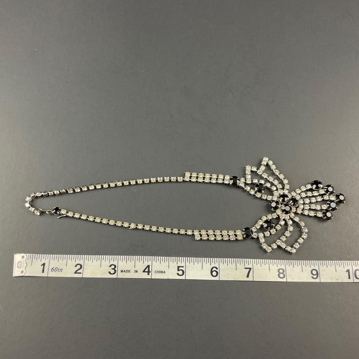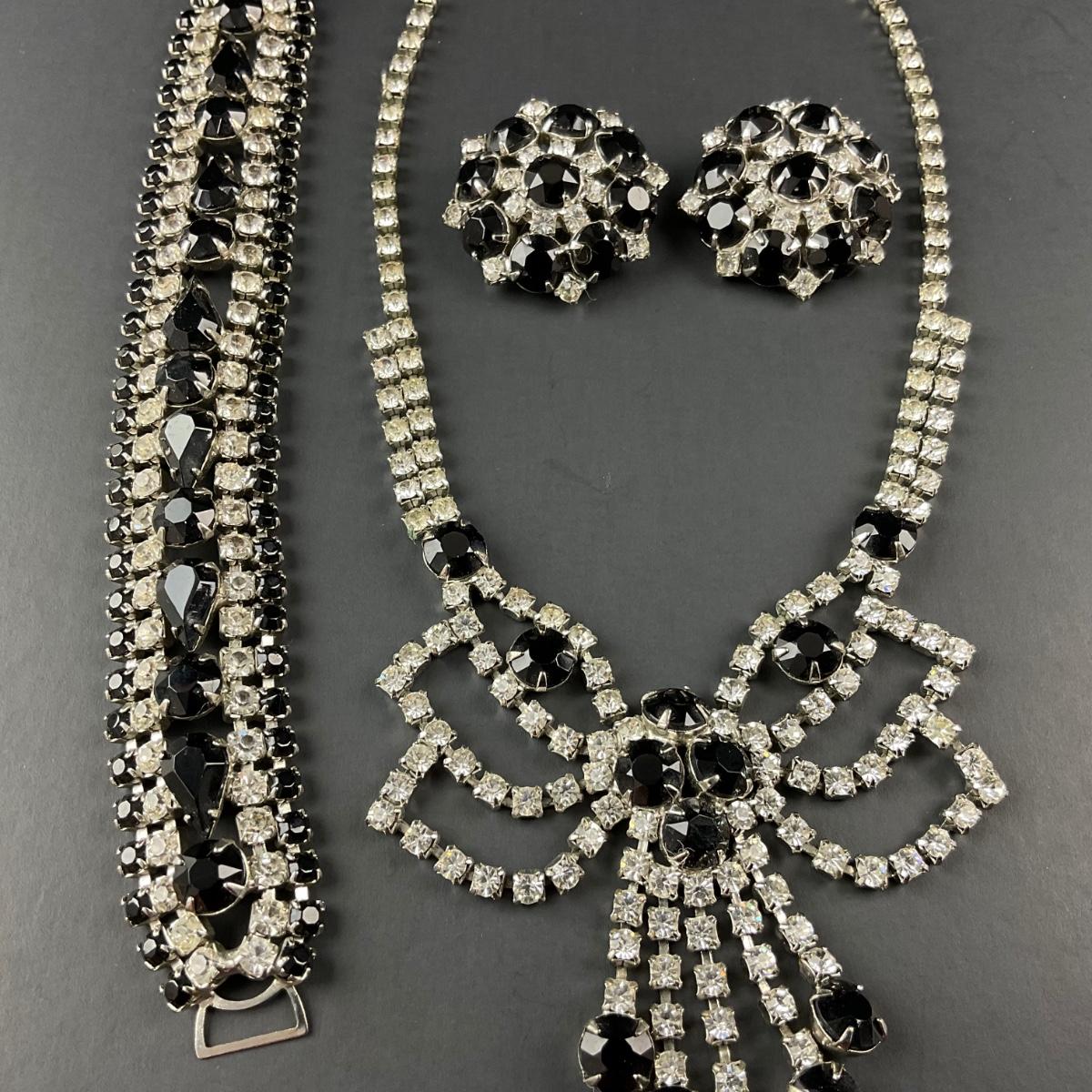 Four pieces of mixed black and rhinestone jewelry including, one rhinestone necklace, clip earrings, and a bracelet. This piece has no damage, and appears to be in great shape with no visable chips, cracks, or broken pieces. Please see photos for details and condition. Any condition statement is given as a courtesy to a client, is an opinion, and should not be treated as a statement of fact. Reference to condition written, oral or within a condition report shall not be regarded as a full account of condition and may not include all defects, alterations, or restorations. Absence of a condition report does not imply a lot is flawless or lacking imperfections or damage. Katherine’s Auction & Appraisal Service shall have no responsibility for any error or omission. Returns shall not be accepted on the basis of condition. ::: Shipping is available on this lot. If you require shipping you must let us know at the close of the auction. We will coordinate with you after the item has been won. Shipping fees will include insurance up to or exceeding the value of all items being mailed. If you have any questions regarding this lot please contact the auctioneer either via this website, by direct email or by phone. PICK UP TIMES and other important information can be found in the TERMS and DESCRIPTION of the auction. Please take a look for pertinent information. Thanks!