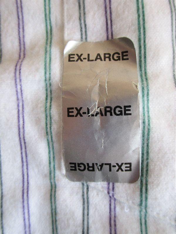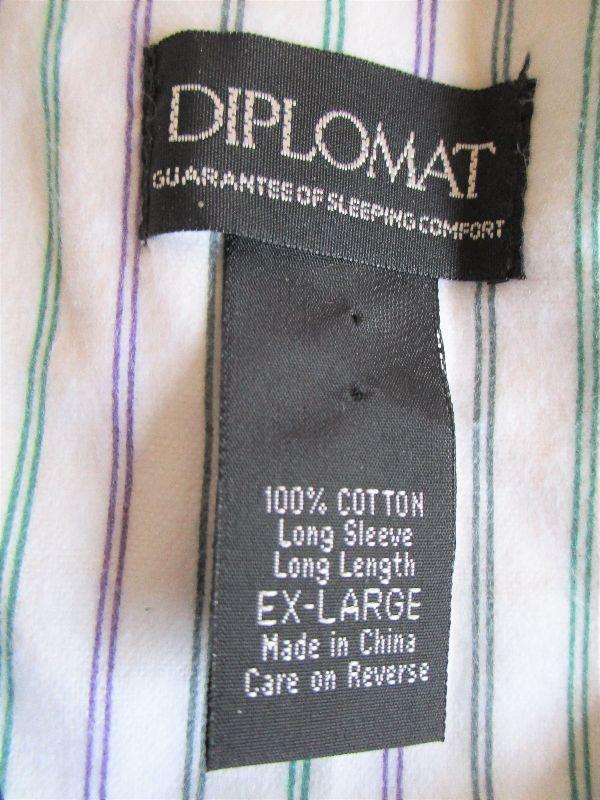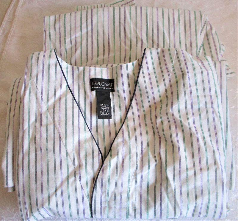 Diplomat brand pajamas, Extra Soft 100% cotton, White with dark green, light green, and purple stripes, Navy blue trim, pullover top and long pants