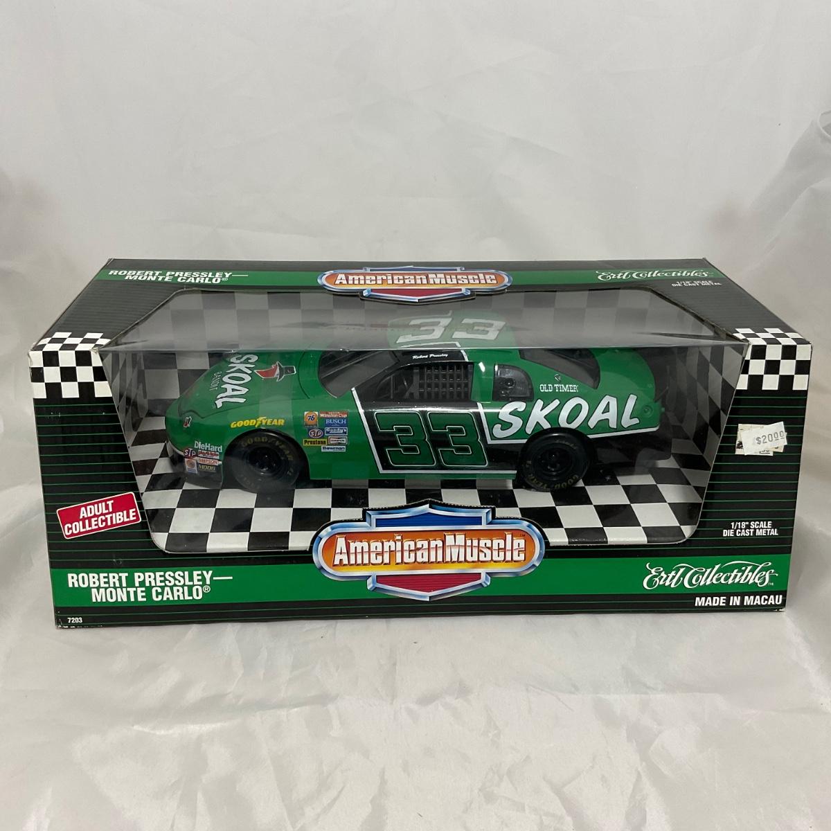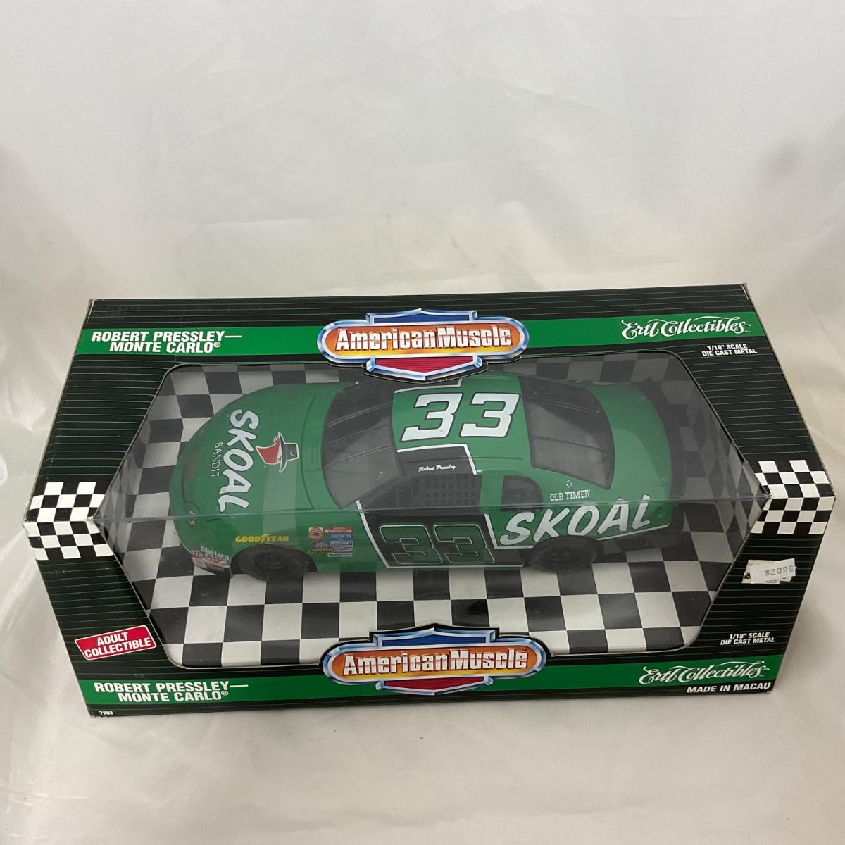 One NASCAR die cast 1:18 scale Skoal Monte Carlo in box. Driver Robert Pressley. Please see photos for details and condition. ::: Shipping is available on this lot. If you require shipping you must let us know at the close of the auction. We will coordinate with you after the item has been won. Shipping fees will include insurance up to or exceeding the value of all items being mailed. If you have any questions regarding this lot please contact the auctioneer either via this website, by direct email or by phone. PICK UP TIMES and other important information can be found in the TERMS and DESCRIPTION of the auction. Please take a look for pertinent information. Thanks!