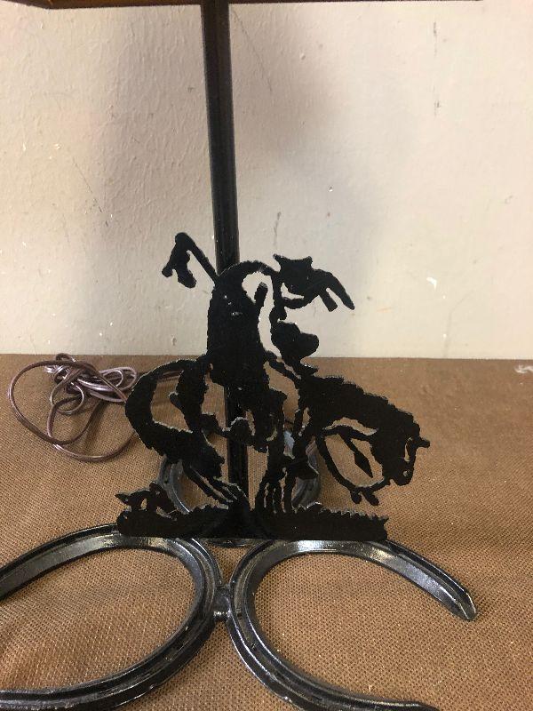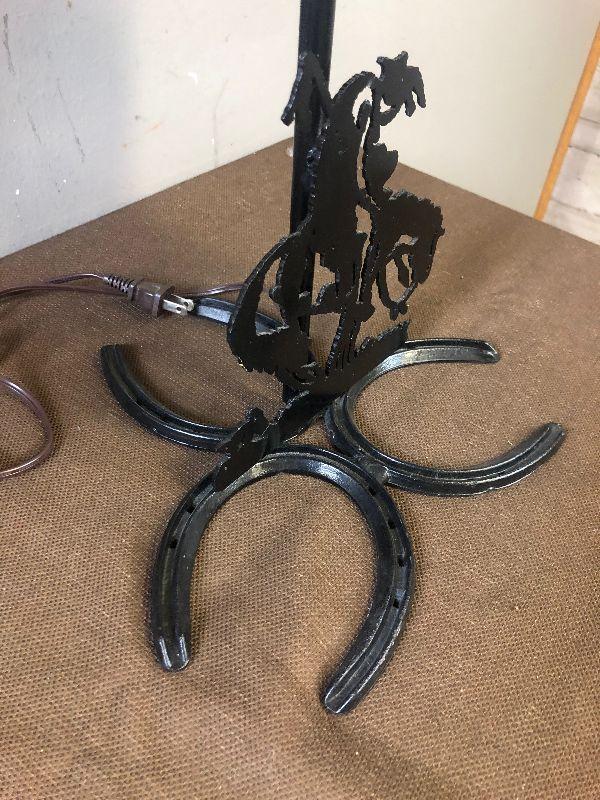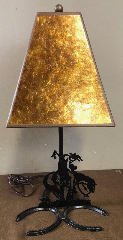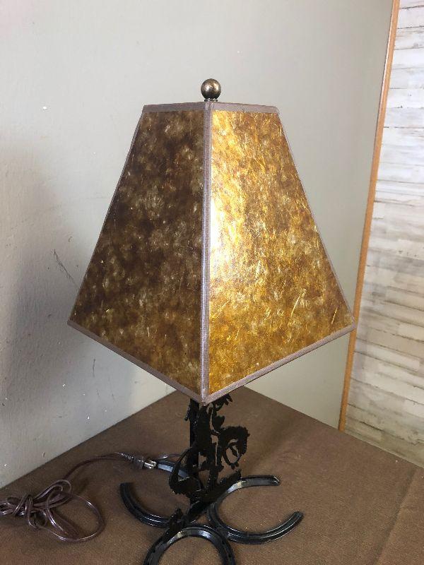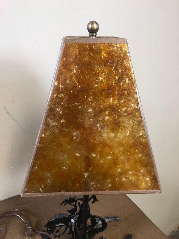 23 inches high. Black Metal with a Mica Rust colored Shade in Very Good Condition!