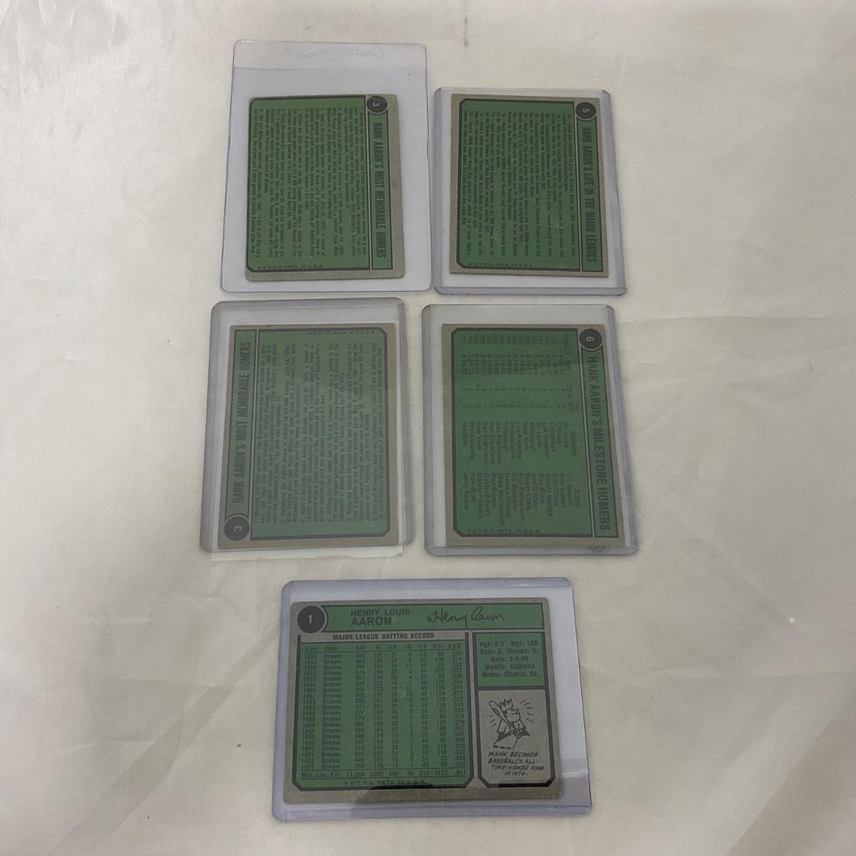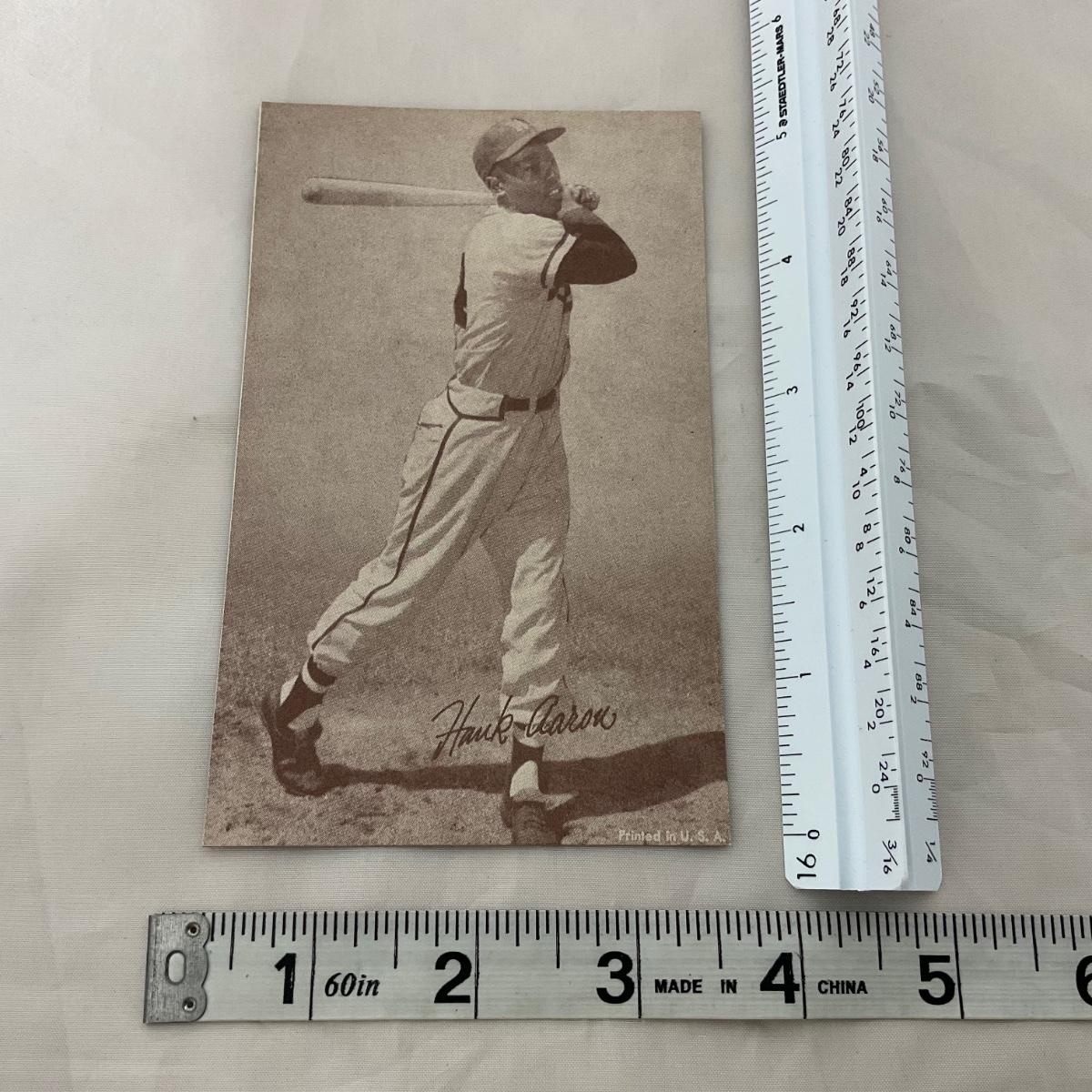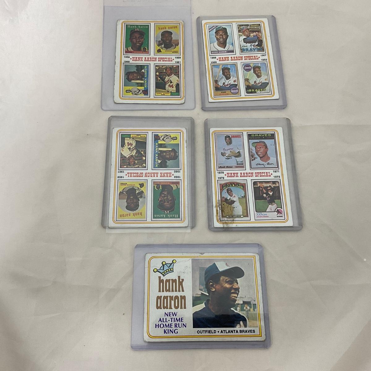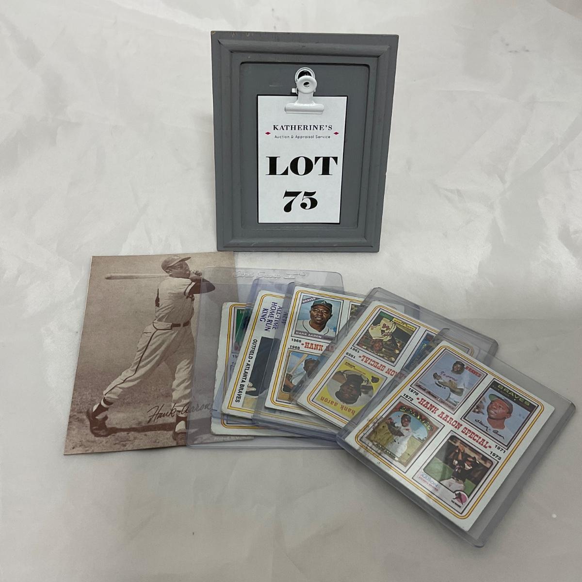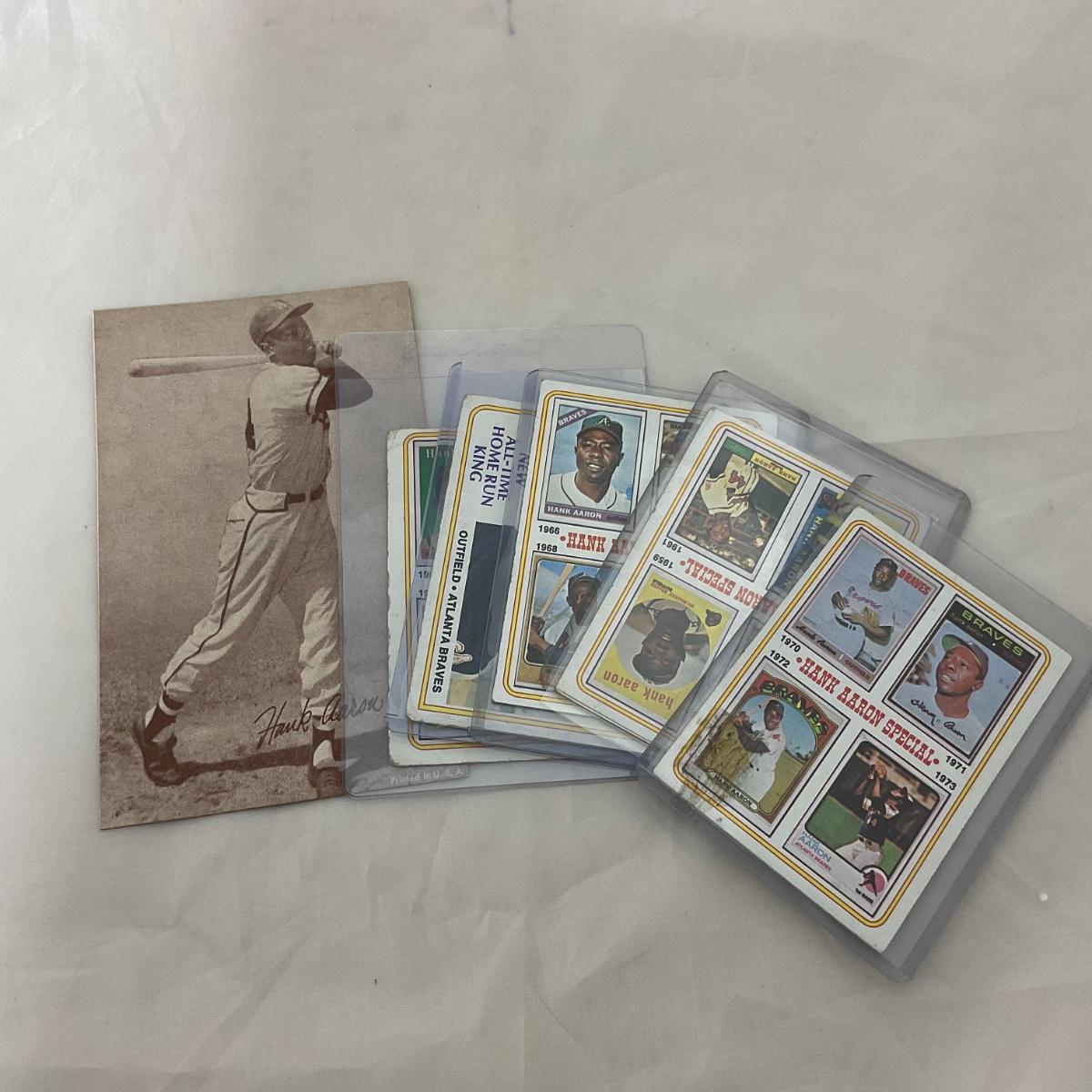 Group of Hank Aaron cards and photo. Please see photos for details and condition. ::: Shipping is available on this lot. If you require shipping you must let us know at the close of the auction. We will coordinate with you after the item has been won. Shipping fees will include insurance up to or exceeding the value of all items being mailed. If you have any questions regarding this lot please contact the auctioneer either via this website, by direct email or by phone. PICK UP TIMES and other important information can be found in the TERMS and DESCRIPTION of the auction. Please take a look for pertinent information. Thanks!