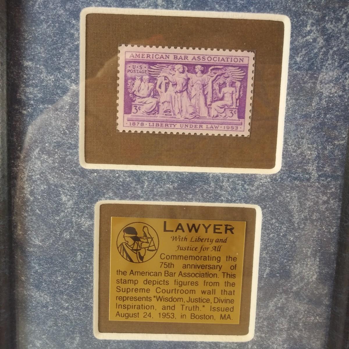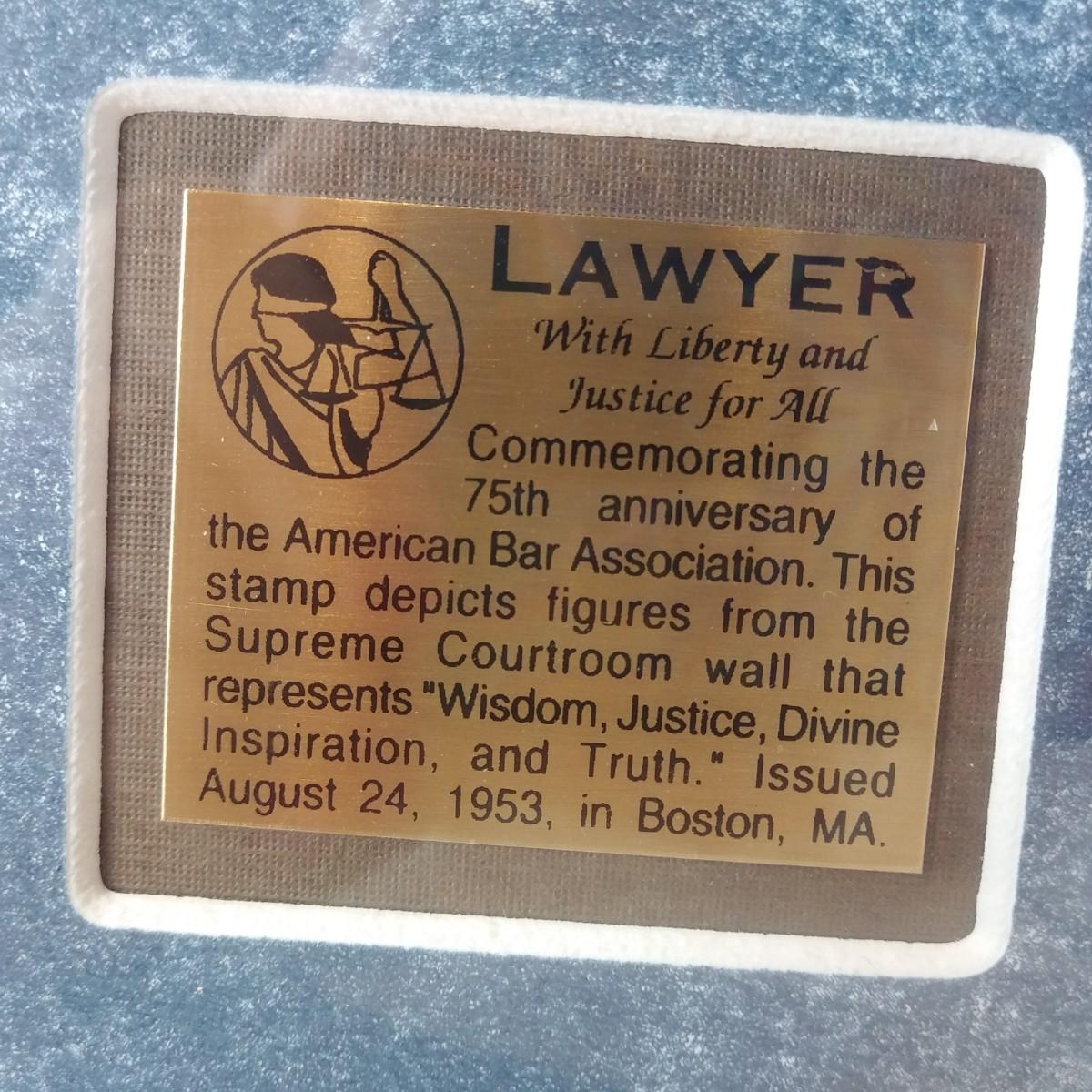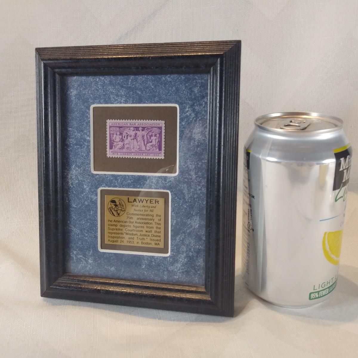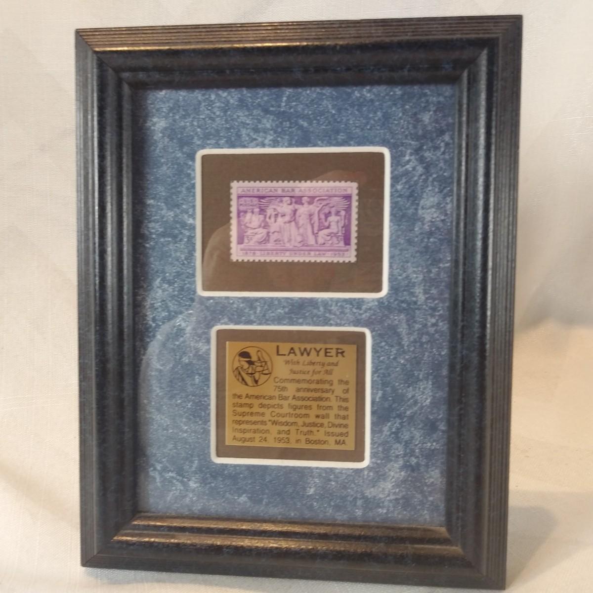 This auction lot is for a 75 Year Commemorative "Lawyer" Stamp. The framed "Lawyer" stamp commemorates the 75 years when it was first issued in 1953, It is in a 5 x 7-inch stand-up frame and nicely matted. Perfect gift for that lawyer friend.