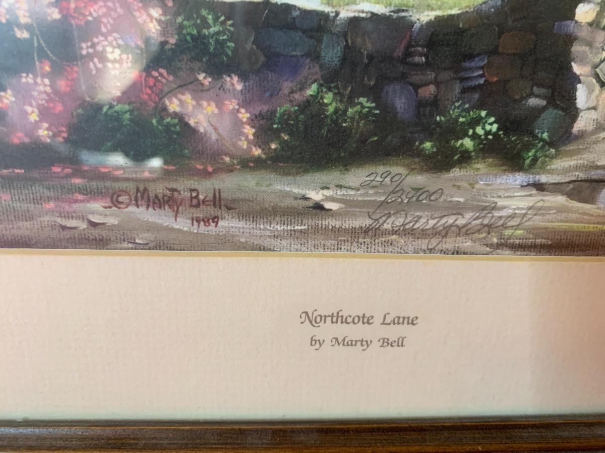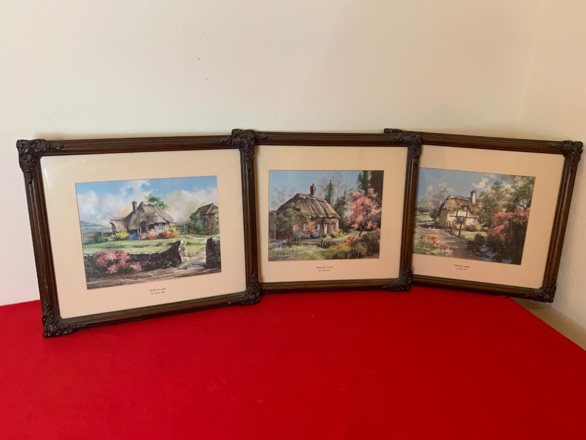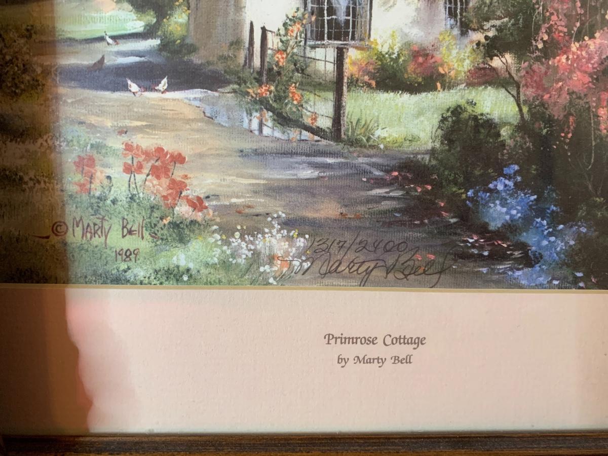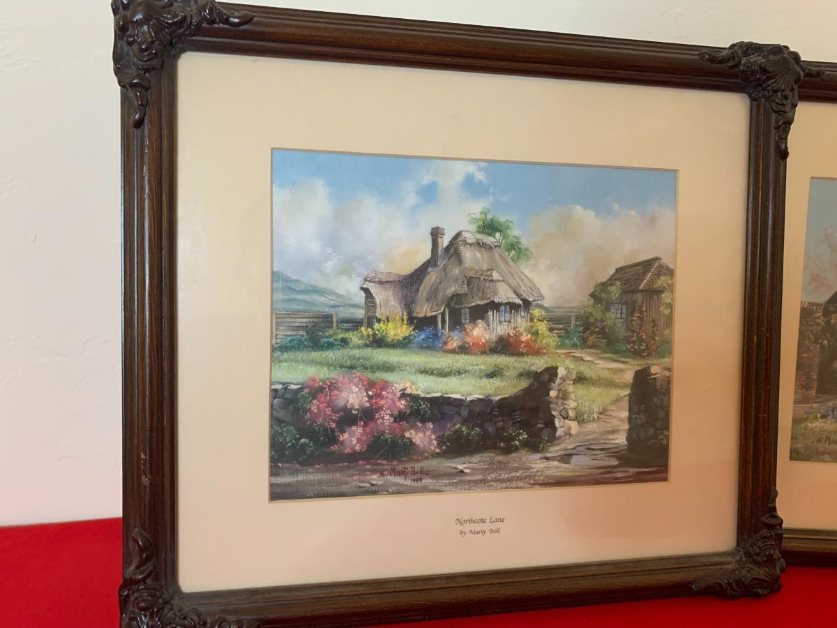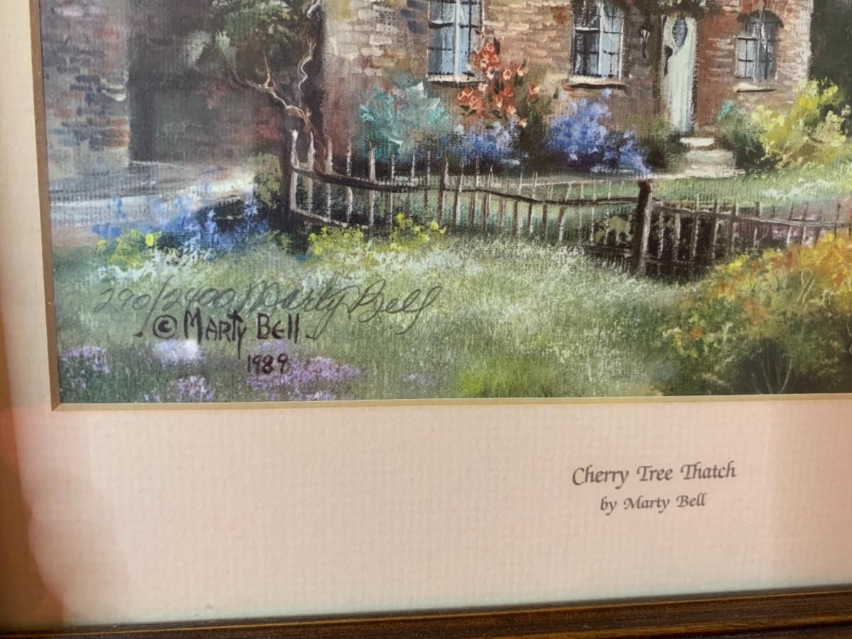 Lot includes 3 smaller Marty Bell prints in ornate wood frames. Depict cottages. Northcoat Lane 290/2400, Cherry Tree Thatch 290/2400, Primrose Cottage 1317/2400. Great condition.
