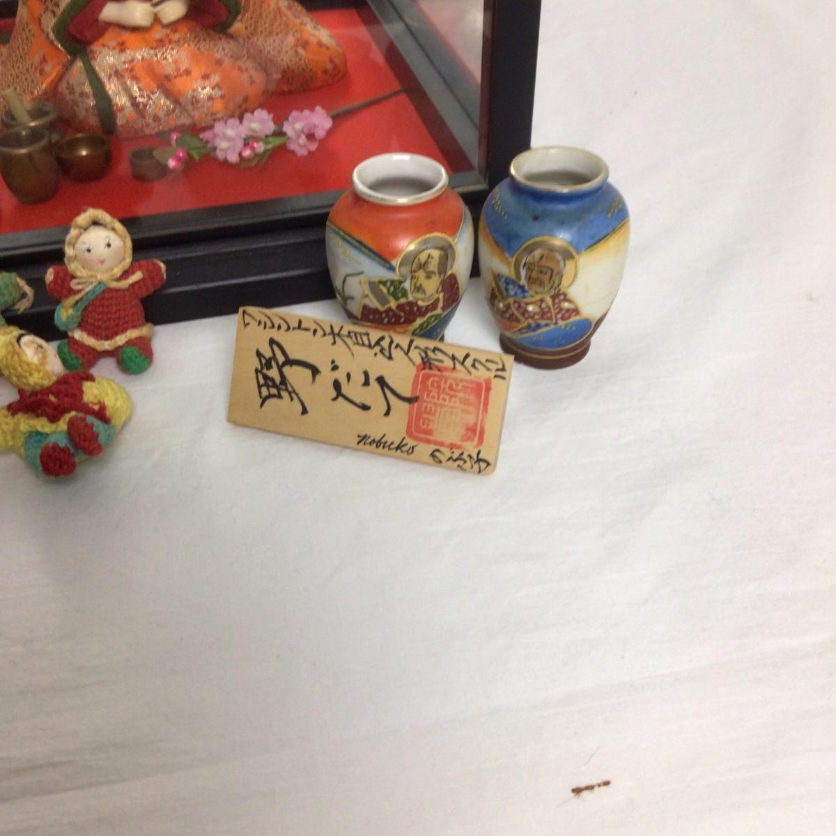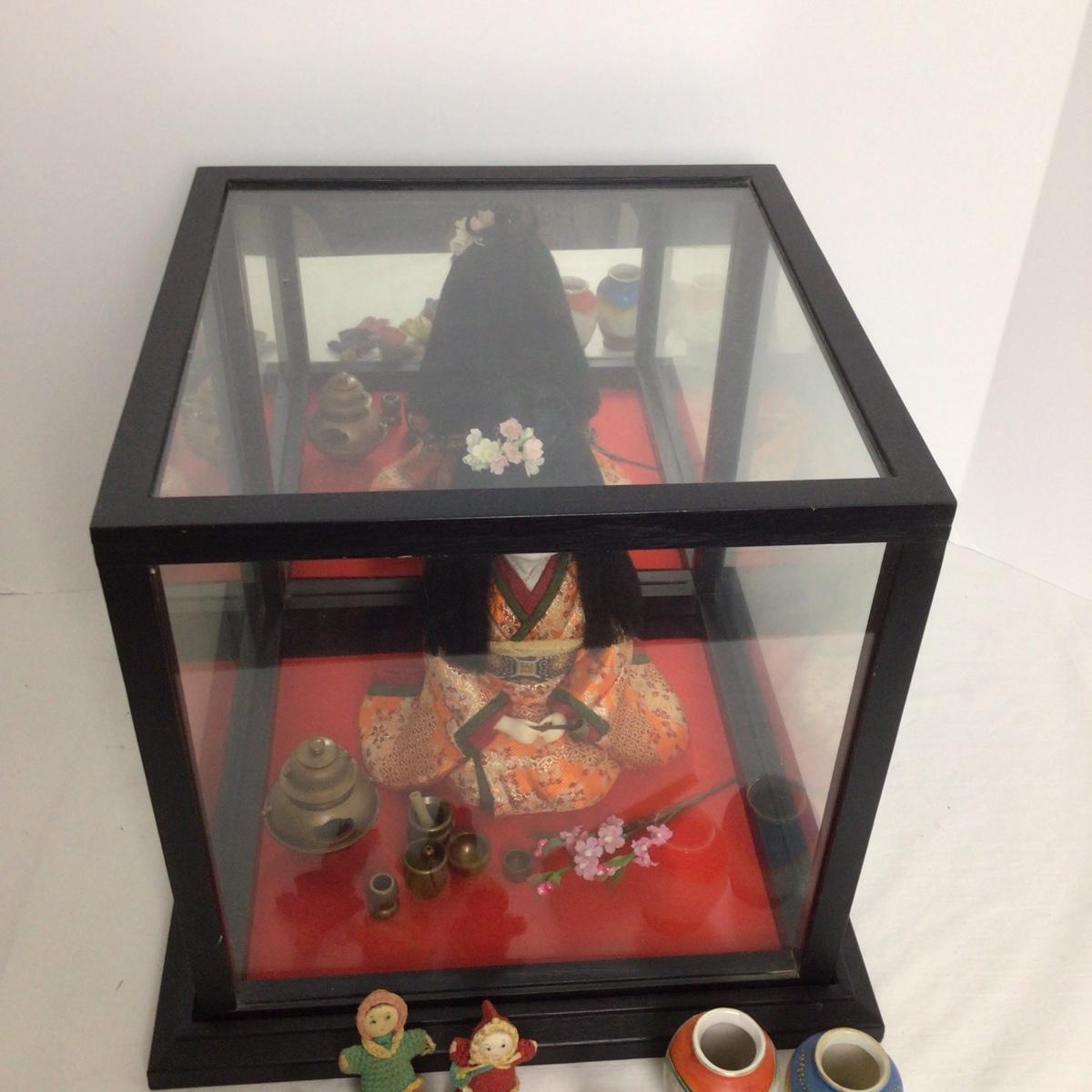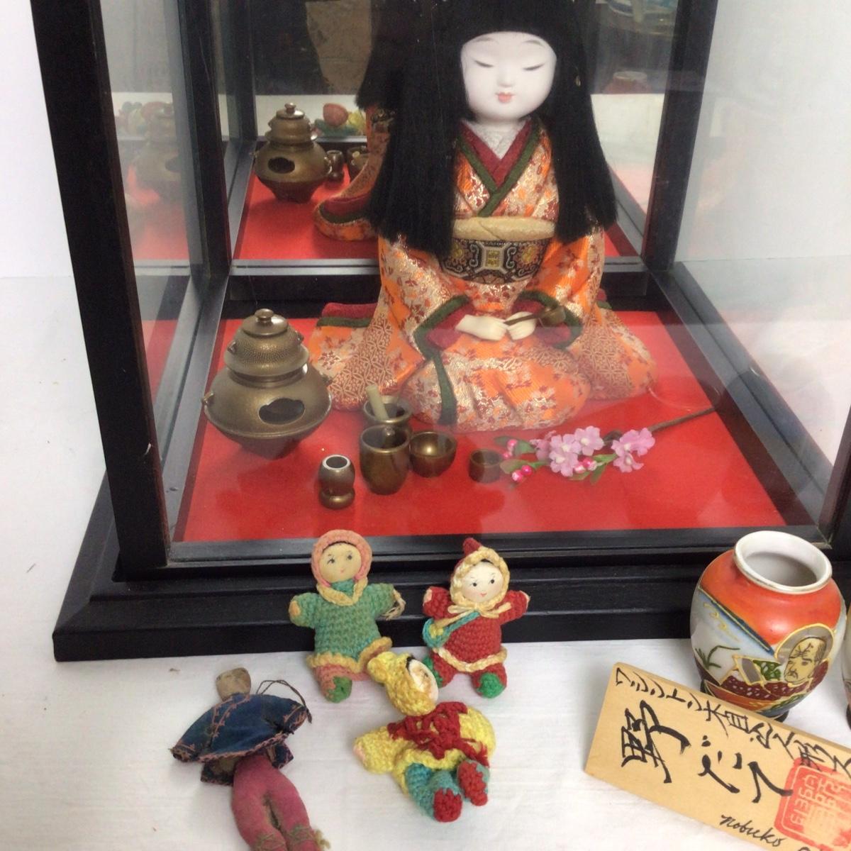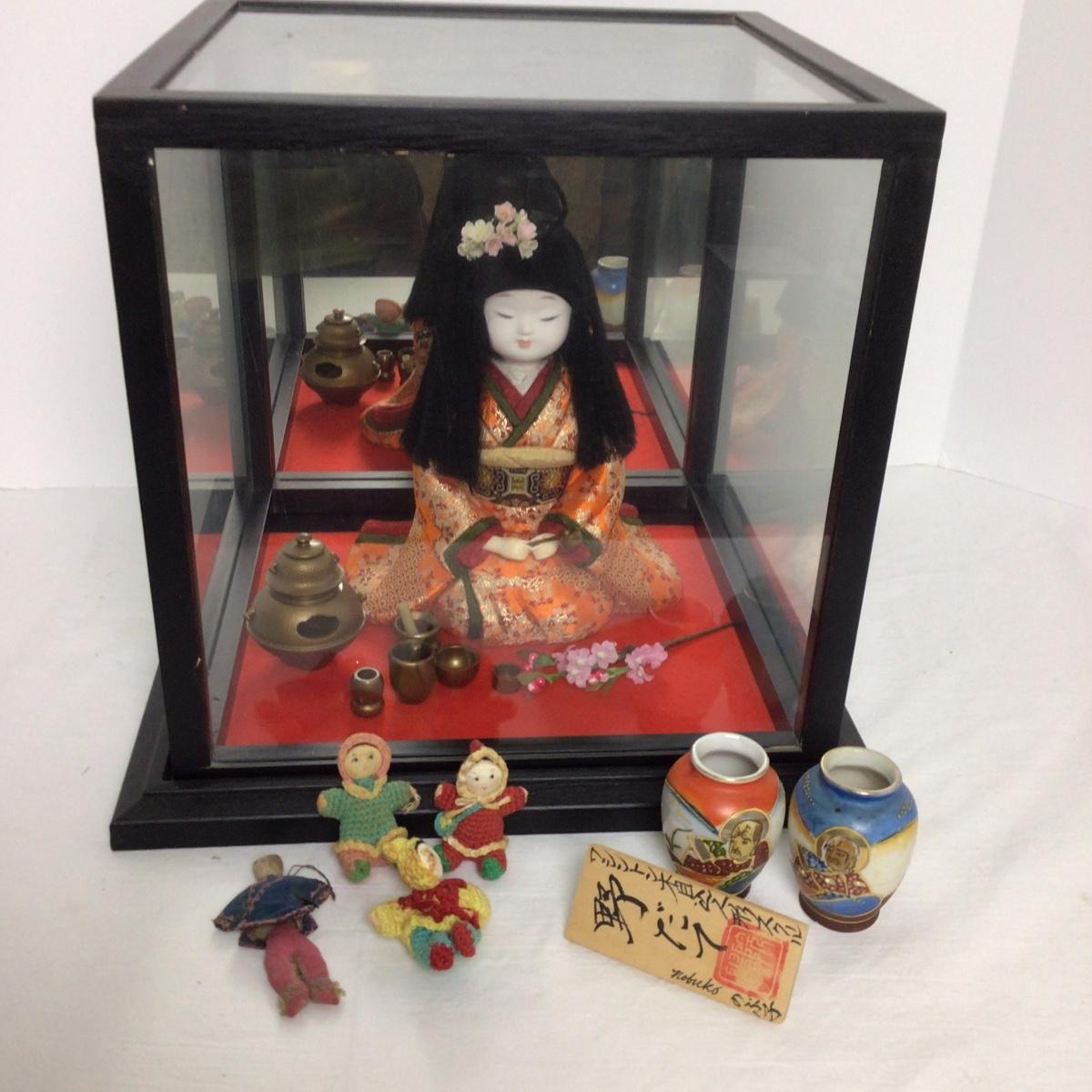 The doll is displayed in 18” display cube with assorted items, also included are some crocheted dolls and Satsuma miniature vases.