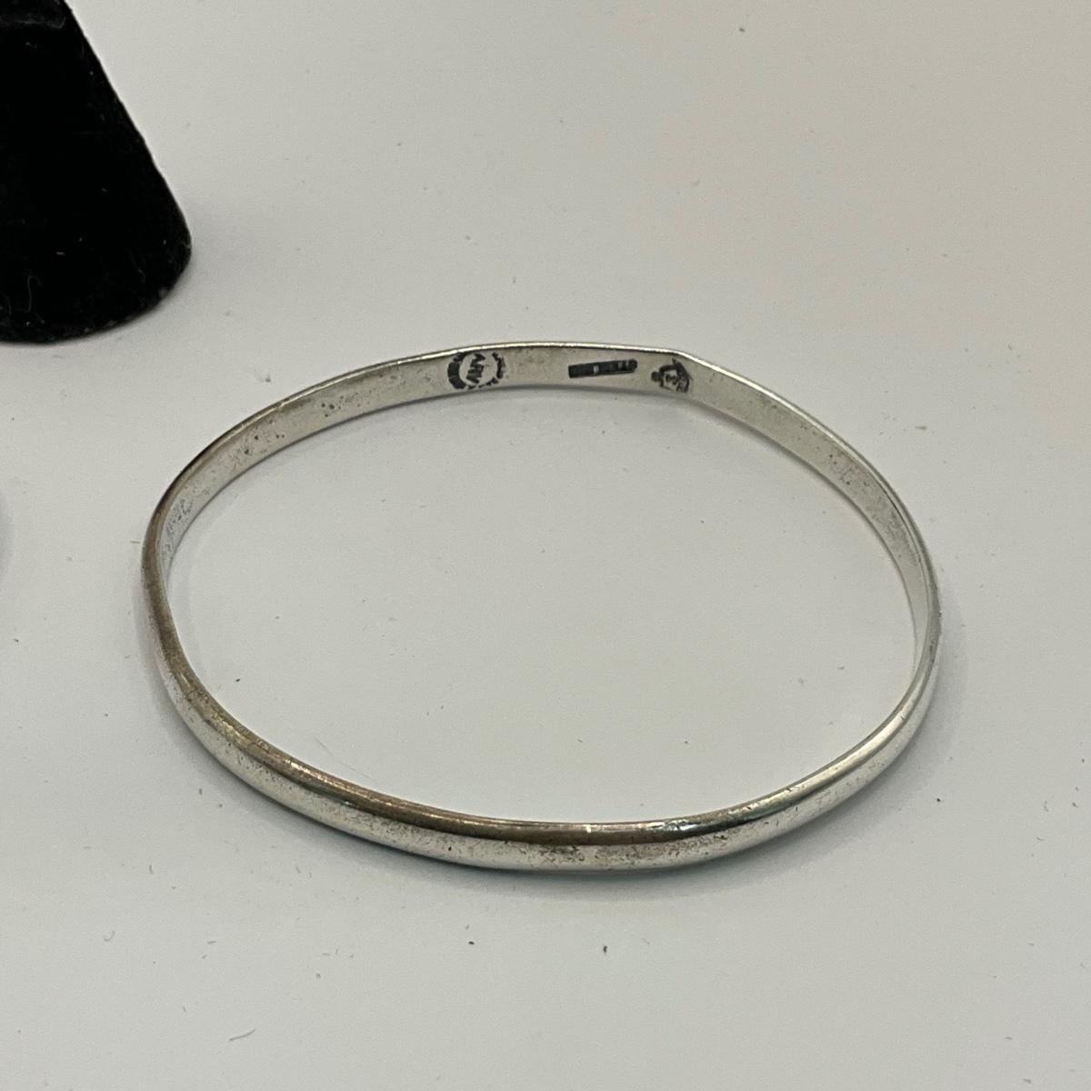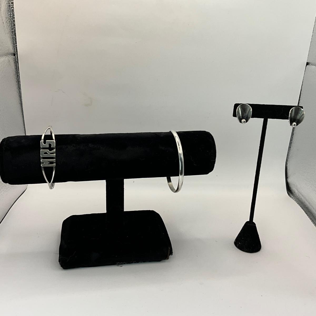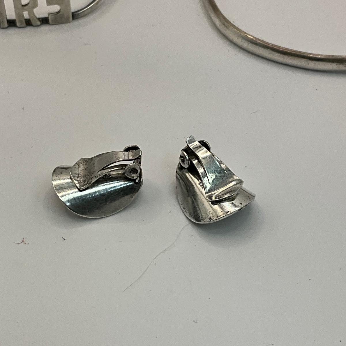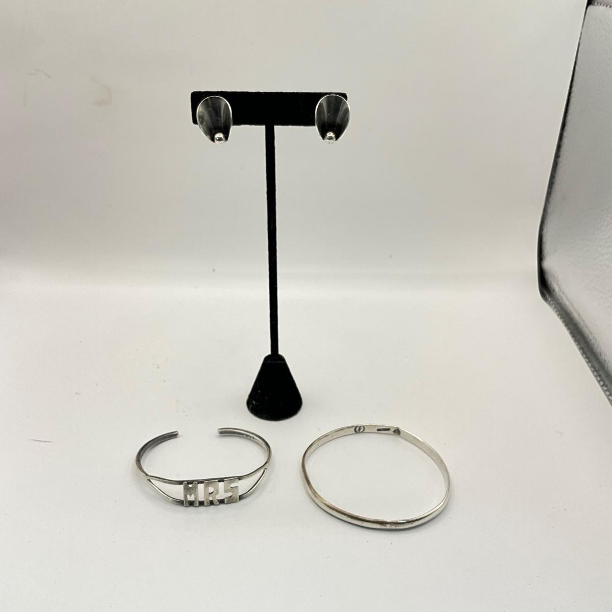 Initial cuff bracelet has no marks , slip on bangle bracelet is marked and the Denmark Clip Earrings are sterling and marked NR FROM DENMARK