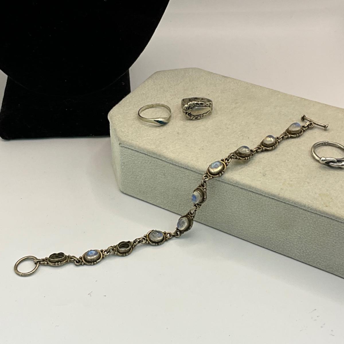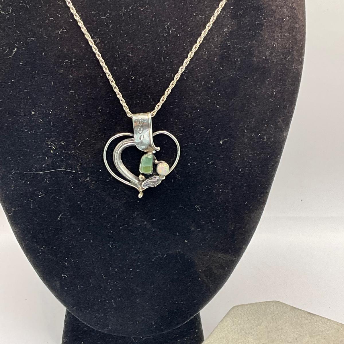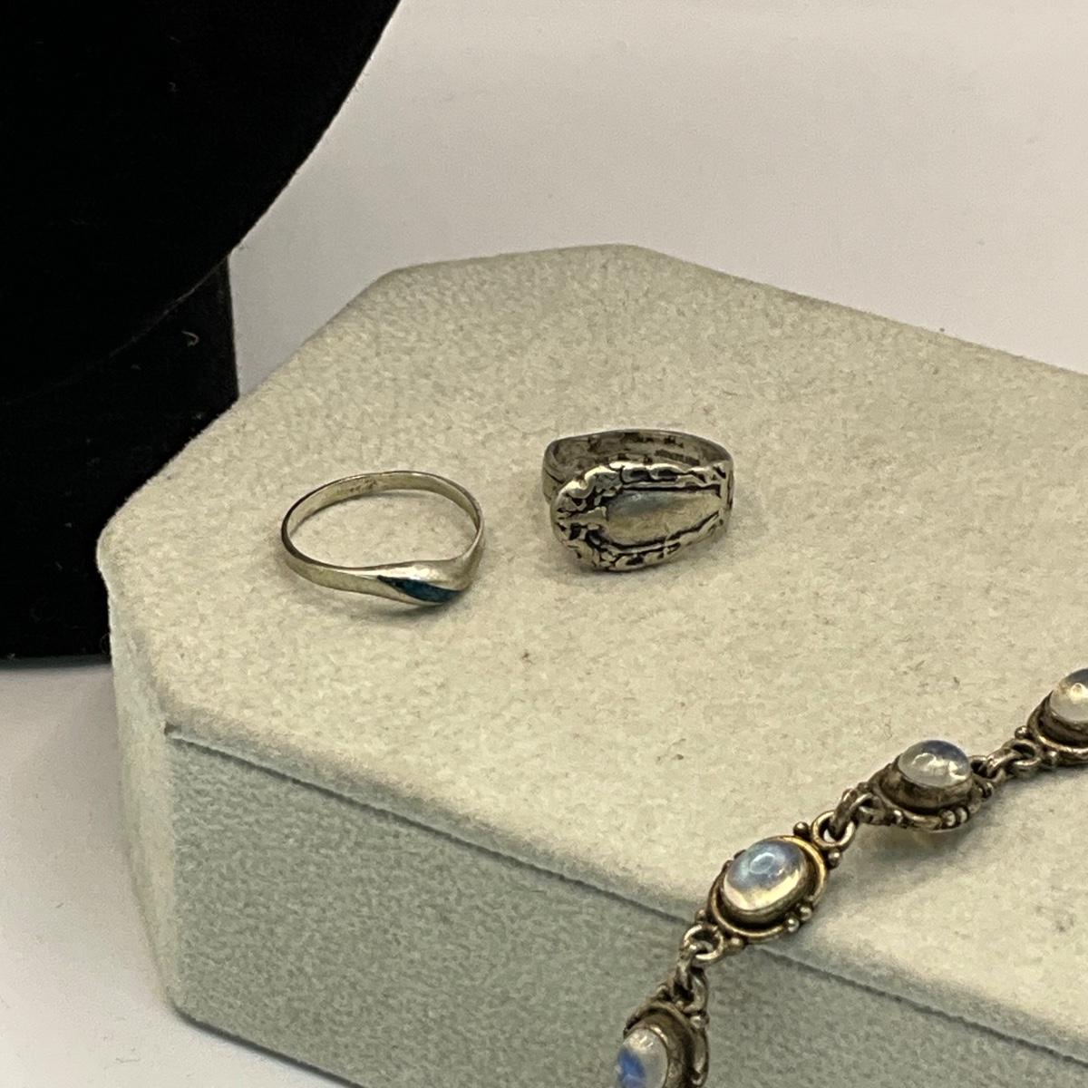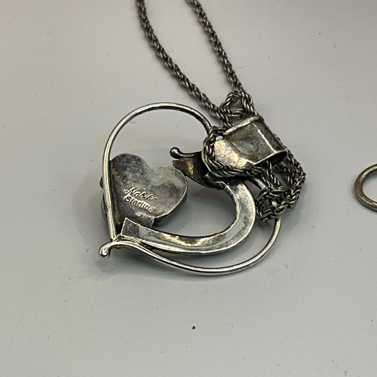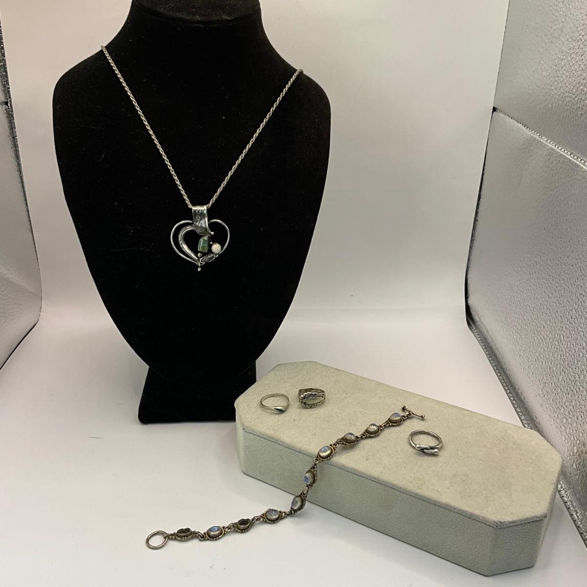 Vintage silver heart pendant 24" long with stones and 7" Labradorite bracelet (missing two stones) and two silver rings