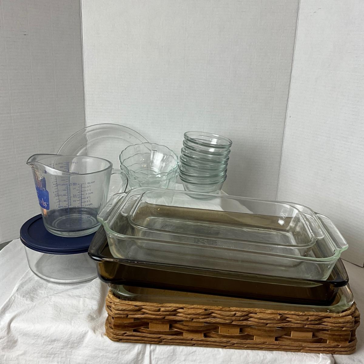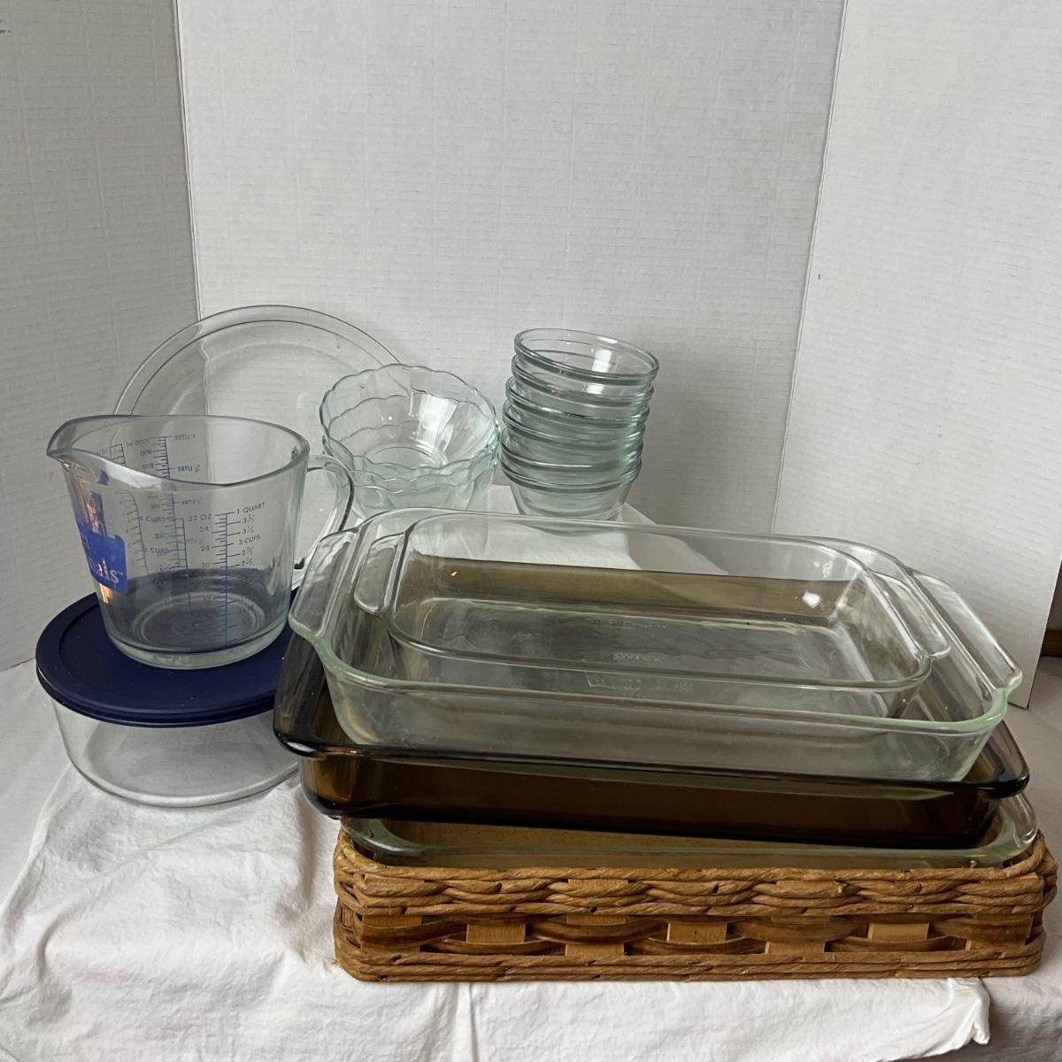 Round pie plate , small round dishes , Three clear pyrex with one brown pyrex and one carrying tray , and measuring cup with covered glass storage dish