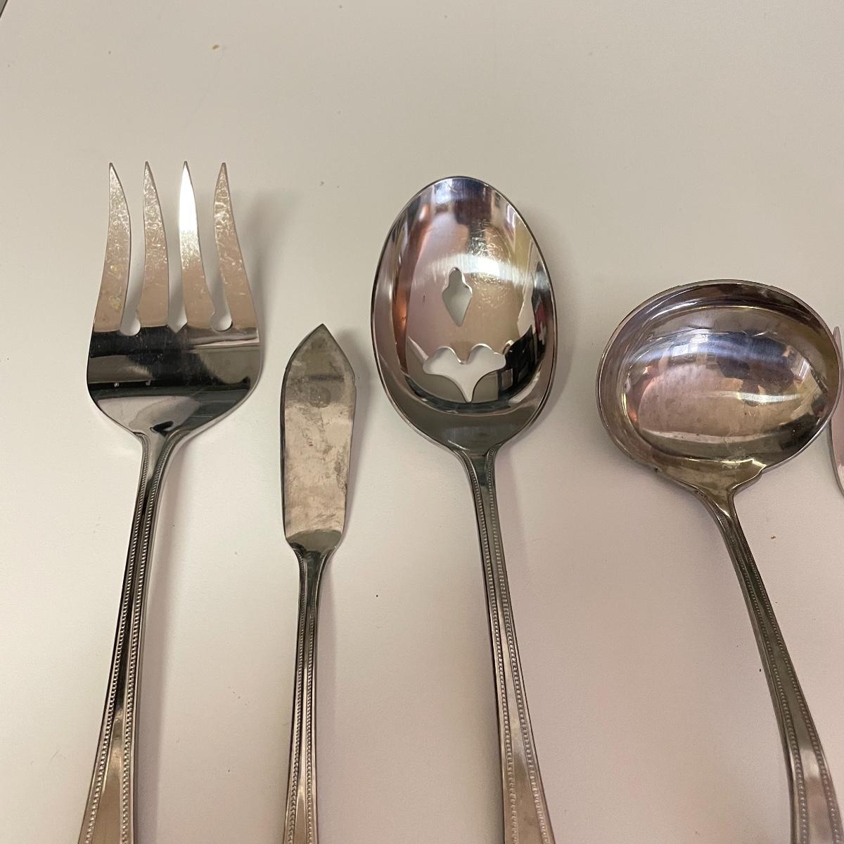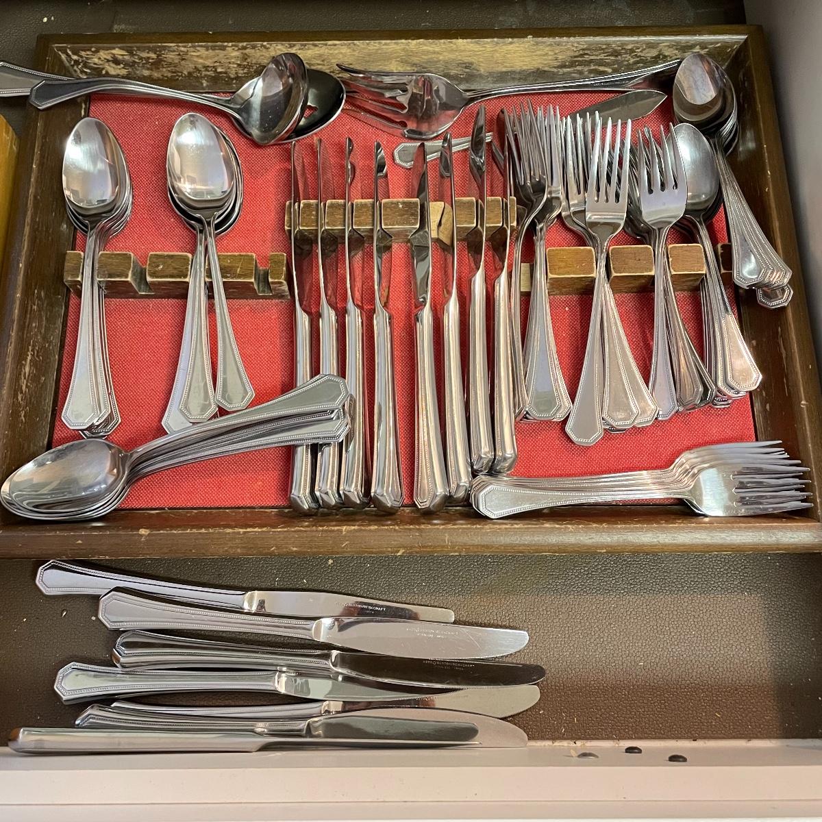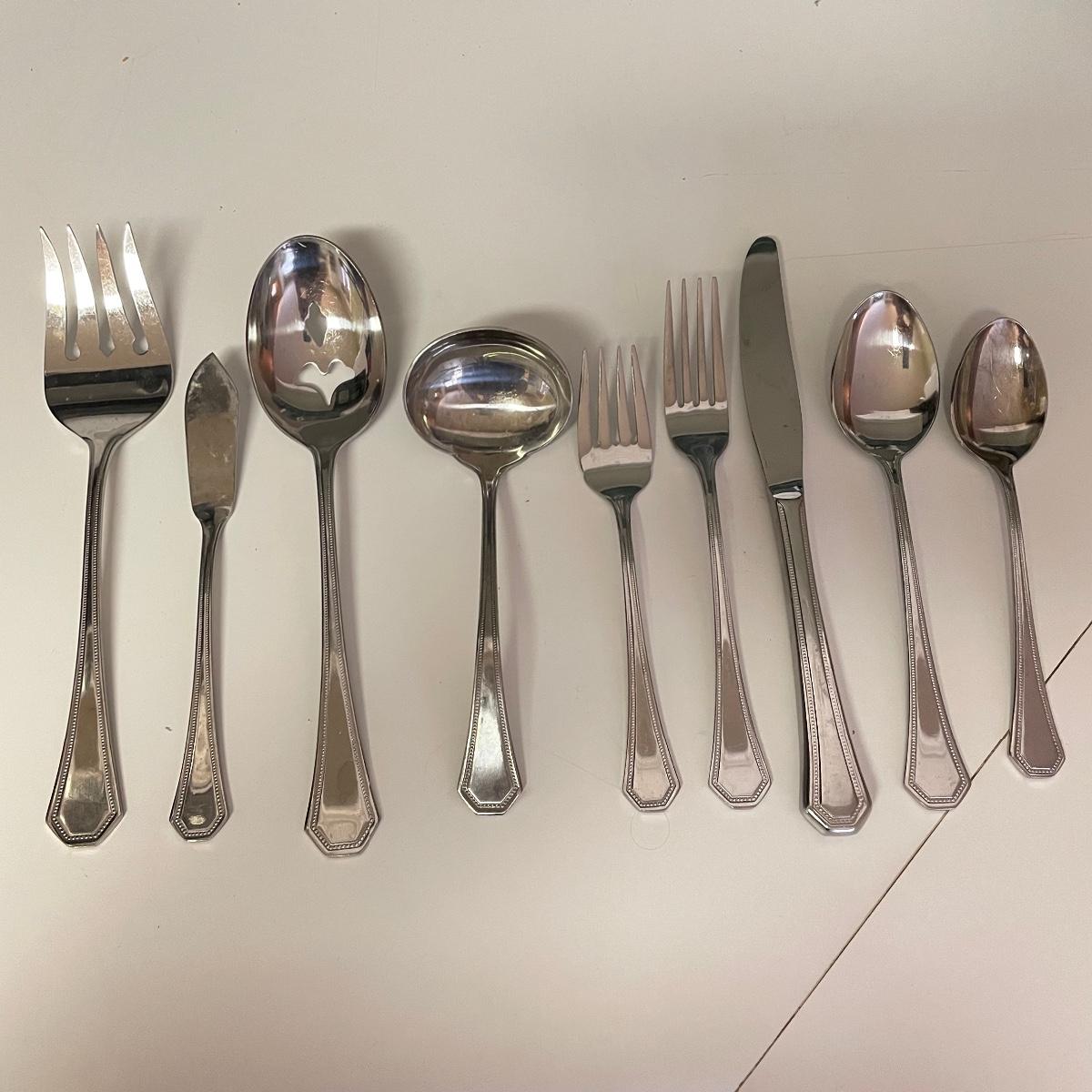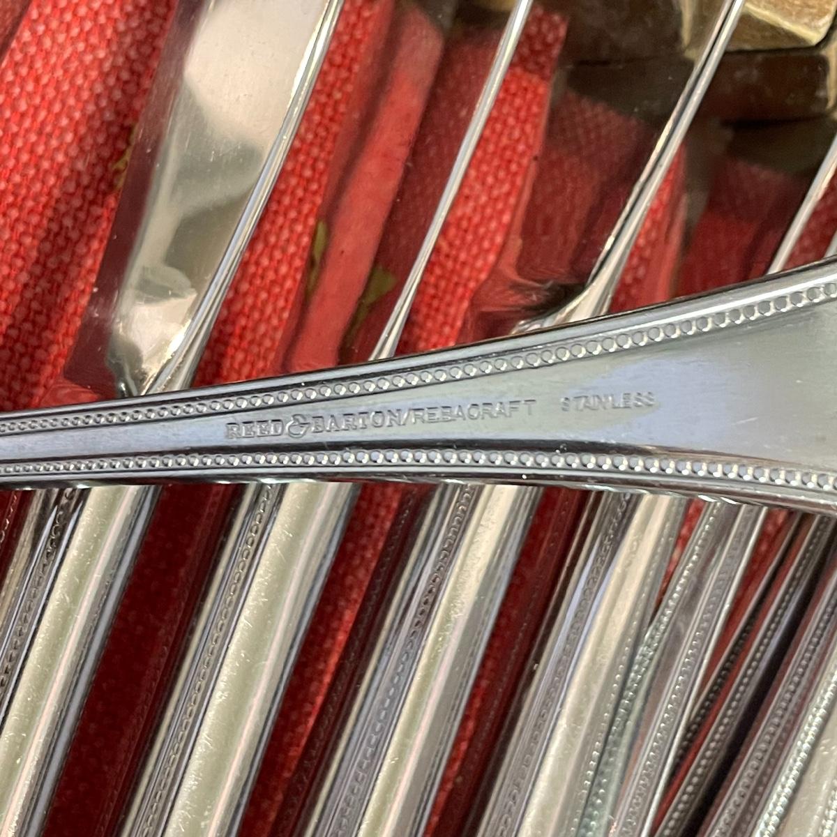 Stainless Reed & Barton flatware 15 dinner knives, 11 entree forks, 14 salad forks, 16 soup spoons, 14 coffee spoons, plus five serving utensils. See images. Shipping available.