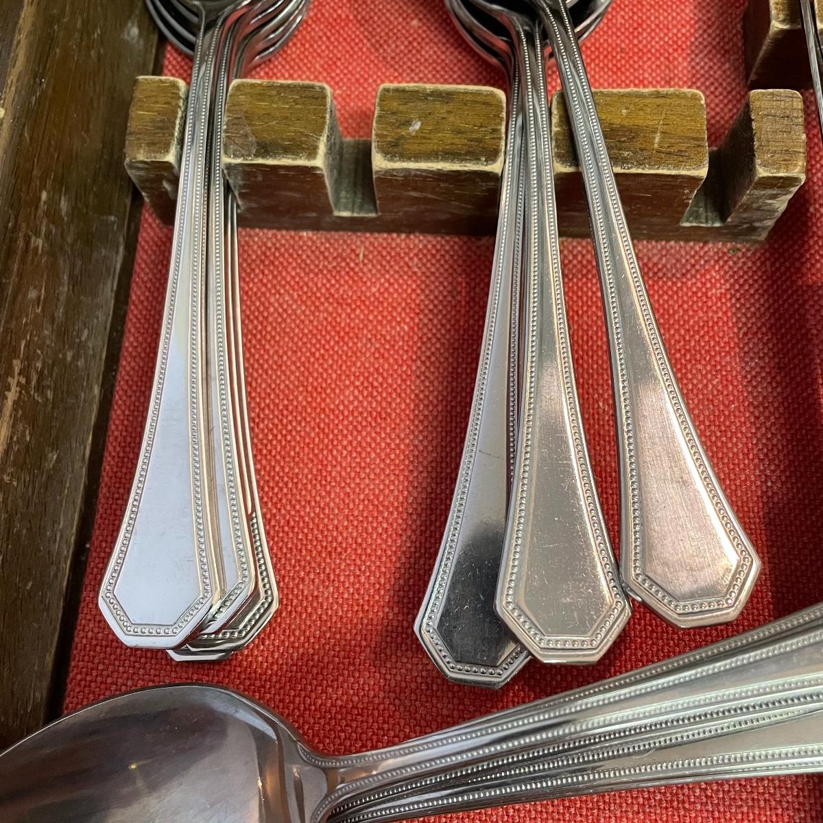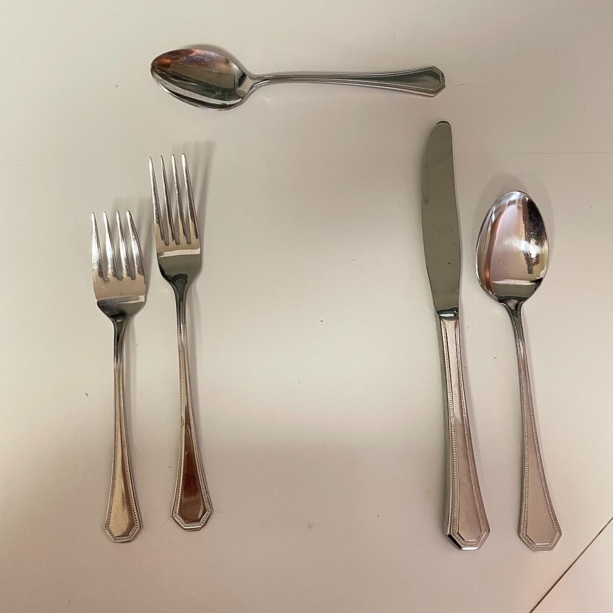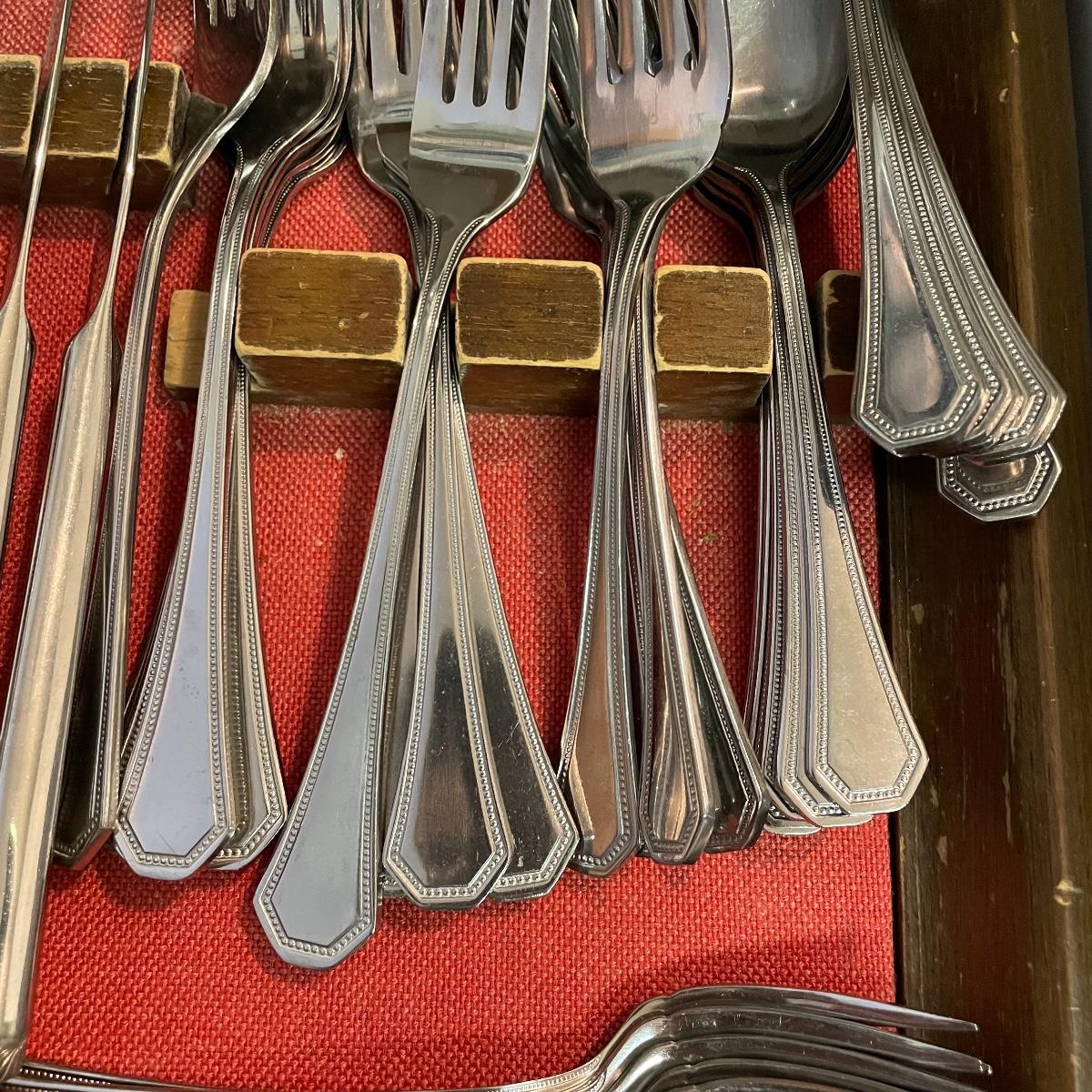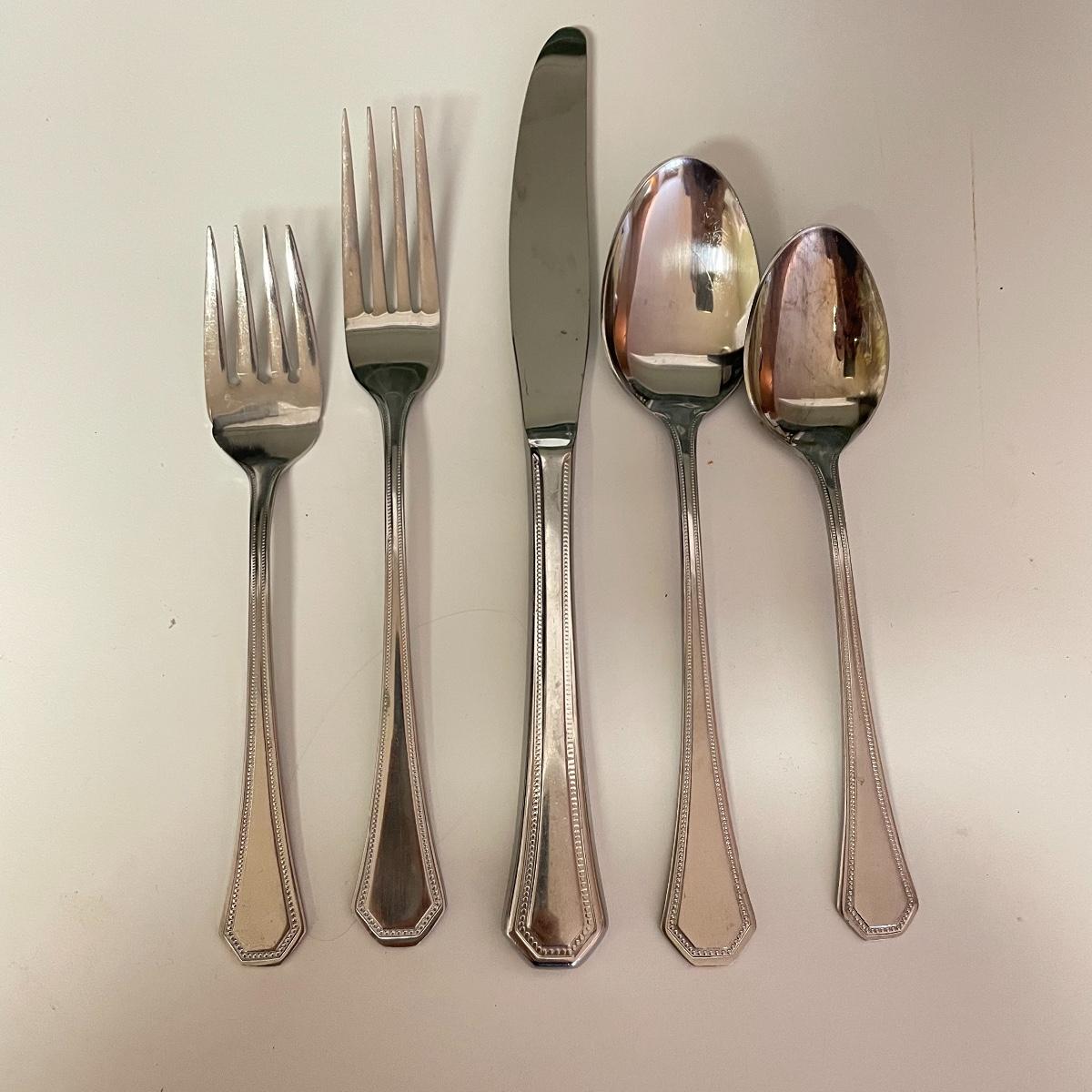Stainless Reed & Barton flatware 15 dinner knives, 11 entree forks, 14 salad forks, 16 soup spoons, 14 coffee spoons, plus five serving utensils. See images. Shipping available.