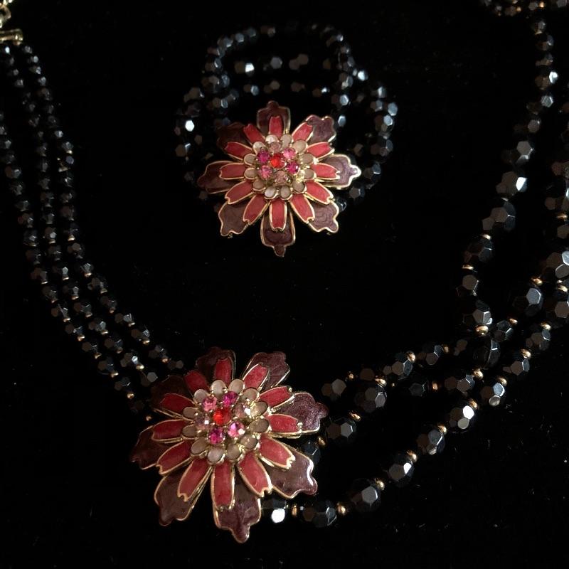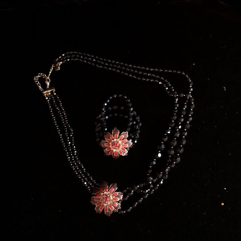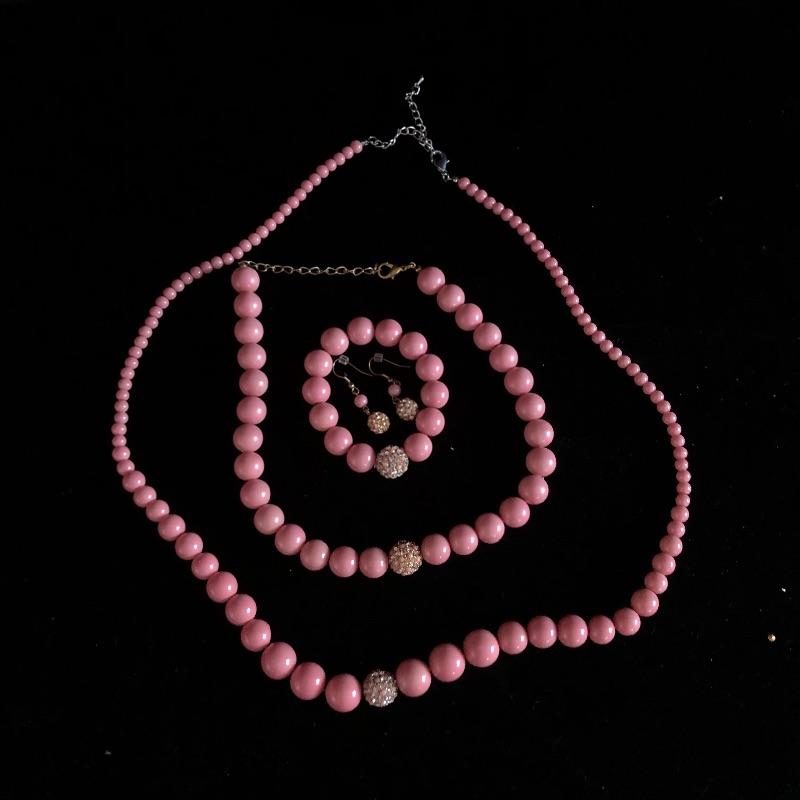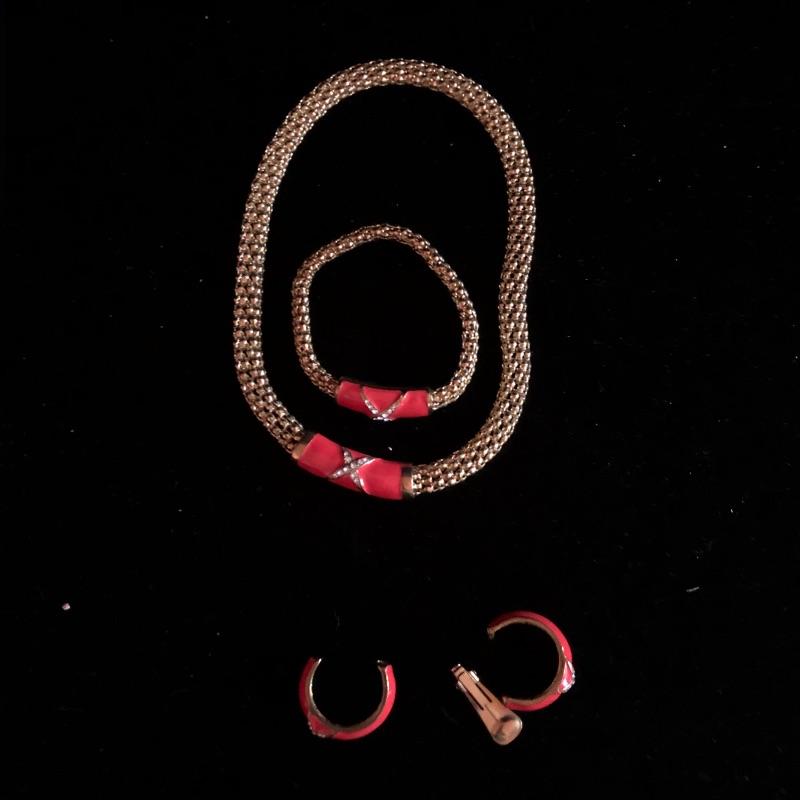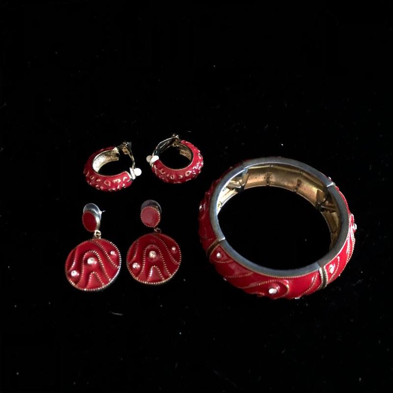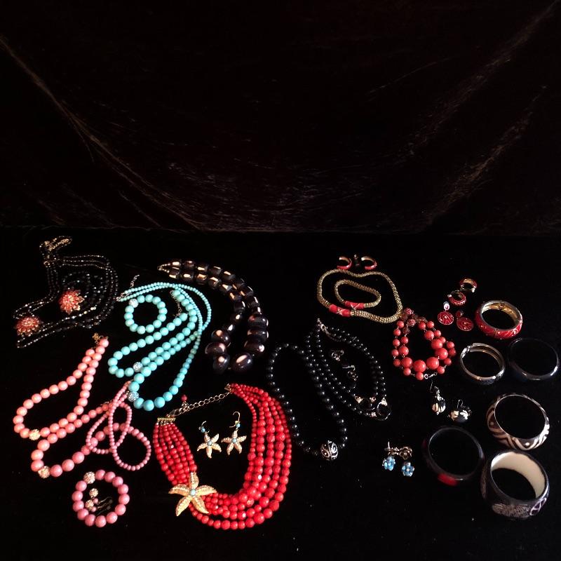 This lot has so many beautiful pieces! It comes with eight different sets - including items from earrings to necklaces to bracelets - as well as ten miscellaneous pieces. The miscellaneous pieces include five chunky bracelets, three necklaces, and a pair of earrings. A red/orange pair of the clip-on earrings are missing the backs (see pictures). Shipping available.