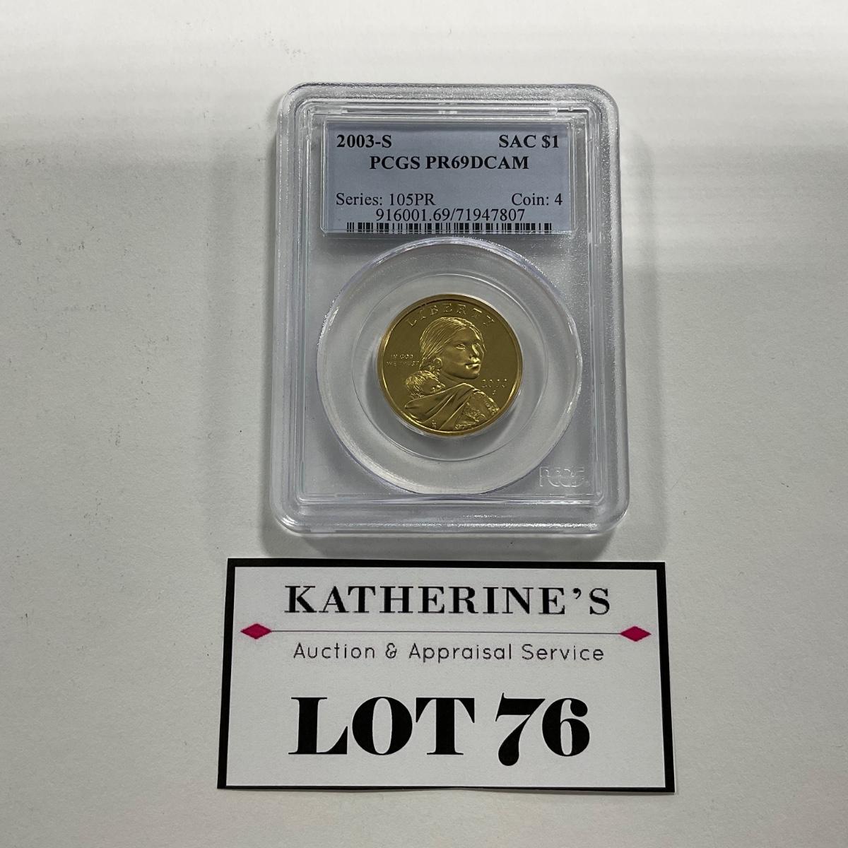 One graded 2003-S SAC dollar PCGS PR69 DCAM coin. Please see photos for details and condition. ::: Shipping is available on this lot. If you require shipping you must let us know at the close of the auction. We will coordinate with you after the item has been won. Shipping fees will include insurance up to or exceeding the value of all items being mailed. If you have any questions regarding this lot please contact the auctioneer either via this website, by direct email or by phone. PICK UP TIMES and other important information can be found in the TERMS and DESCRIPTION of the auction. Please take a look for pertinent information. Thanks!