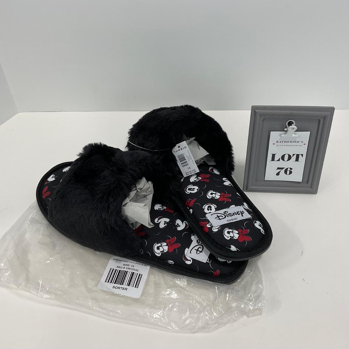 One pair of Torrid new with tags Disney Faux fur slipper slides size 12. Brand new great shape. Please see photos for details and condition. Any condition statement is given as a courtesy to a client, is an opinion, and should not be treated as a statement of fact. Reference to condition written, oral or within a condition report shall not be regarded as a full account of condition and may not include all defects, alterations, or restorations. Absence of a condition report does not imply a lot is flawless or lacking imperfections or damage. Katherine’s Auction & Appraisal Service shall have no responsibility for any error or omission. Returns shall not be accepted on the basis of condition. ::: Shipping is available on this lot. If you require shipping you must let us know at the close of the auction. We will coordinate with you after the item has been won. Shipping fees will include insurance up to or exceeding the value of all items being mailed. If you have any questions regarding this lot please contact the auctioneer either via this website, by direct email or by phone. PICK UP TIMES and other important information can be found in the TERMS and DESCRIPTION of the auction. Please take a look for pertinent information. Thanks!