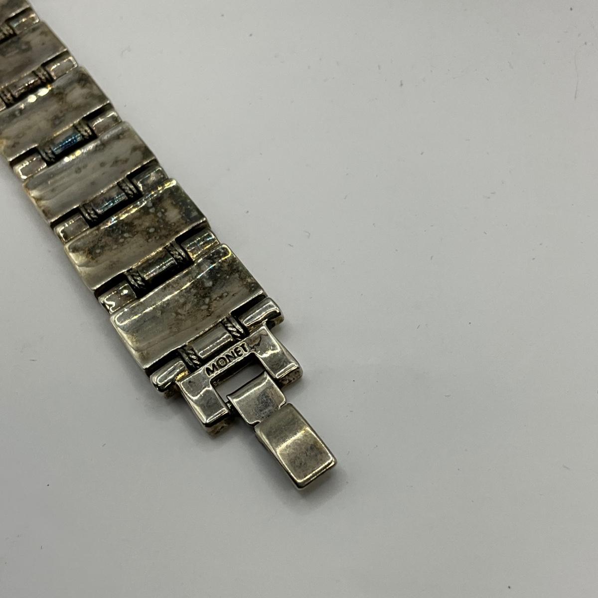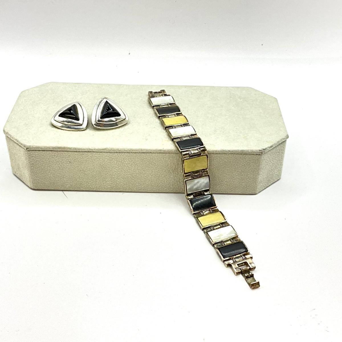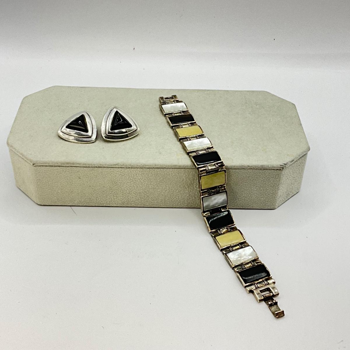 760 Black , White , Silvertone Bracelet with Sterling Onyx Pierced Earrings