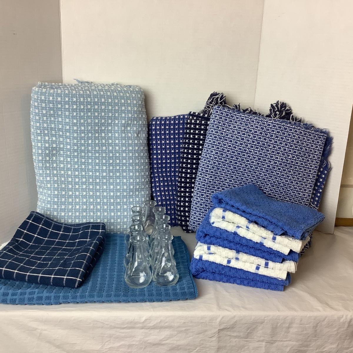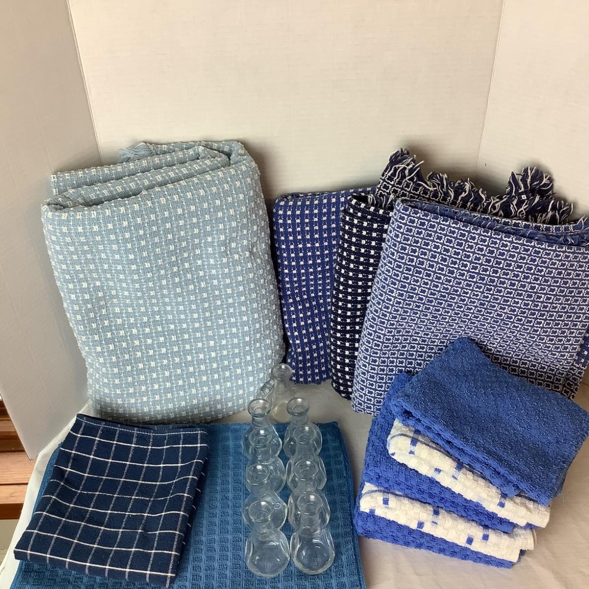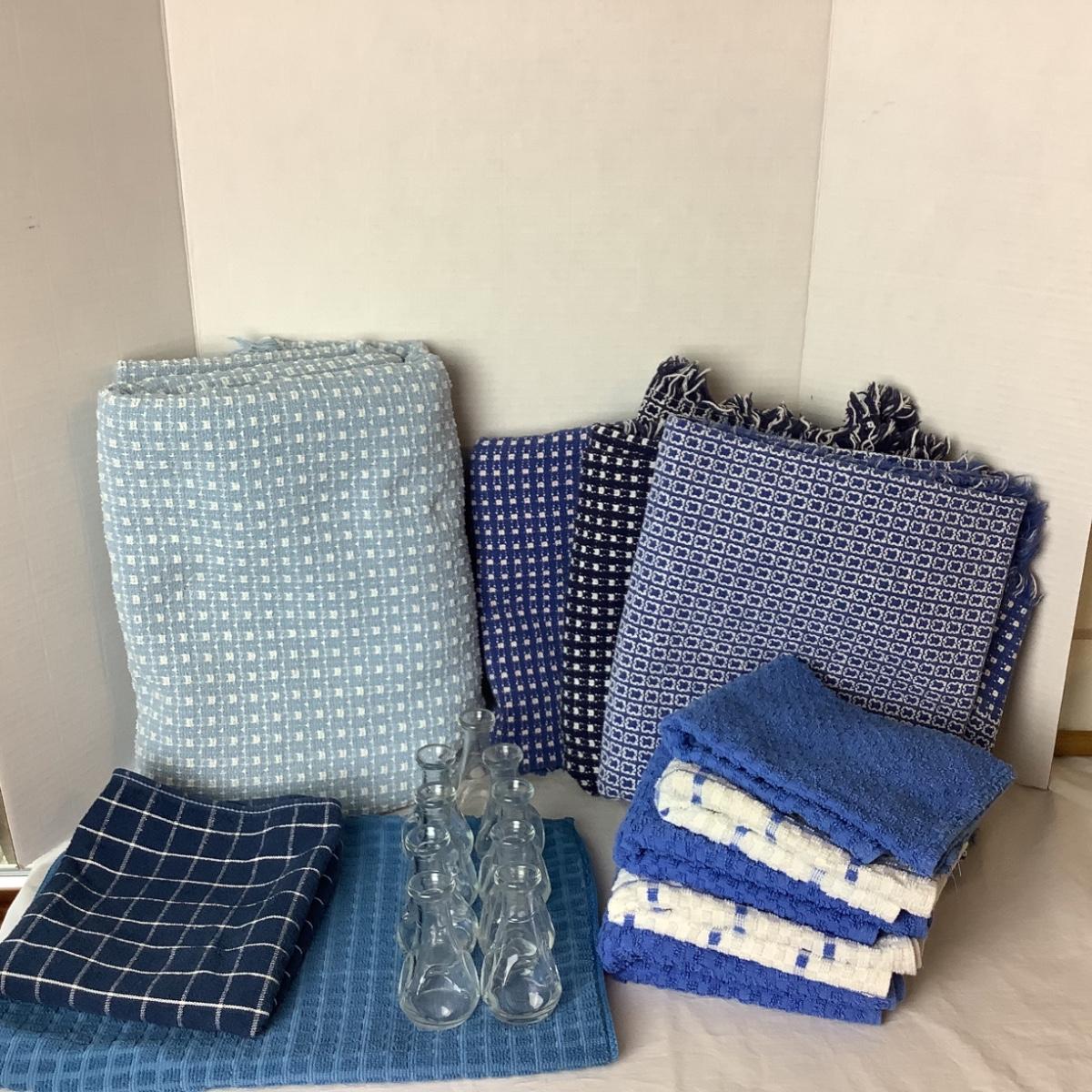 763 Lot of Vintage Blue and White Tablecloths with 9 Small Glass Bud vases
