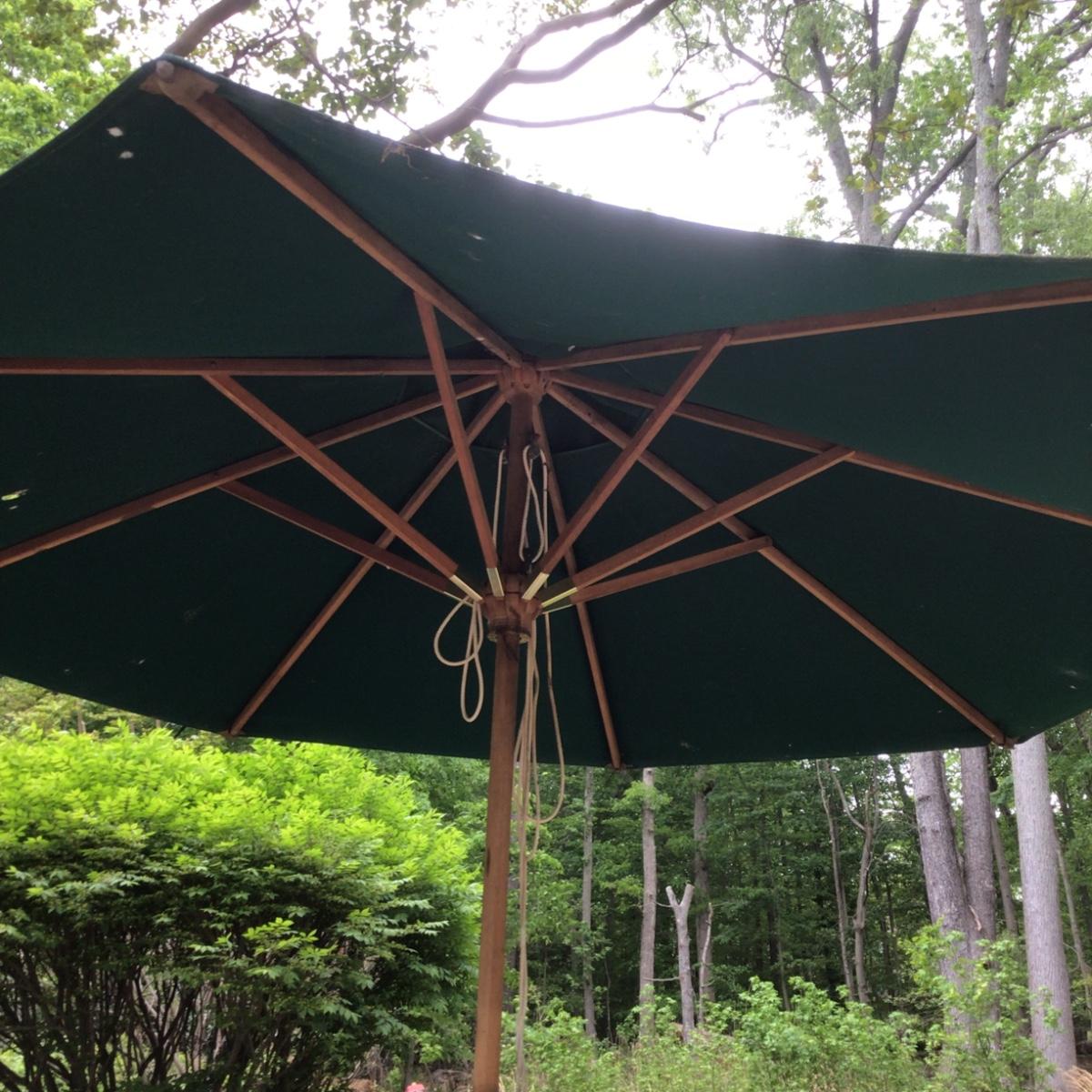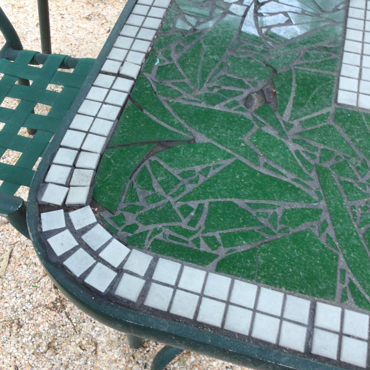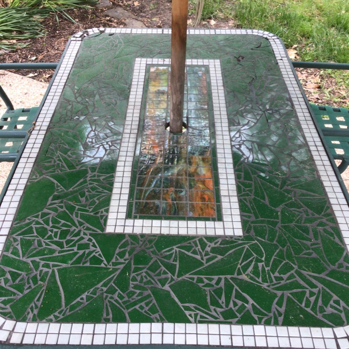 Some of the mosaic tiles have come loose with green umbrella and metal stand