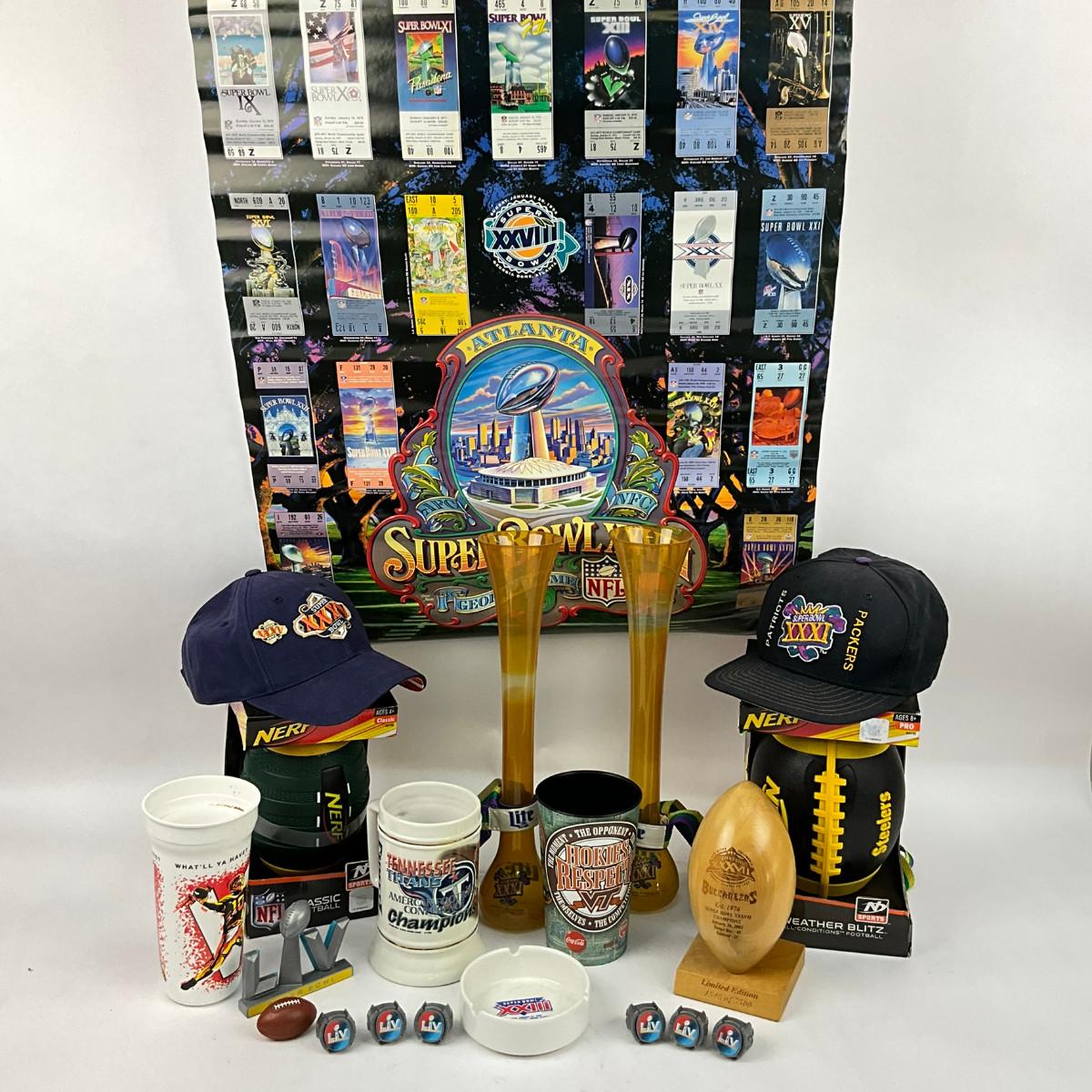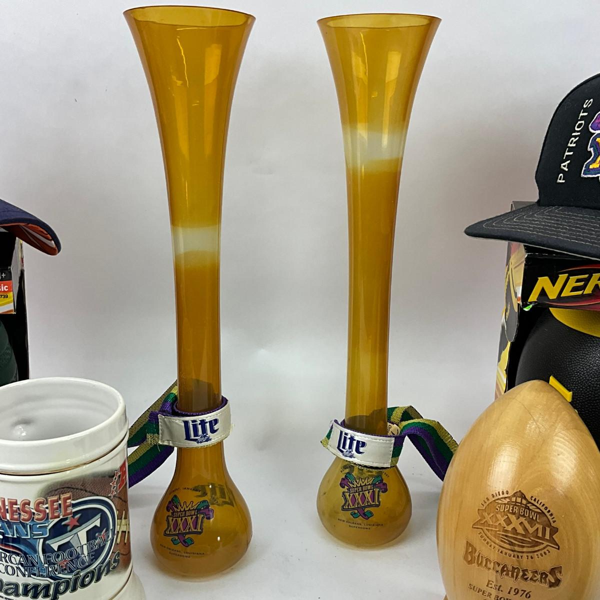 Two Nerf footballs, two vintage lite beer mugs, wooden super bowl XXXVII 2003 limited edition 1546 of 7500, two cups, 1 mug