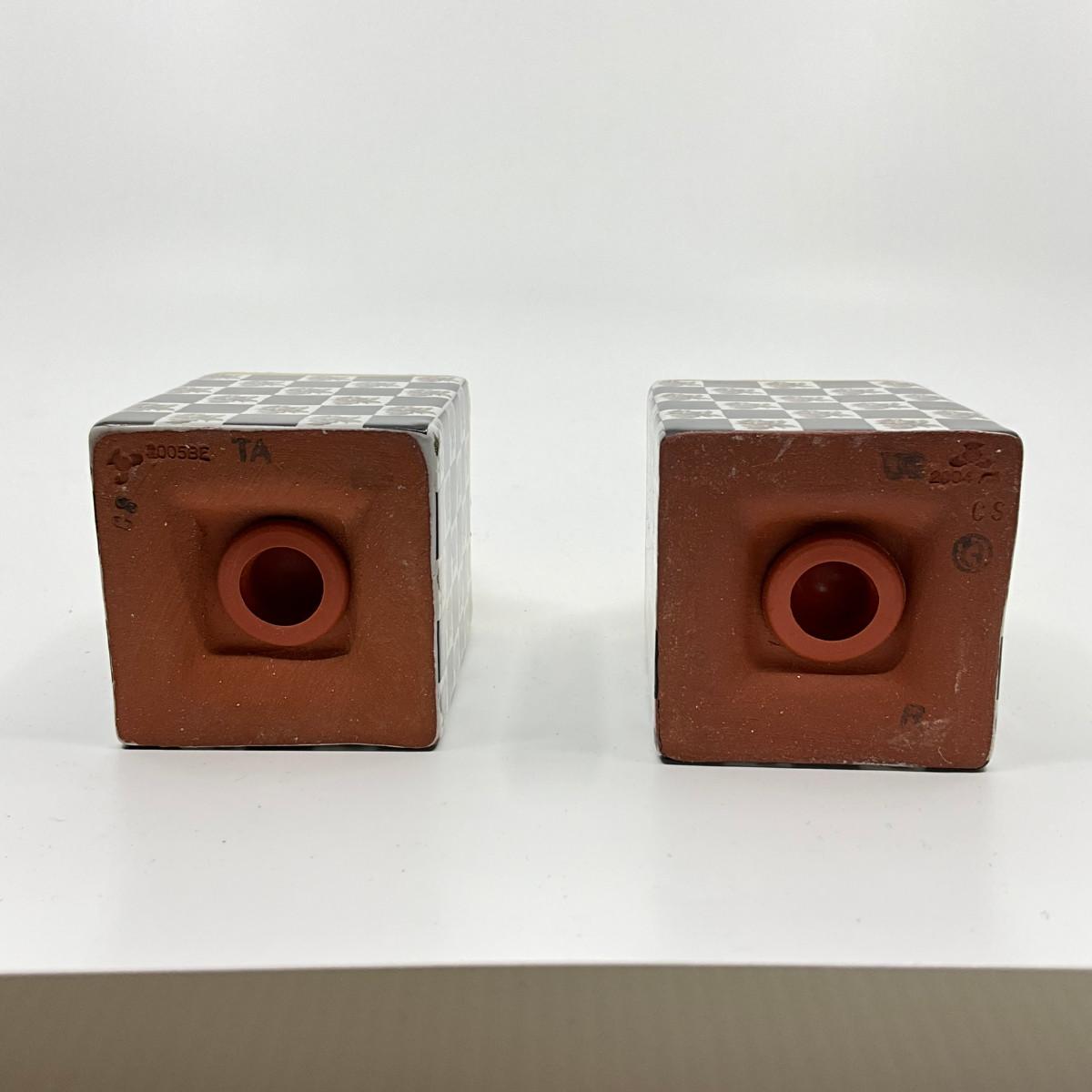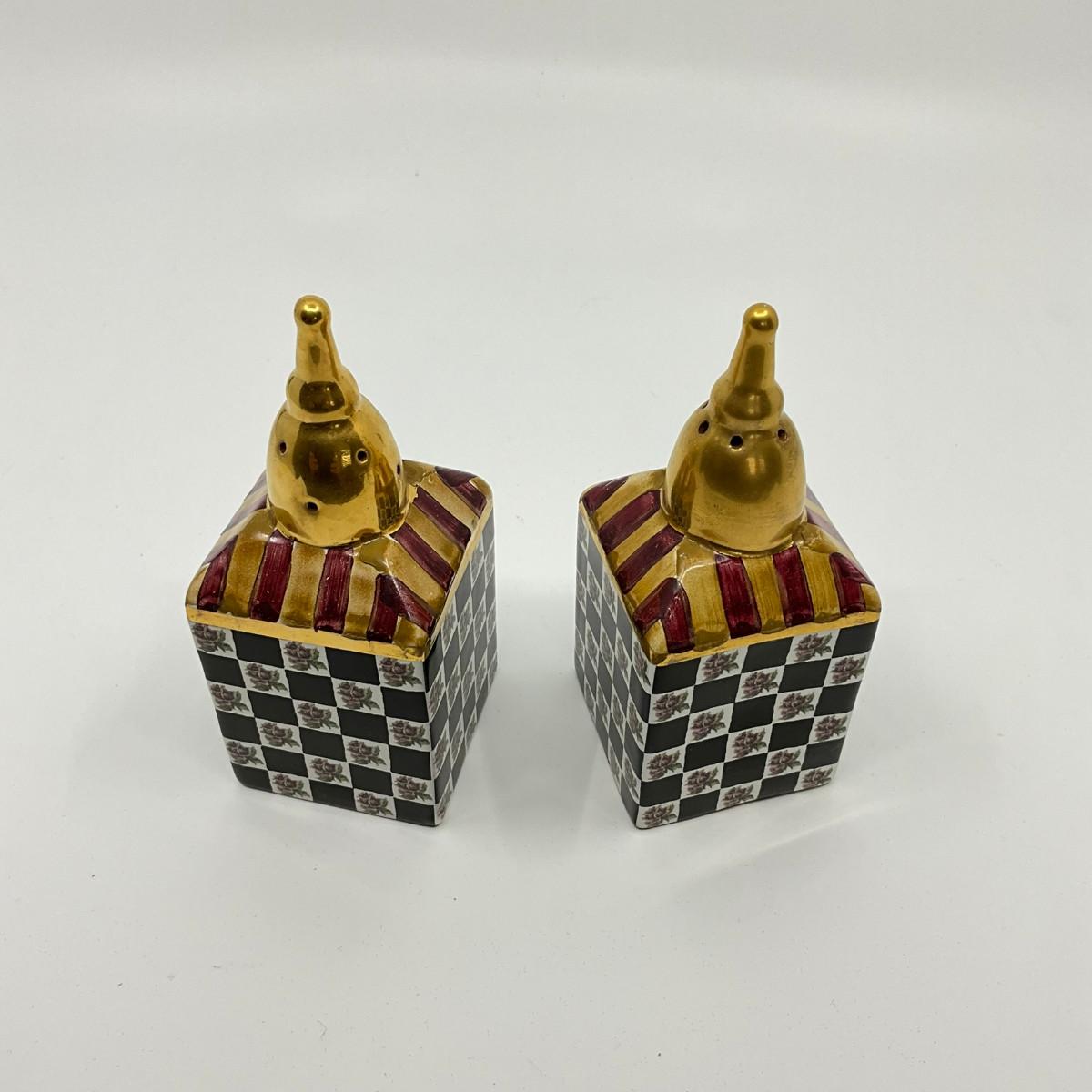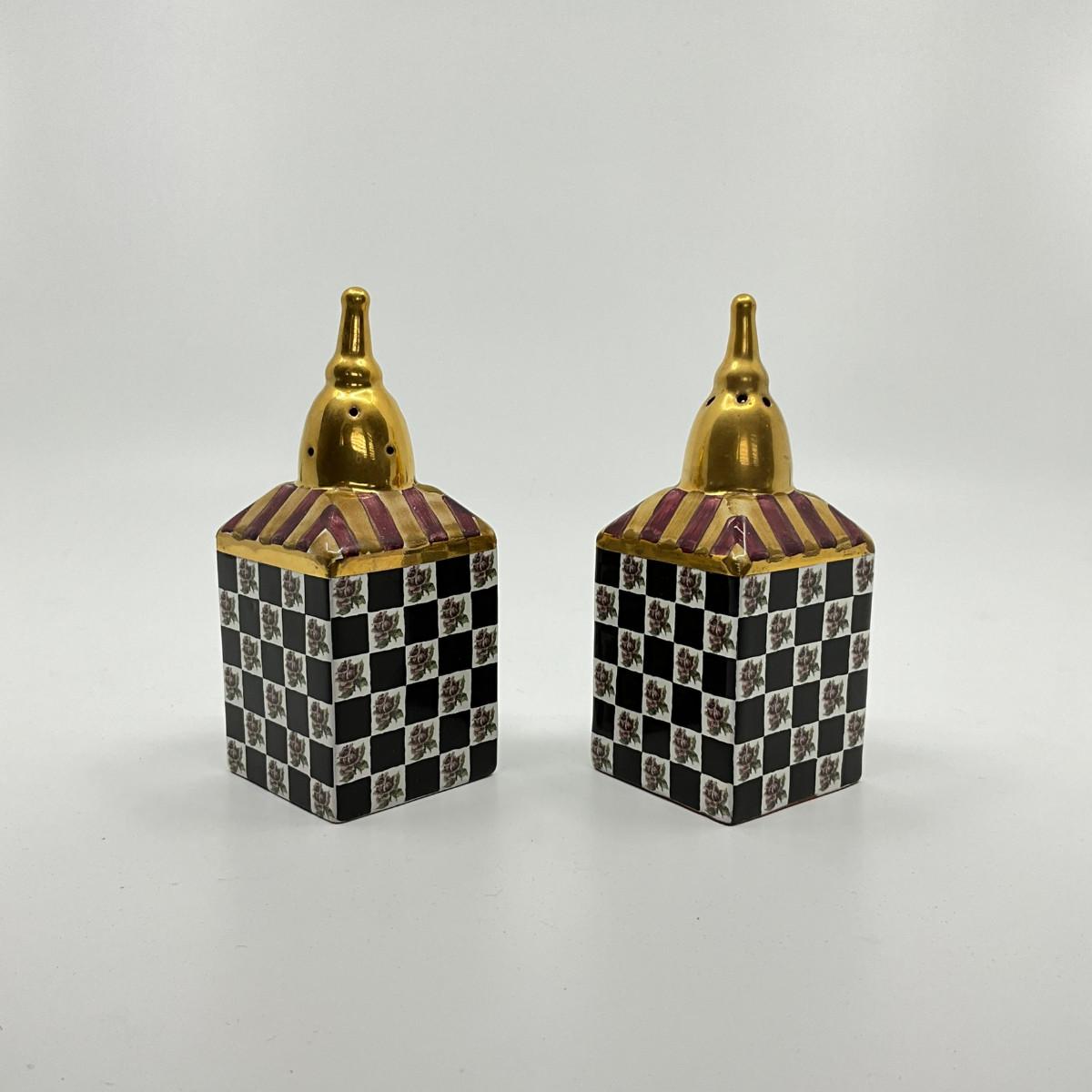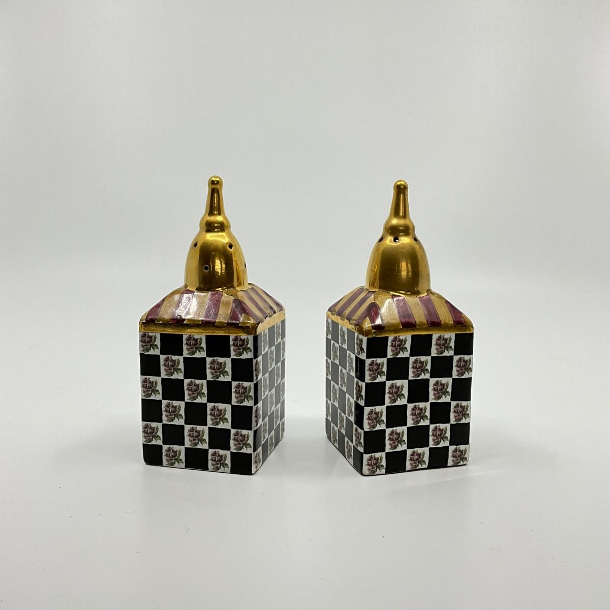 Has a black and white checker board design with flowers occupying the white spaces. Additionally, each shaker has a gold & dark purple design at the top