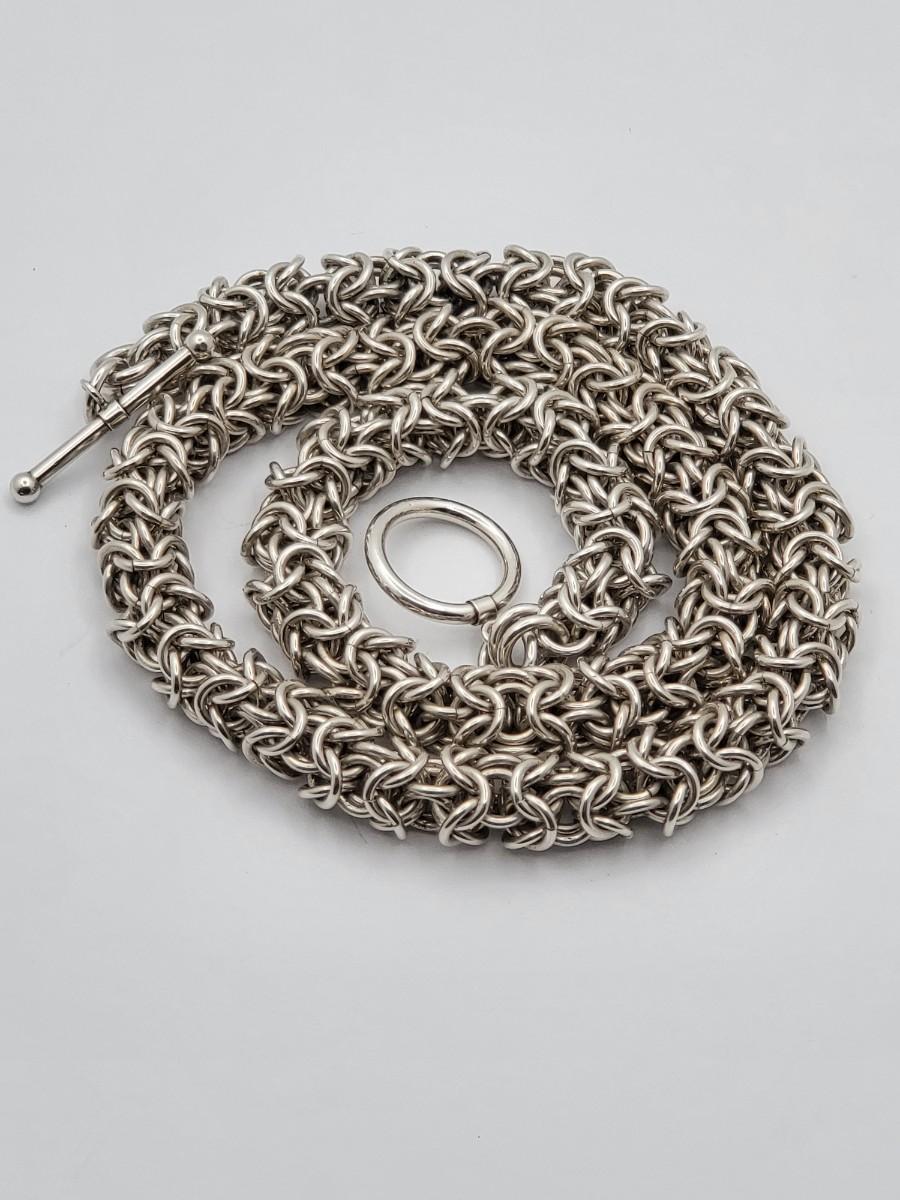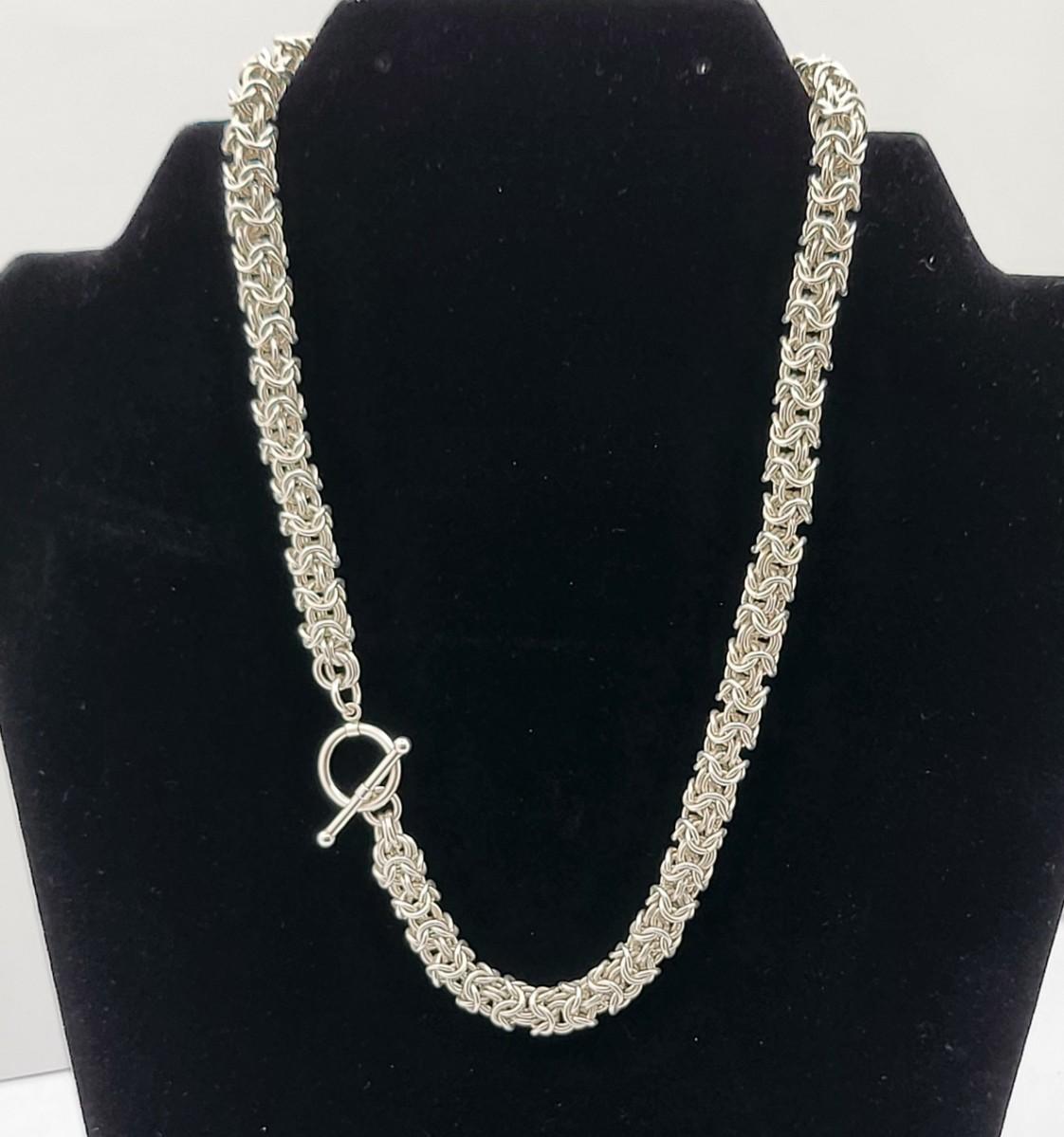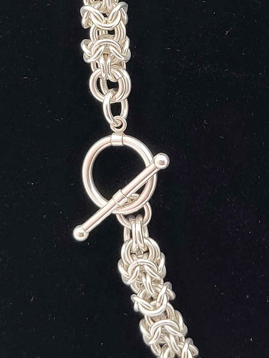 High quality, hand made, Byzantine chain 5mm with toggle clasp. Measures 17" long. Weighs 76.7 grams.
