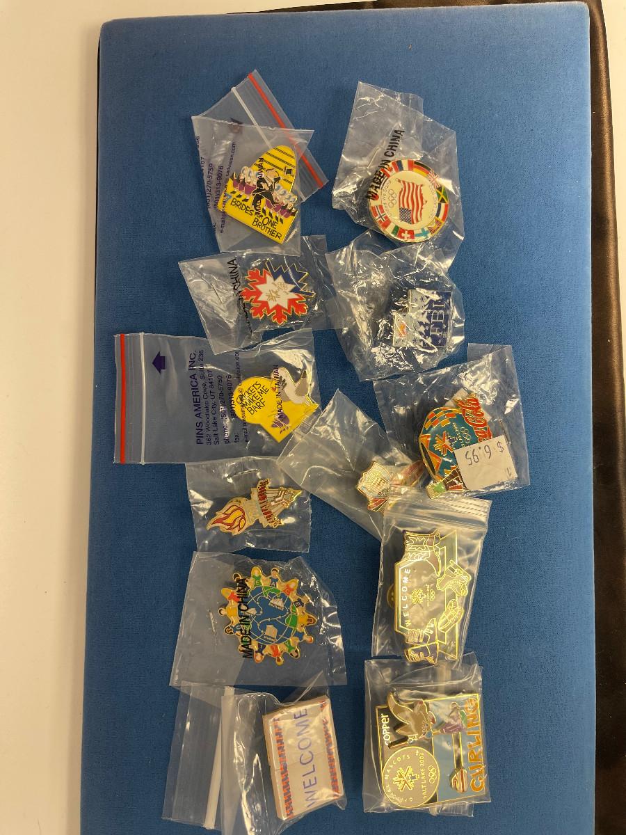 #77 12 Various Pins: FBI, Torch, Curling with Copper Mascot.