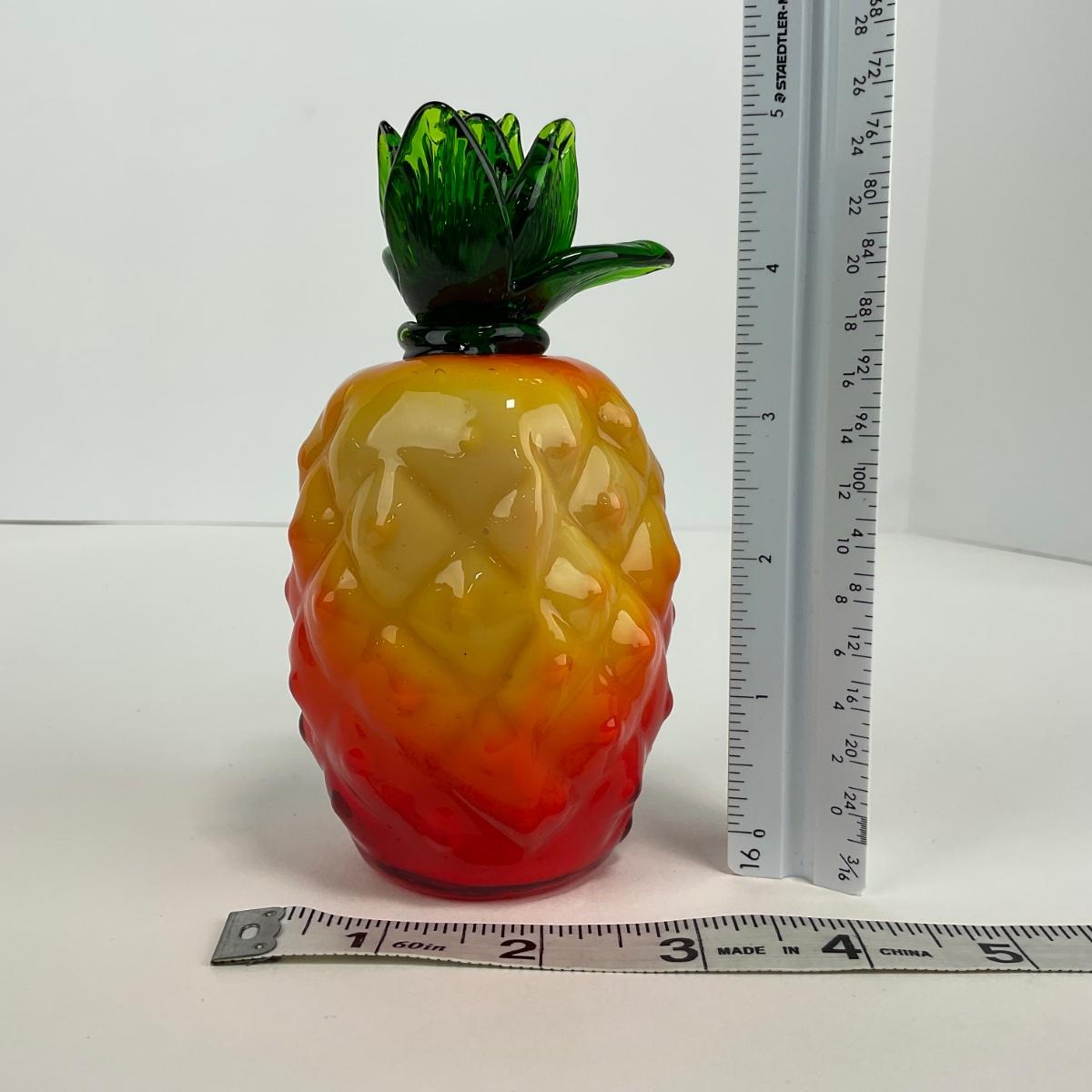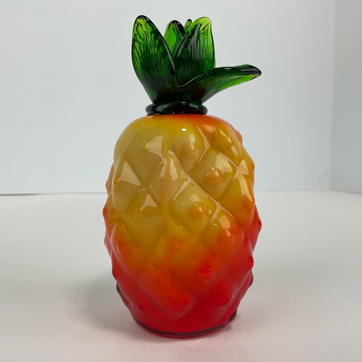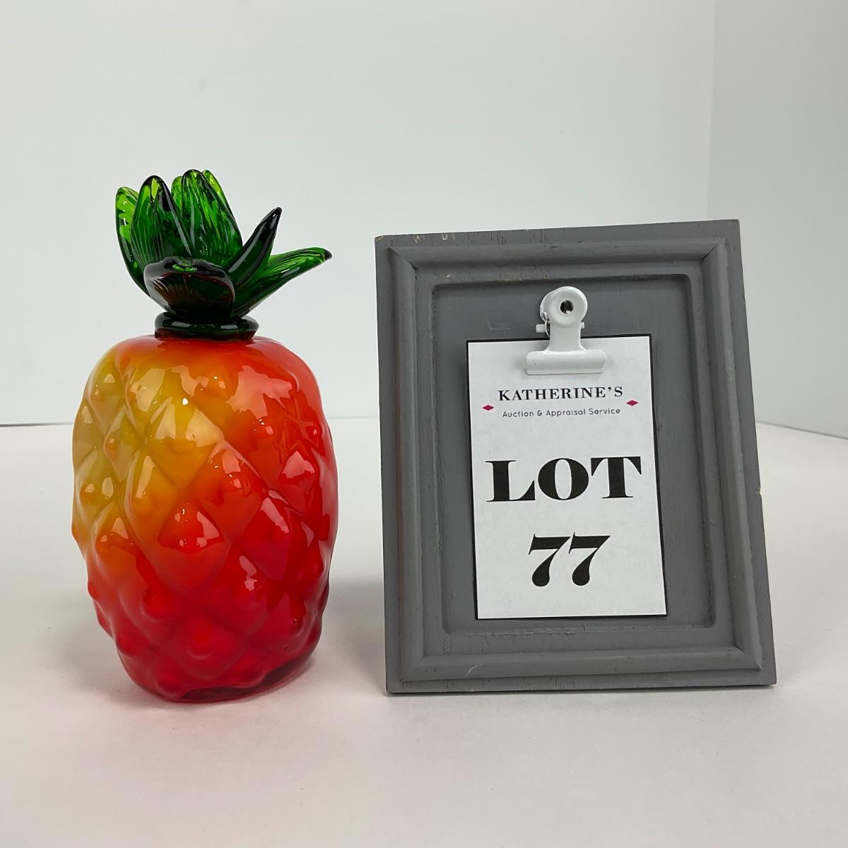 One vintage art glass colorful pineapple figure. This piece has no damage, and appears to be in great shape with no visable chips, cracks, or broken pieces. Please see photos for details and condition. Any condition statement is given as a courtesy to a client, is an opinion, and should not be treated as a statement of fact. Reference to condition written, oral or within a condition report shall not be regarded as a full account of condition and may not include all defects, alterations, or restorations. Absence of a condition report does not imply a lot is flawless or lacking imperfections or damage. Katherine’s Auction & Appraisal Service shall have no responsibility for any error or omission. Returns shall not be accepted on the basis of condition. ::: Shipping is available on this lot. If you require shipping you must let us know at the close of the auction. We will coordinate with you after the item has been won. Shipping fees will include insurance up to or exceeding the value of all items being mailed. If you have any questions regarding this lot please contact the auctioneer either via this website, by direct email or by phone. PICK UP TIMES and other important information can be found in the TERMS and DESCRIPTION of the auction. Please take a look for pertinent information. Thanks!