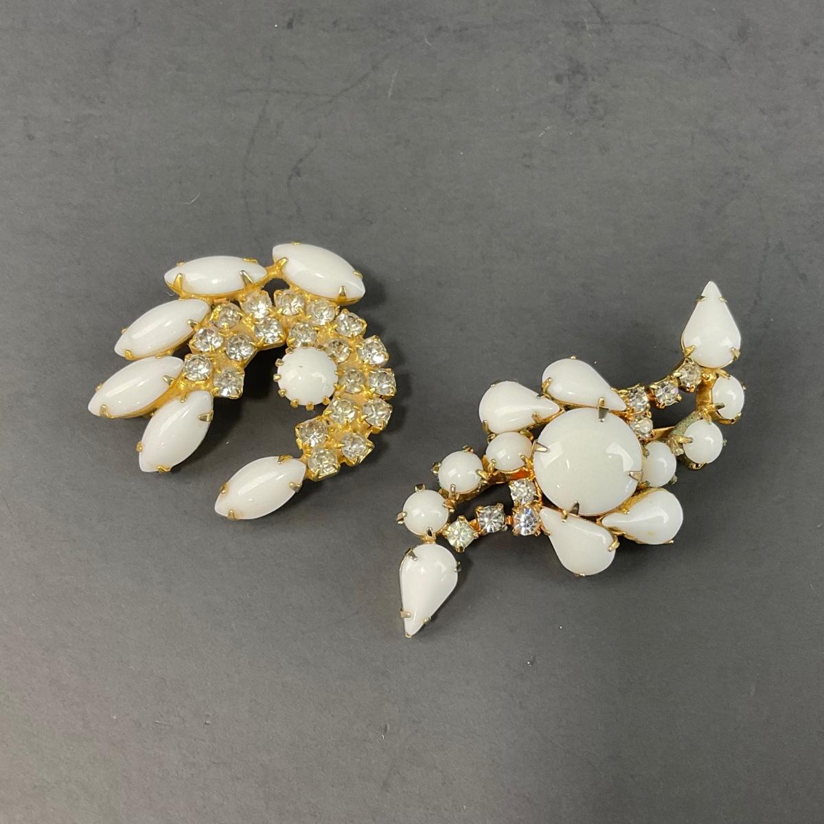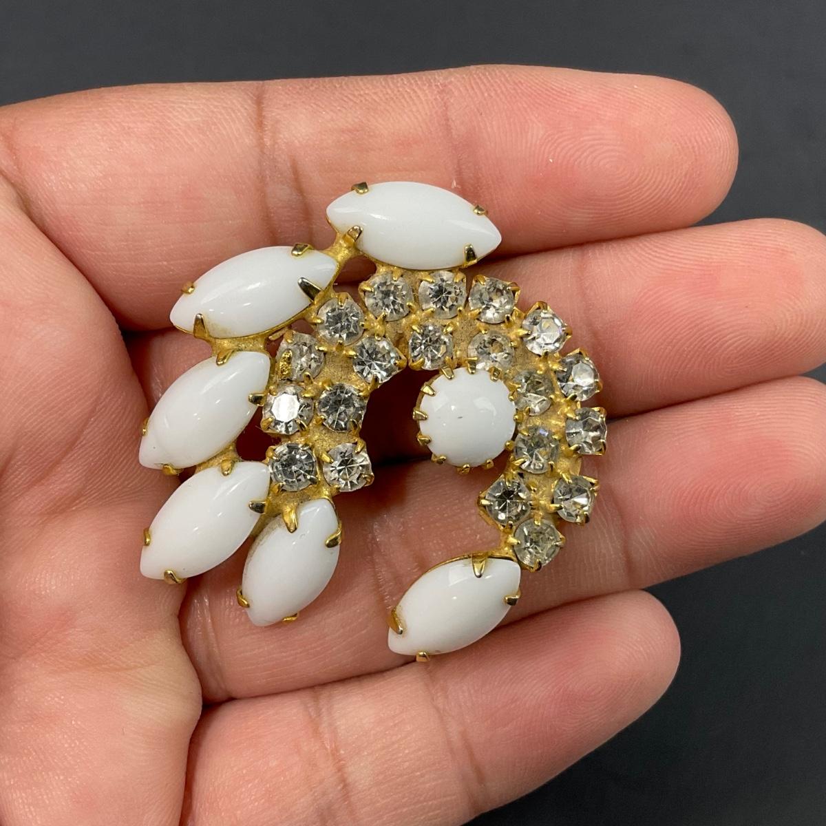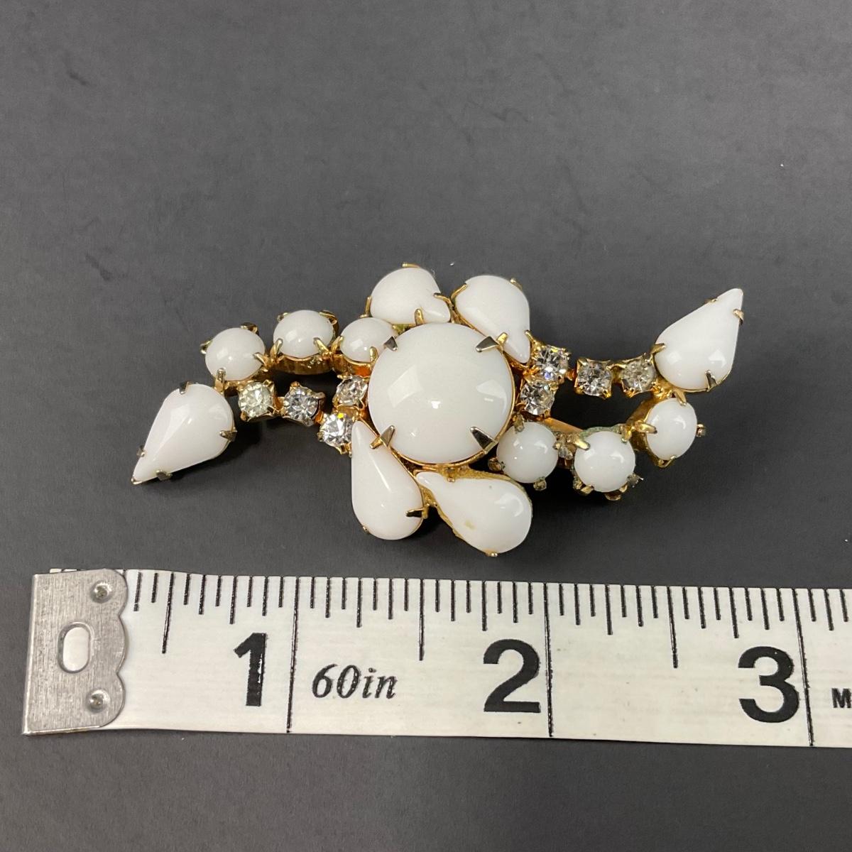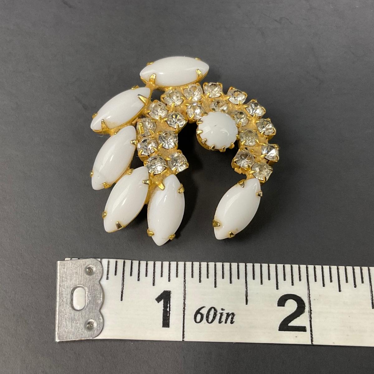 Two vintage milk glass brooches. This piece has no damage, and appears to be in great shape with no visable chips, cracks, or broken pieces. Please see photos for details and condition. Any condition statement is given as a courtesy to a client, is an opinion, and should not be treated as a statement of fact. Reference to condition written, oral or within a condition report shall not be regarded as a full account of condition and may not include all defects, alterations, or restorations. Absence of a condition report does not imply a lot is flawless or lacking imperfections or damage. Katherine’s Auction & Appraisal Service shall have no responsibility for any error or omission. Returns shall not be accepted on the basis of condition. ::: Shipping is available on this lot. If you require shipping you must let us know at the close of the auction. We will coordinate with you after the item has been won. Shipping fees will include insurance up to or exceeding the value of all items being mailed. If you have any questions regarding this lot please contact the auctioneer either via this website, by direct email or by phone. PICK UP TIMES and other important information can be found in the TERMS and DESCRIPTION of the auction. Please take a look for pertinent information. Thanks!